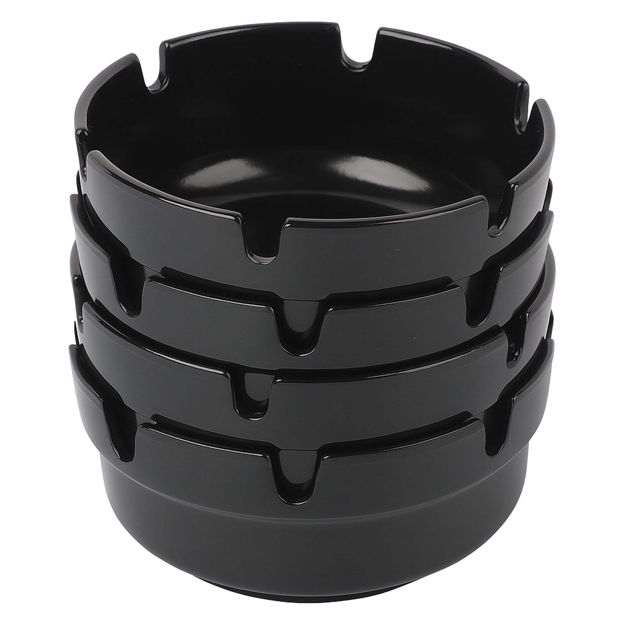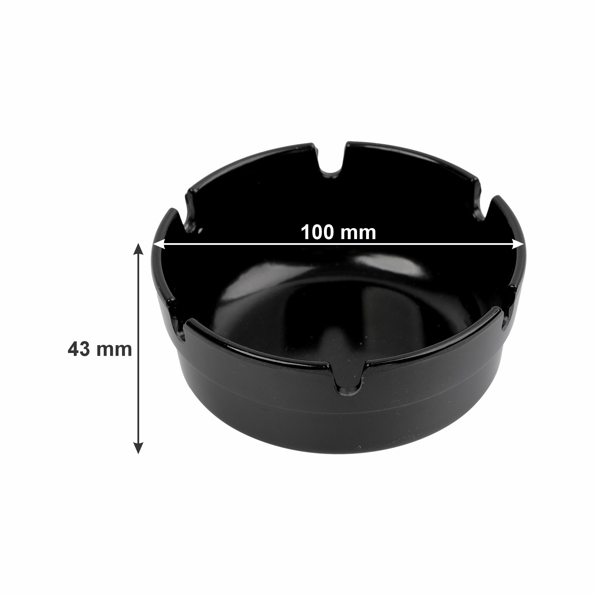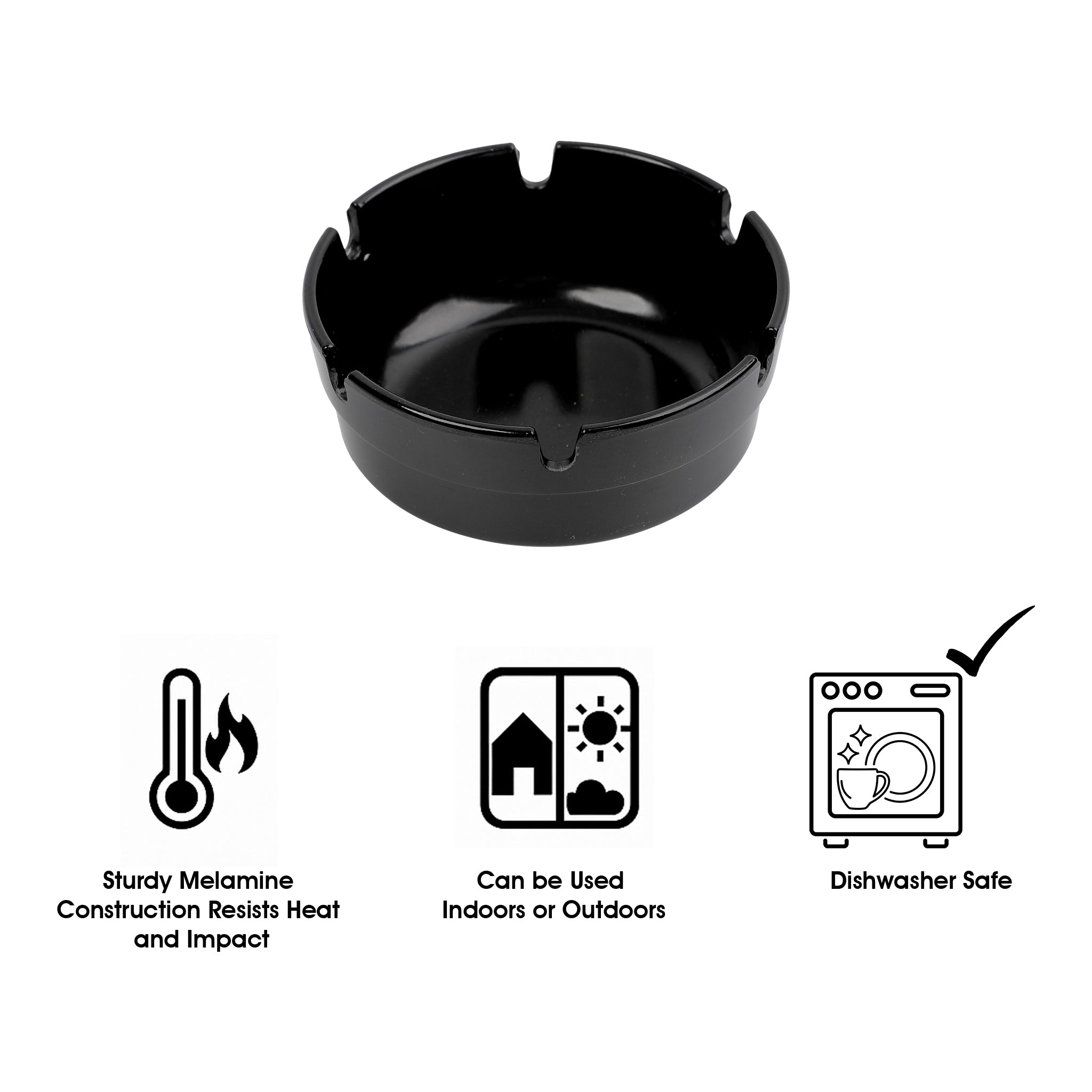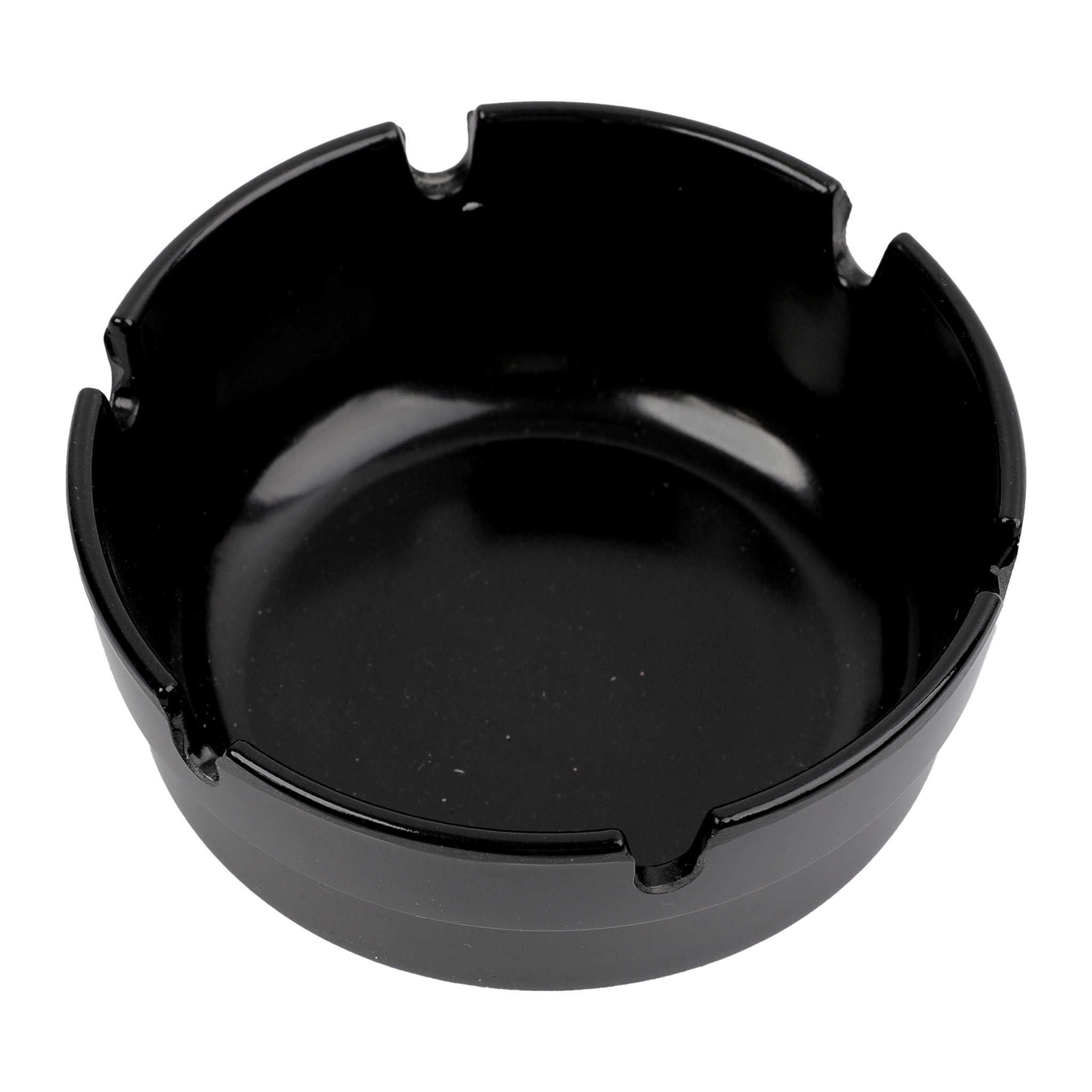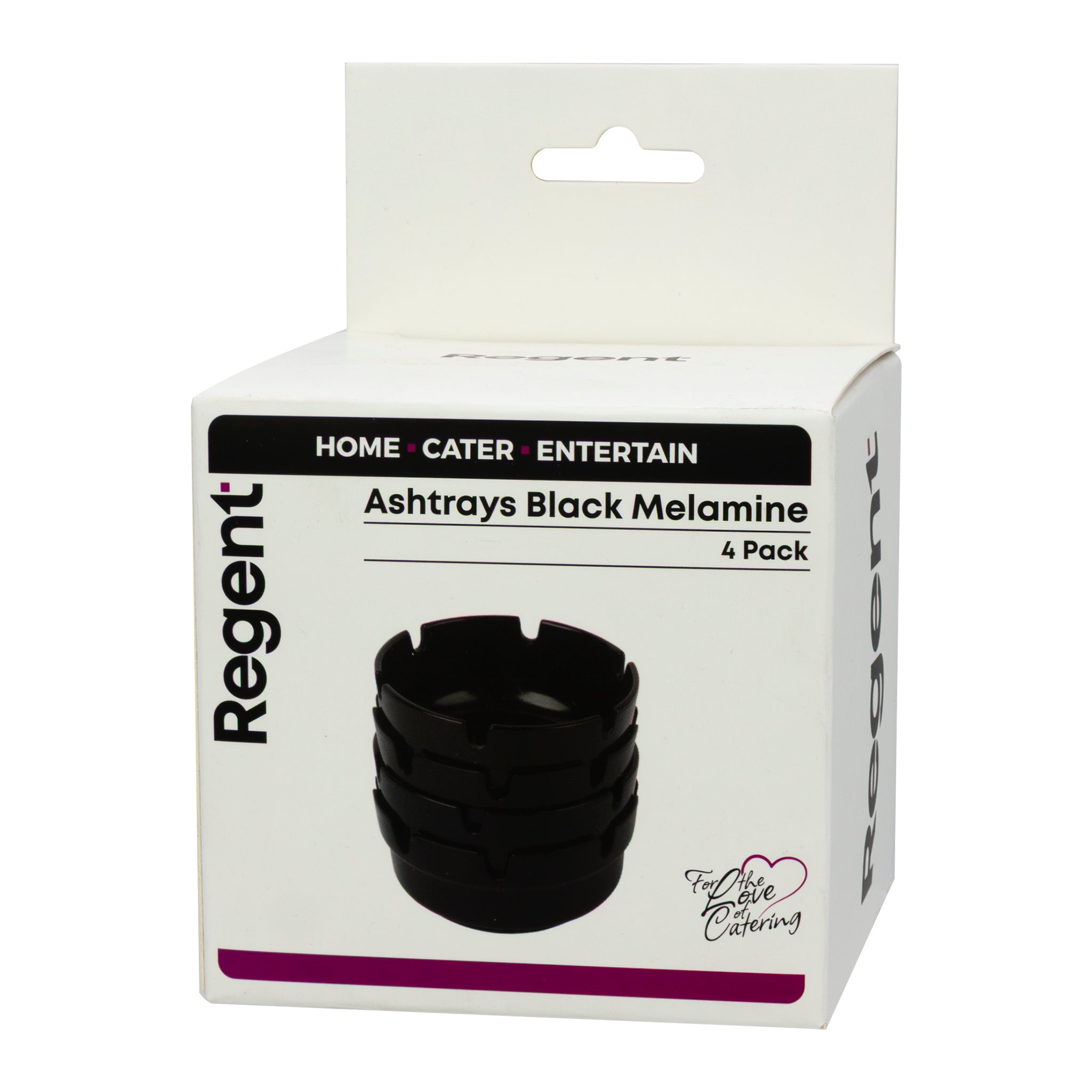 The Regent Black Ashtrays come in a versatile bulk 4 pack, each measuring 100mm in diameter and crafted from durable black melamine. Their sturdy construction resists heat and impact, making them suitable for both indoor and outdoor use. These ashtrays provide a practical and stylish solution for collecting ashes and cigarette butts,
