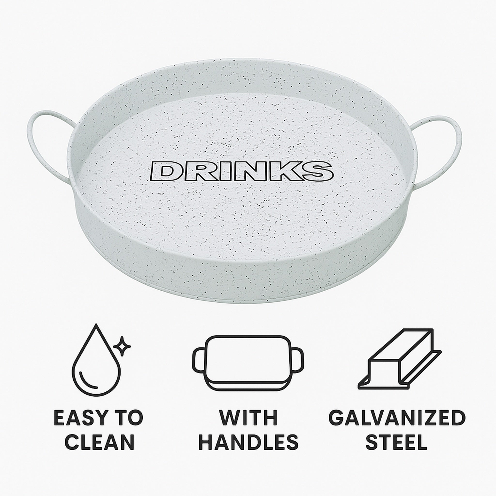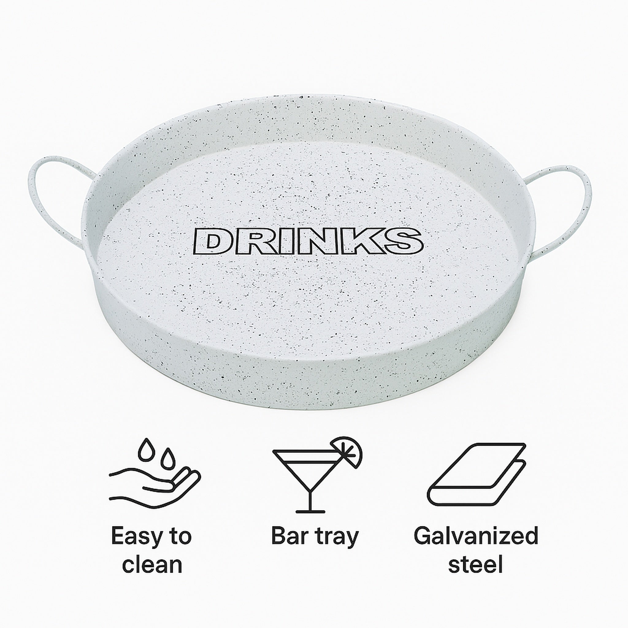 Our Bar Butler galvanized steel tray with 2 handles is powder coated white and mottled black with a 'DRINKS' print which gives it a pleasing rustic charm appearance.