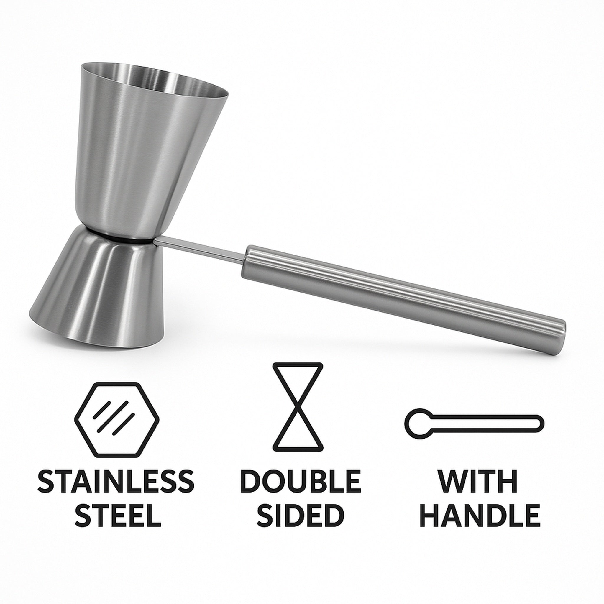 The Bar Butler Double Tot Measure with Handle offers precise 25ml and 50ml pours, making it easy to control portions and maintain consistency. Crafted from durable stainless steel, its sturdy handle ensures a secure grip for effortless pouring. Perfectly sized for both professional bartenders and home mixologists. Ideal for crafting cocktails or measuring spirits accurately, this double tot measure helps reduce waste and improve efficiency behind the bar. Upgrade your drink preparation with this reliable and user-friendly tool.