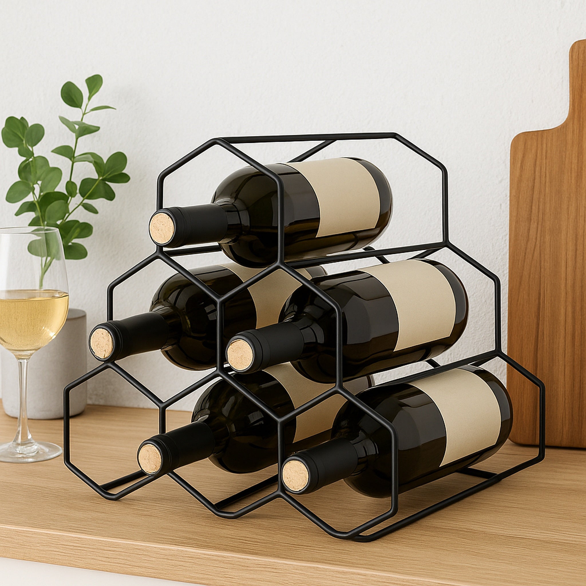 Maximize your storage space with the BAR BUTLER GEOMETRIC HEXAGON 6 BOTTLE BLACK WINE RACK. The sleek and sturdy design holds up to 6 bottles, perfect for organising and displaying your wine collection. Free standing and a space saver.