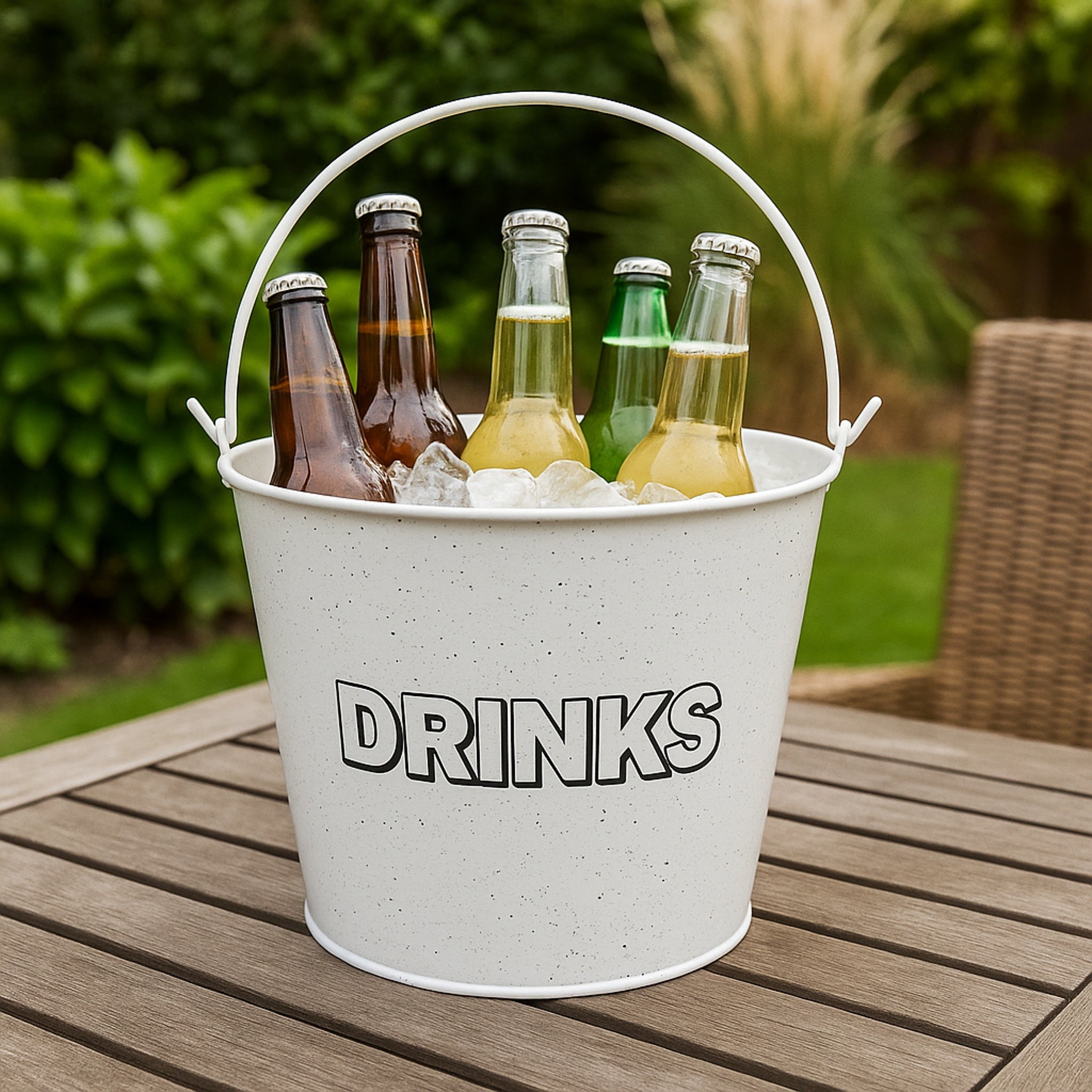Our Bar Butler galvanized steel ice bucket with an overhead handle is powder coated white and mottled black with a 'DRINKS' print which gives it a pleasing rustic charm appearance.