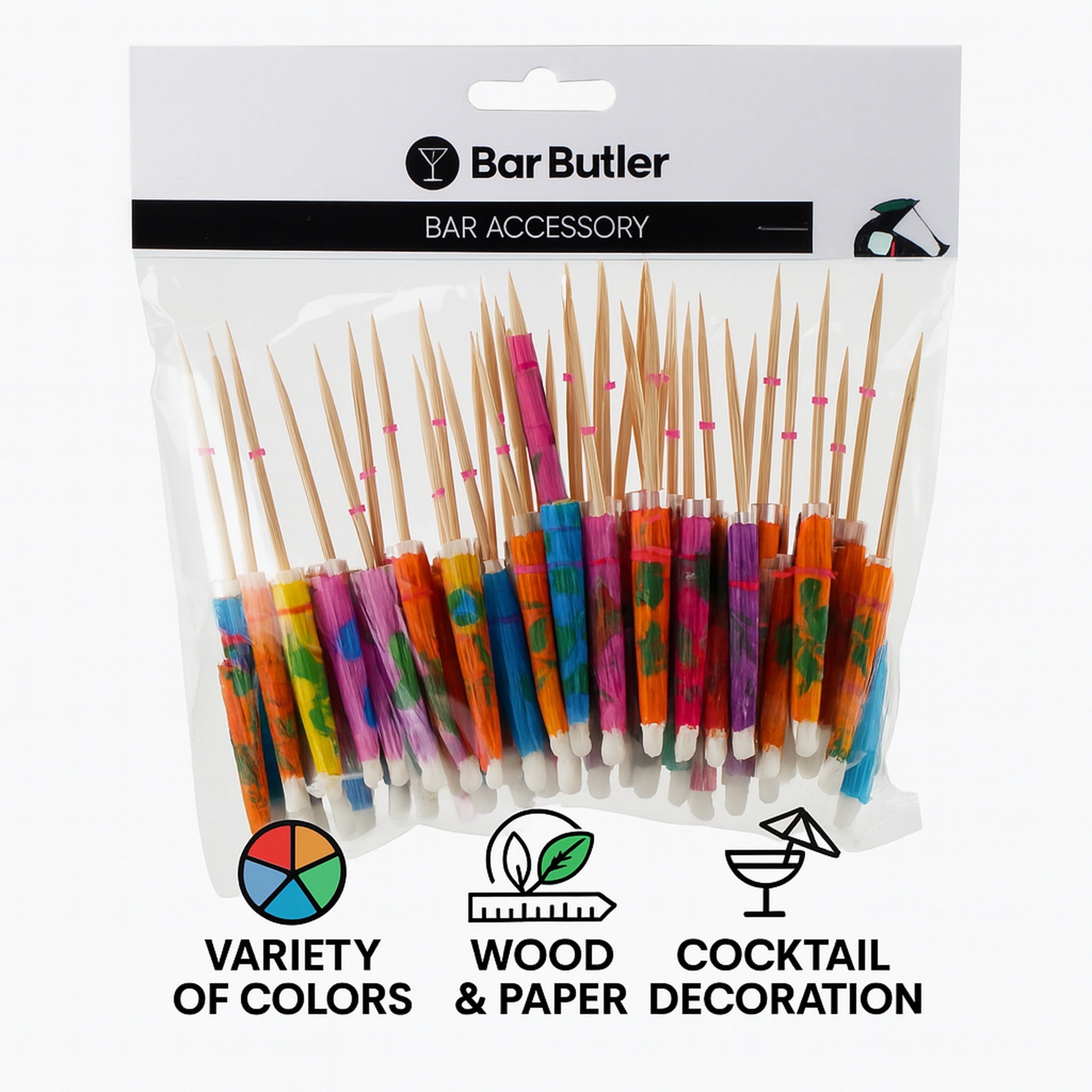 The Bar Butler Cocktail Umbrellas come in a fun pack of 50, each measuring 100mm. These colorful paper umbrellas add a playful and festive touch to any drink, perfect for parties, tropical-themed events, and casual gatherings. Easy to use and lightweight, they instantly elevate the presentation of cocktails, mocktails, and other beverages, making every sip feel like a celebration.