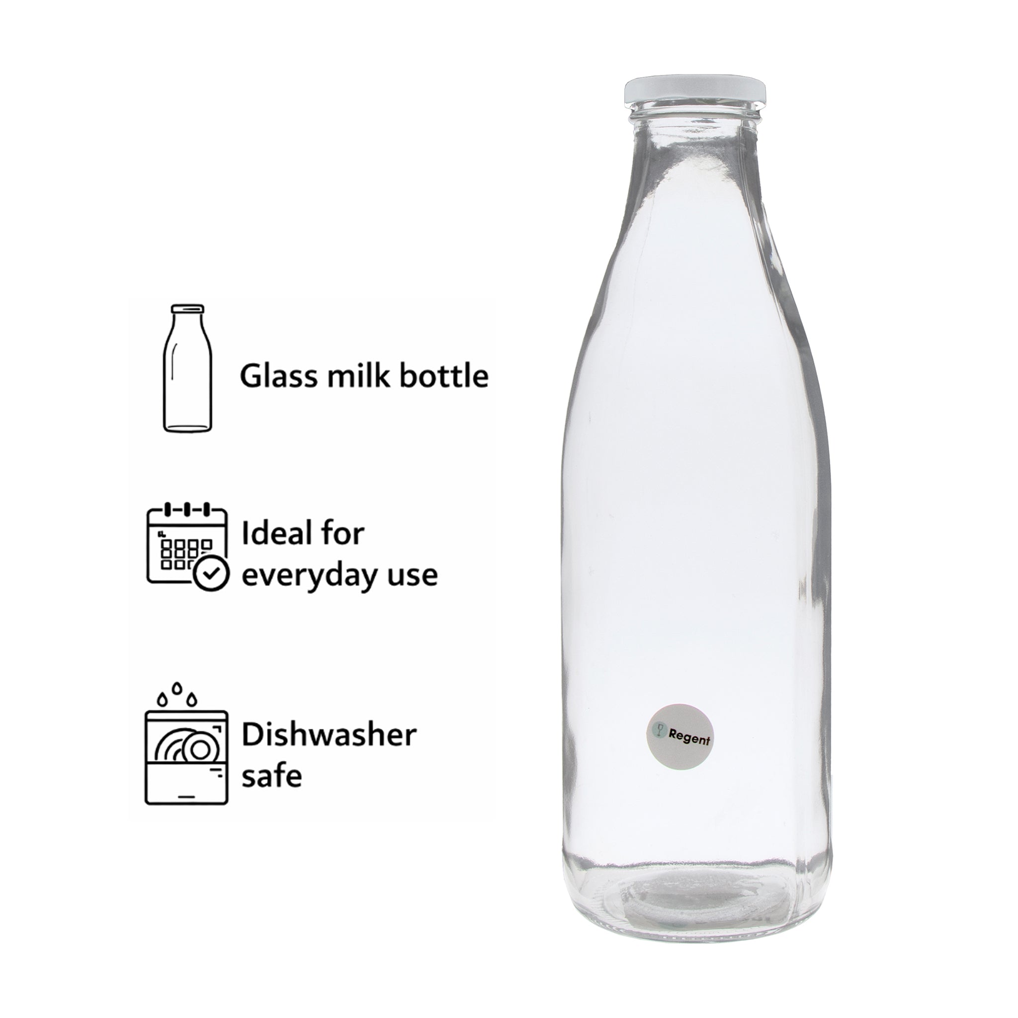The Regent Glass Milk Bottle with Metal Lid offers a fun, classic and elegant way to store and serve milk or other beverages. With a 1L capacity, its sturdy glass construction ensures durability while the metal lid provides a secure seal to maintain freshness. Ideal for both everyday use and stylish presentations, this bottle combines practicality with refined design for a sophisticated addition to your kitchen or dining setting.