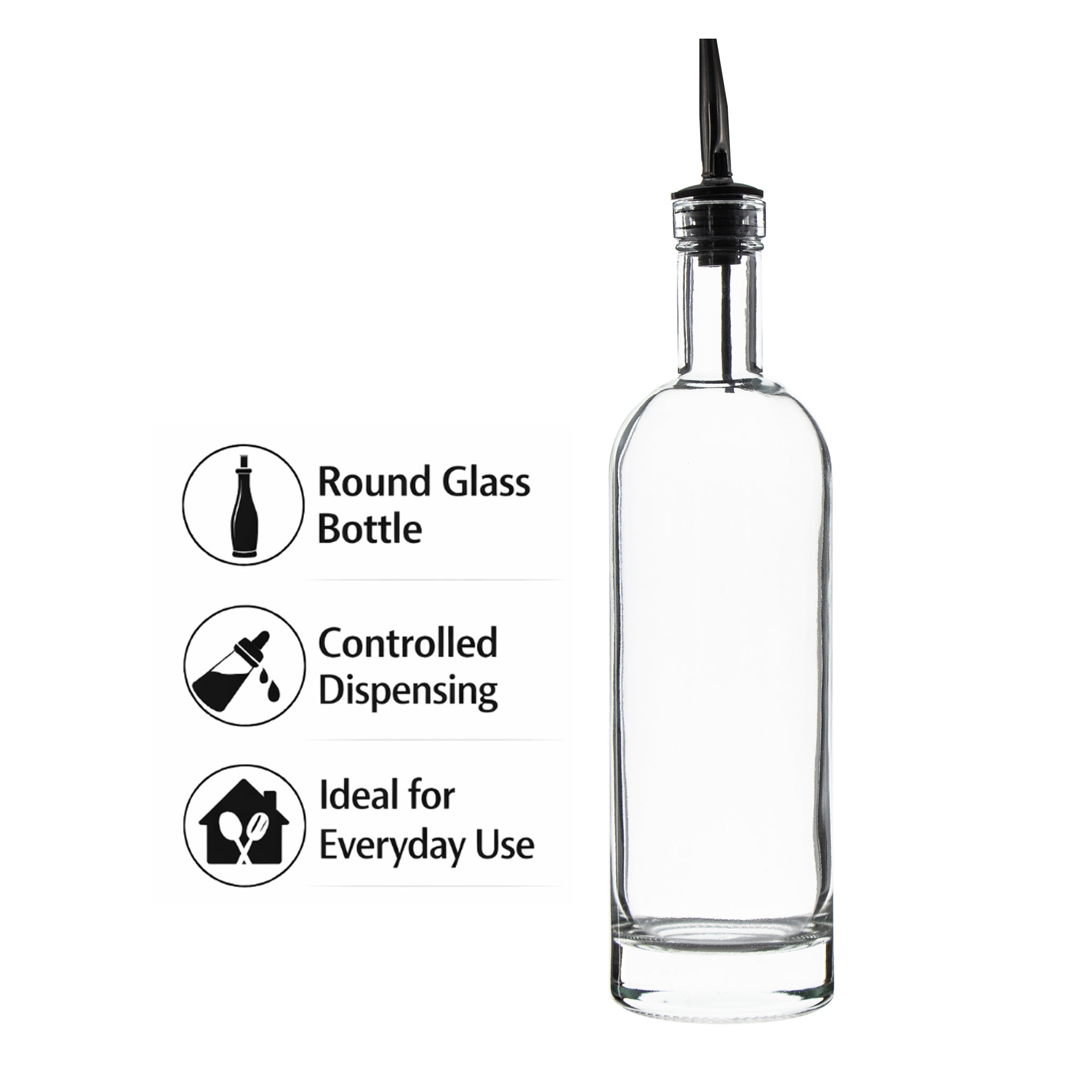 The Regent Glass Oil/Vinegar Round Bottle features a 500ml capacity with a heavy base for stability and a quality stainless steel and rubber built-in pourer for controlled dispensing. Crafted from durable glass, it preserves the freshness and flavor of oils and vinegars while minimizing spills. Ideal for both kitchen use and elegant table presentation, this bottle combines practicality with a refined design to enhance your culinary experience.