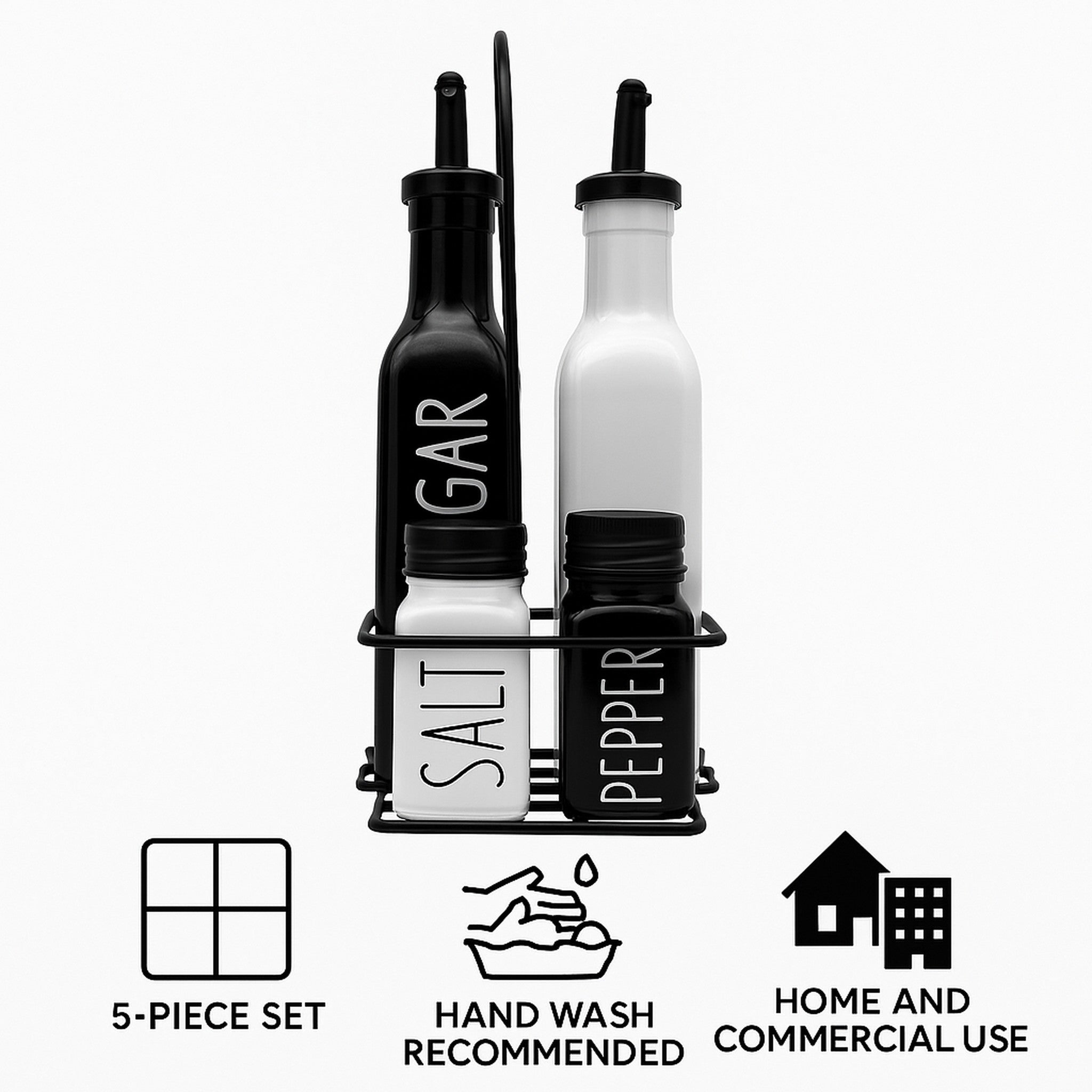 Elevate your dining experience with the Regent Glass Black and White Condiment Set. This stylish 5-piece set includes glass containers of 250ml and 85ml capacities, neatly organized in a convenient caddy. Perfect for serving sauces, dressings, or spices, it combines functionality with elegant design, making it ideal for both home and catering use. Keep your condiments accessible and beautifully presented, enhancing every meal with ease and sophistication.