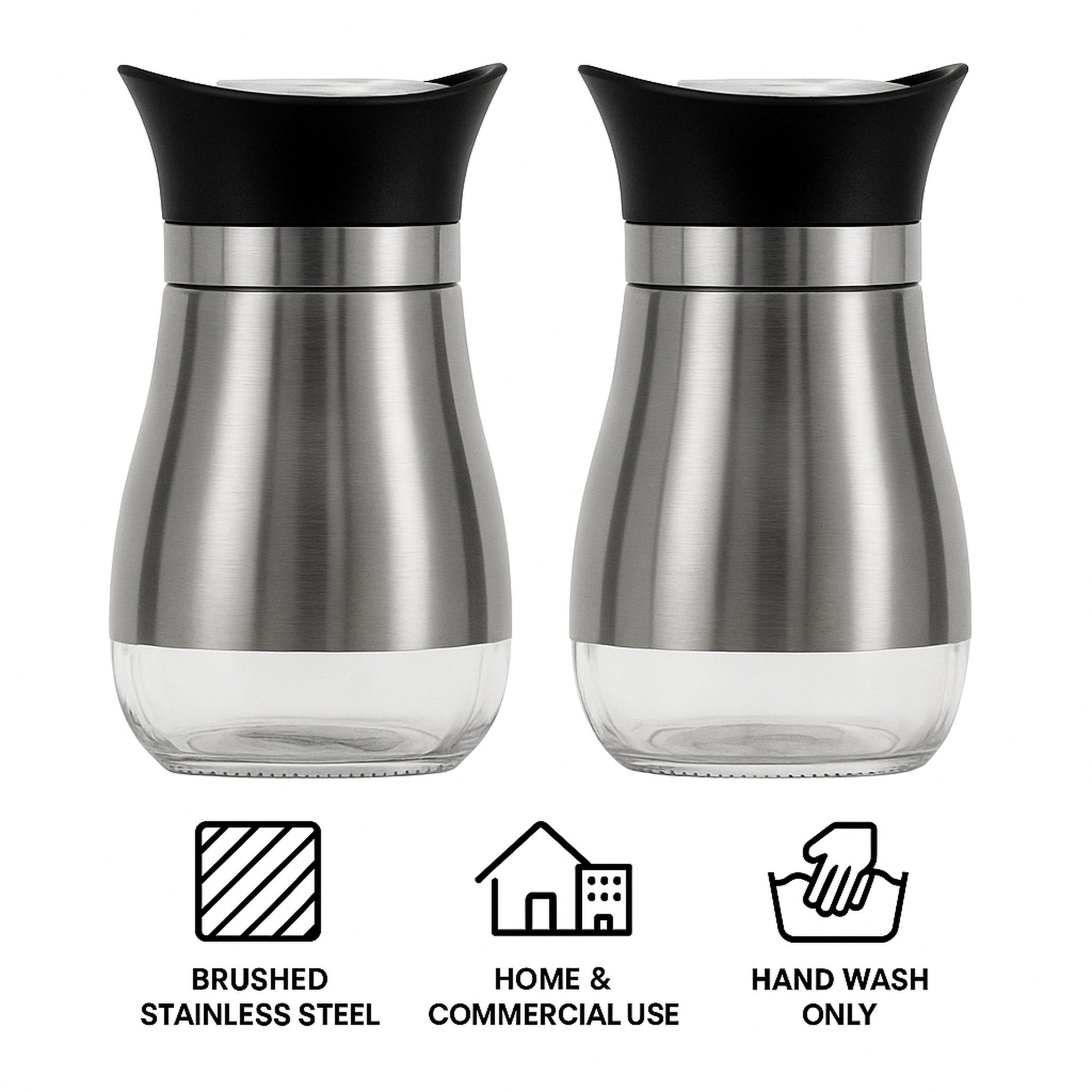 Made from high quality brushed stainless steel with a glass inner that helps to verify when the shakers are getting low, avoiding the hassle of constantly removing the cap.