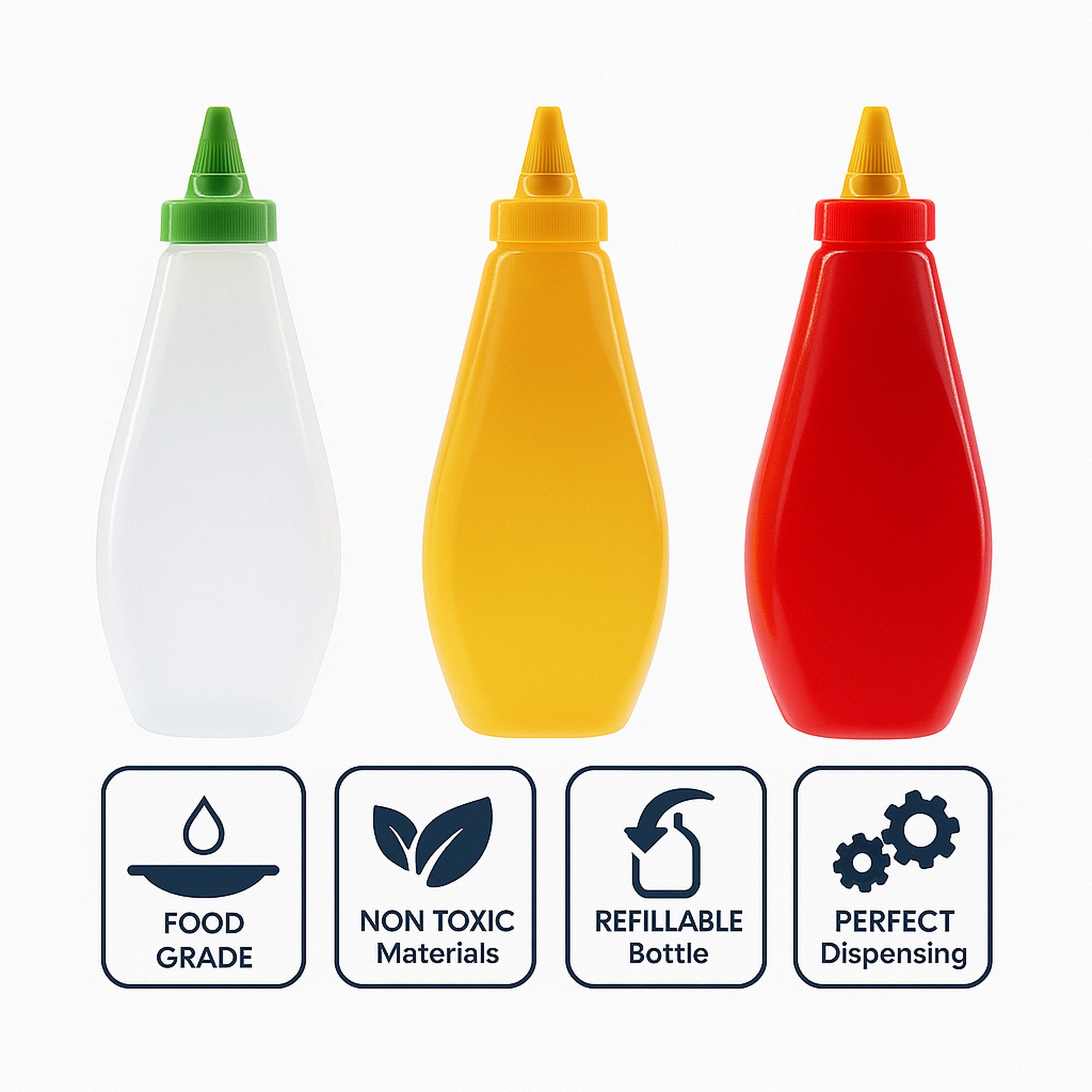 This pack of 3 coloured squeeze bottles with witch-hat style caps are pleasing in appearance and are a suitable size for both home and catering use. Made of plastic they are ideal for spices, syrups, dressings, oils, vinegars and sauces.
