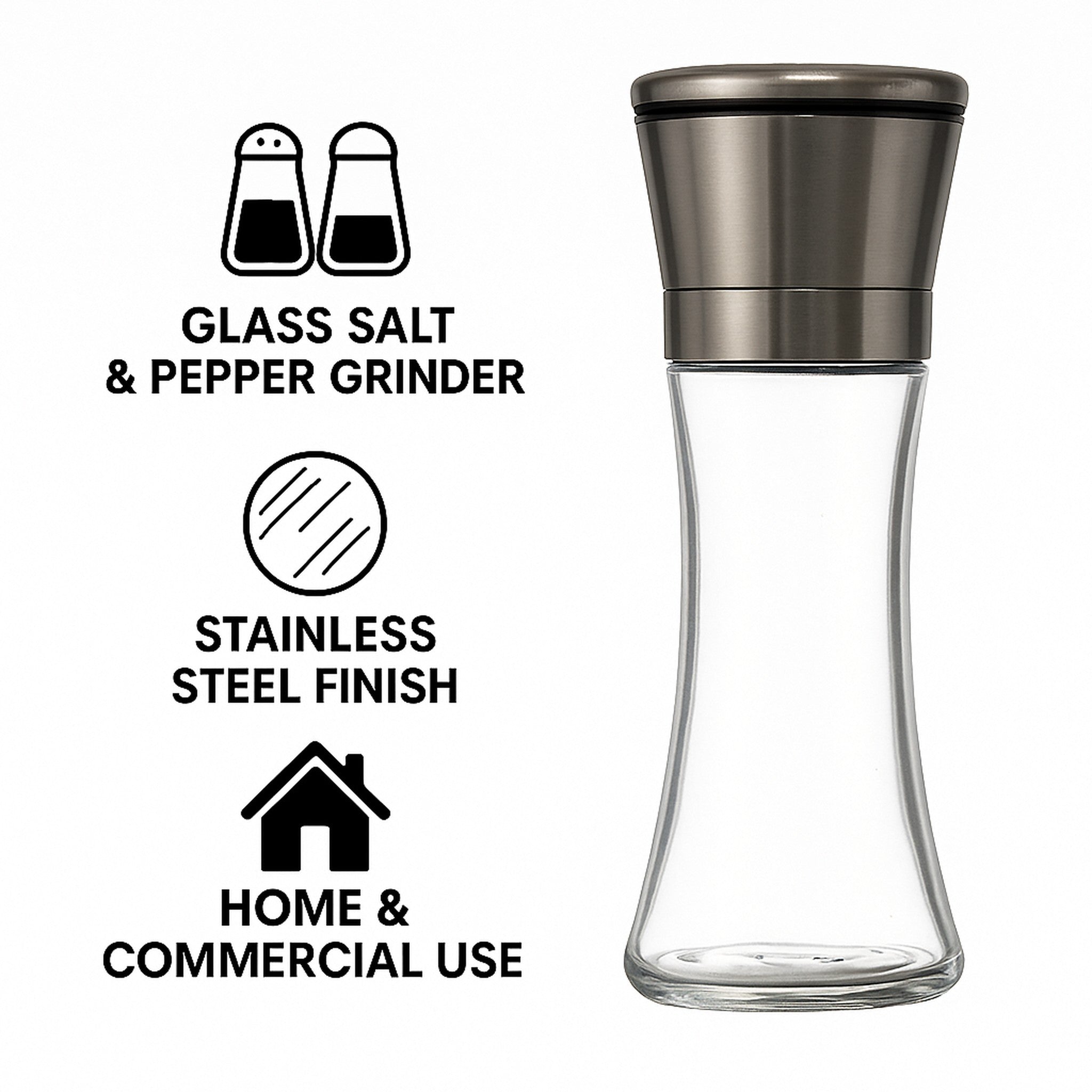 Our glass and brushed finish stainless steel salt/pepper grinder is beautifully designed and is simple to use.