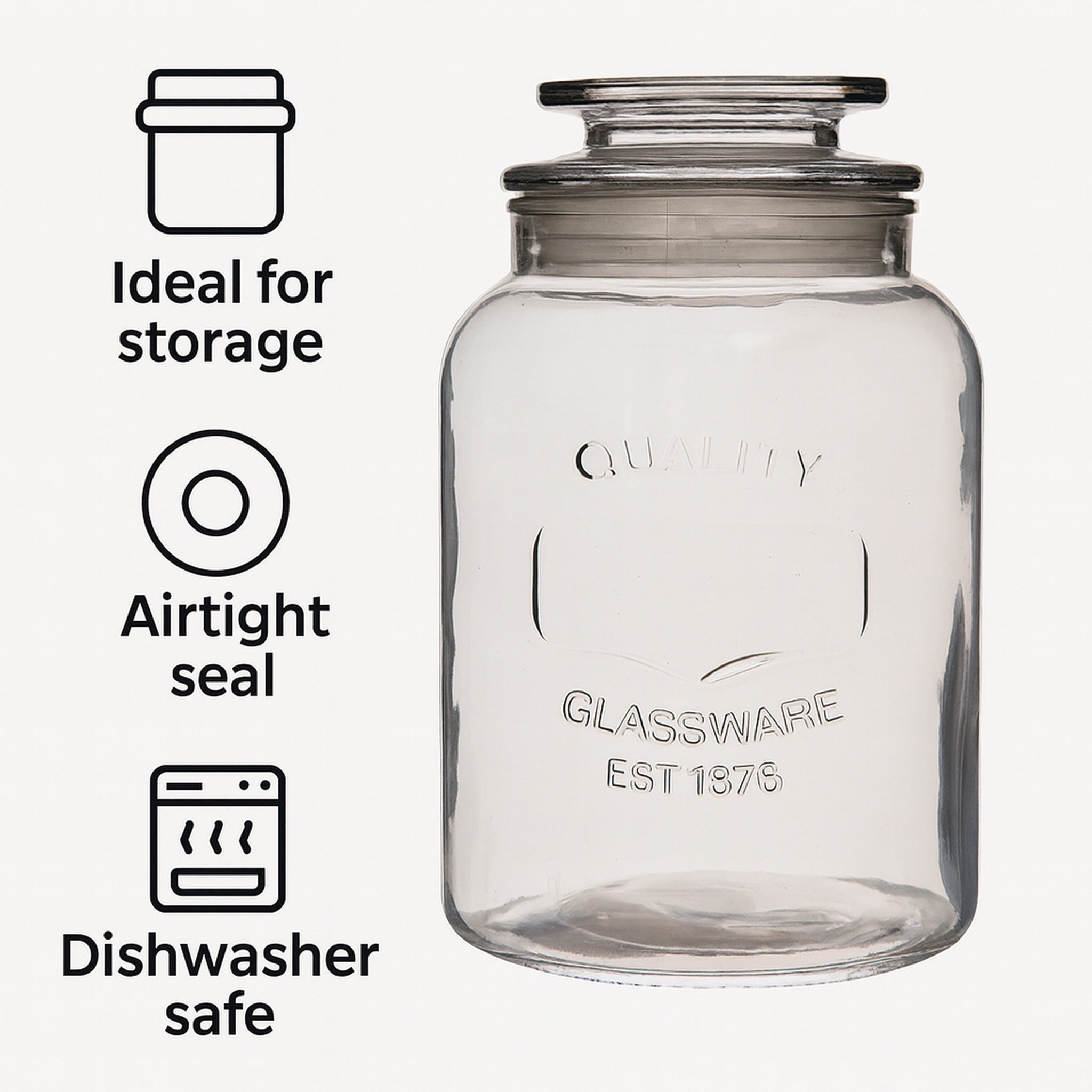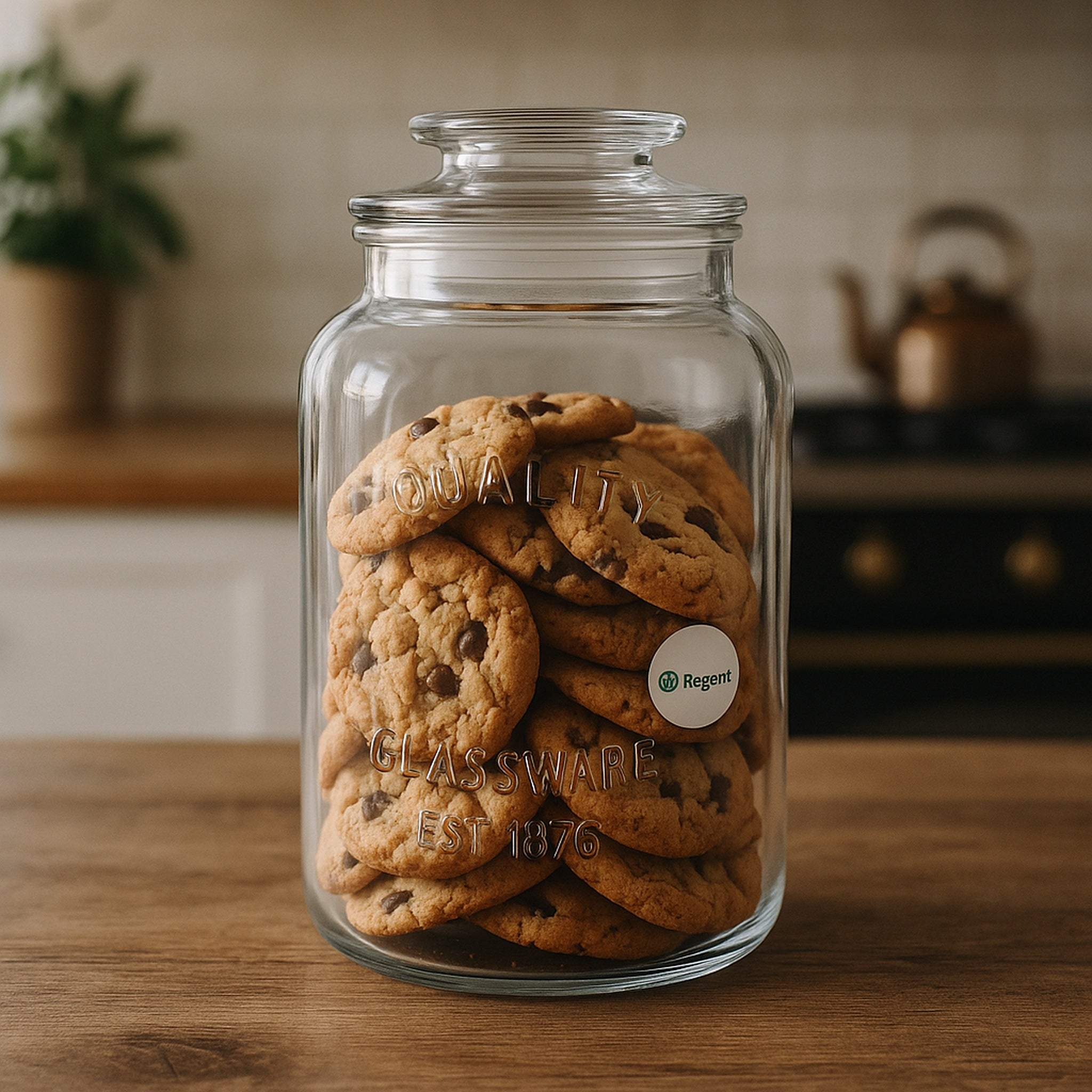 REGENT ROUND CANISTER `QUALITY` EMBOSSED WITH GLASS LID, 1,2L