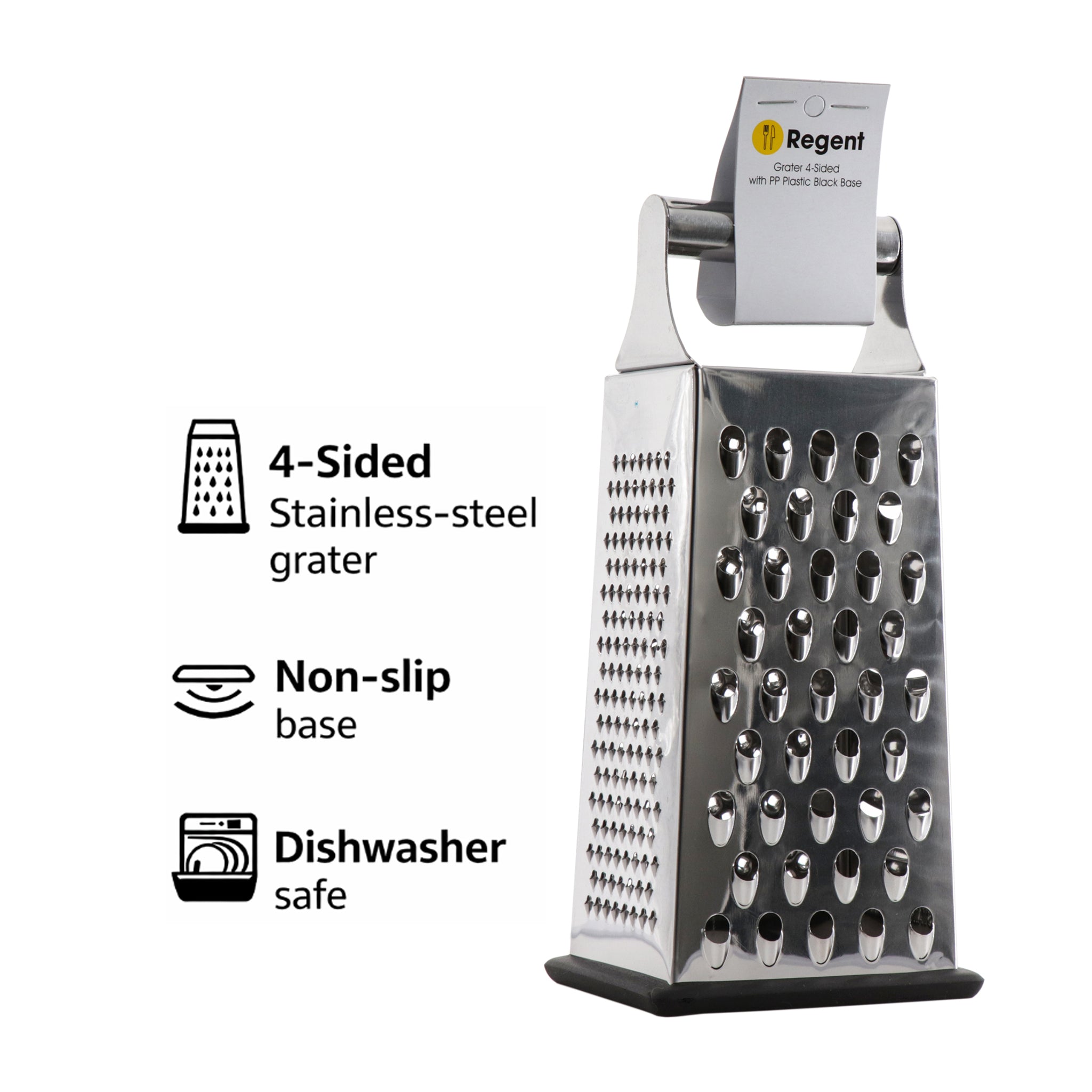 The Regent Kitchen 4-Sided Stainless steel grater features sharp stainless steel blades on all sides, offering versatile grating options for cheese, vegetables, zest, and more. Its 240mm size provides ample surface area for efficient food preparation. Equipped with a polypropylene non-slip base, it ensures stability and safety during use, reducing the risk of slips. Ideal for precise and effortless grating, this tool enhances kitchen efficiency while delivering consistent results.