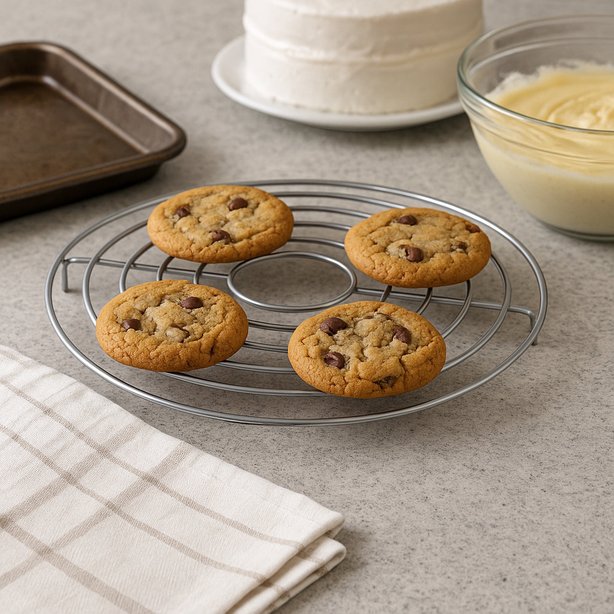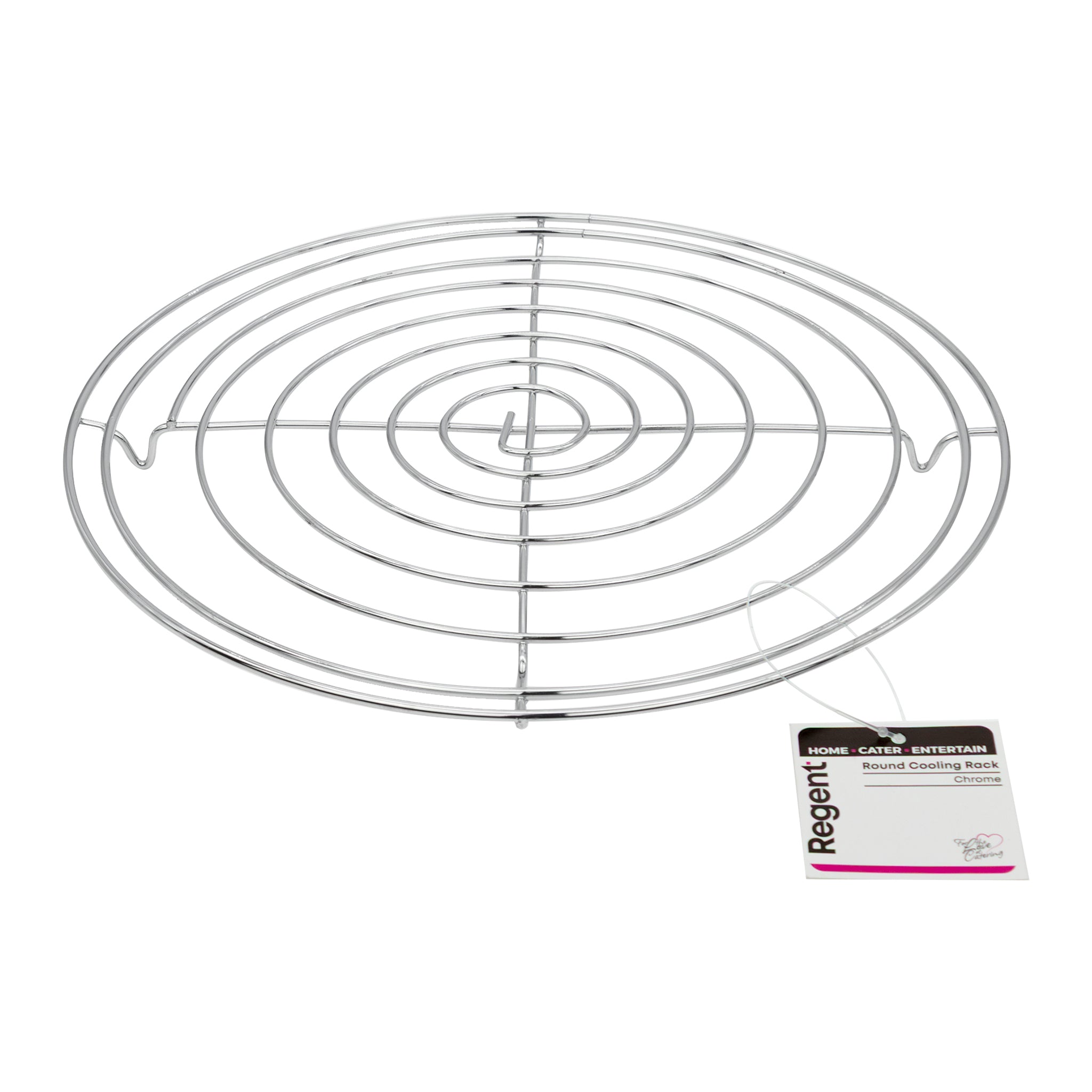 The Regent Round Bakeware Cooling Rack, with a 240mm diameter and 15mm height, is crafted from durable chrome for long-lasting use. Its elevated design promotes even air circulation around baked goods, preventing moisture buildup and ensuring optimal cooling. Compact yet sturdy, this rack is ideal for cooling cakes, pastries, and other treats efficiently, helping maintain their texture and quality in both professional and home baking settings.
