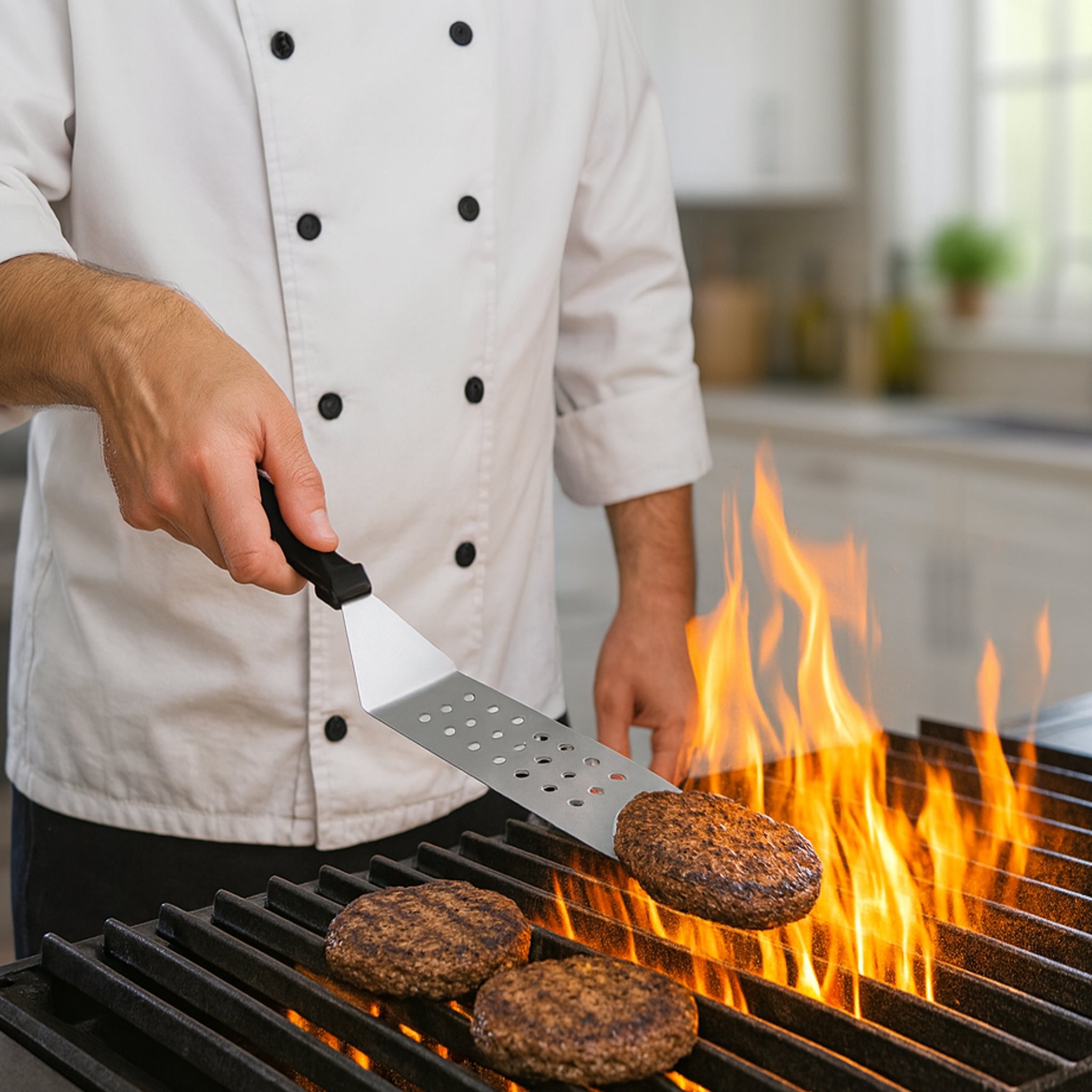 This commercial quality hamburger turner is made of durable thick stainless steel. It has a firm grip PP plastic handle and is an essential tool used in catering kitchens, restaurant kitchens and in the home.
