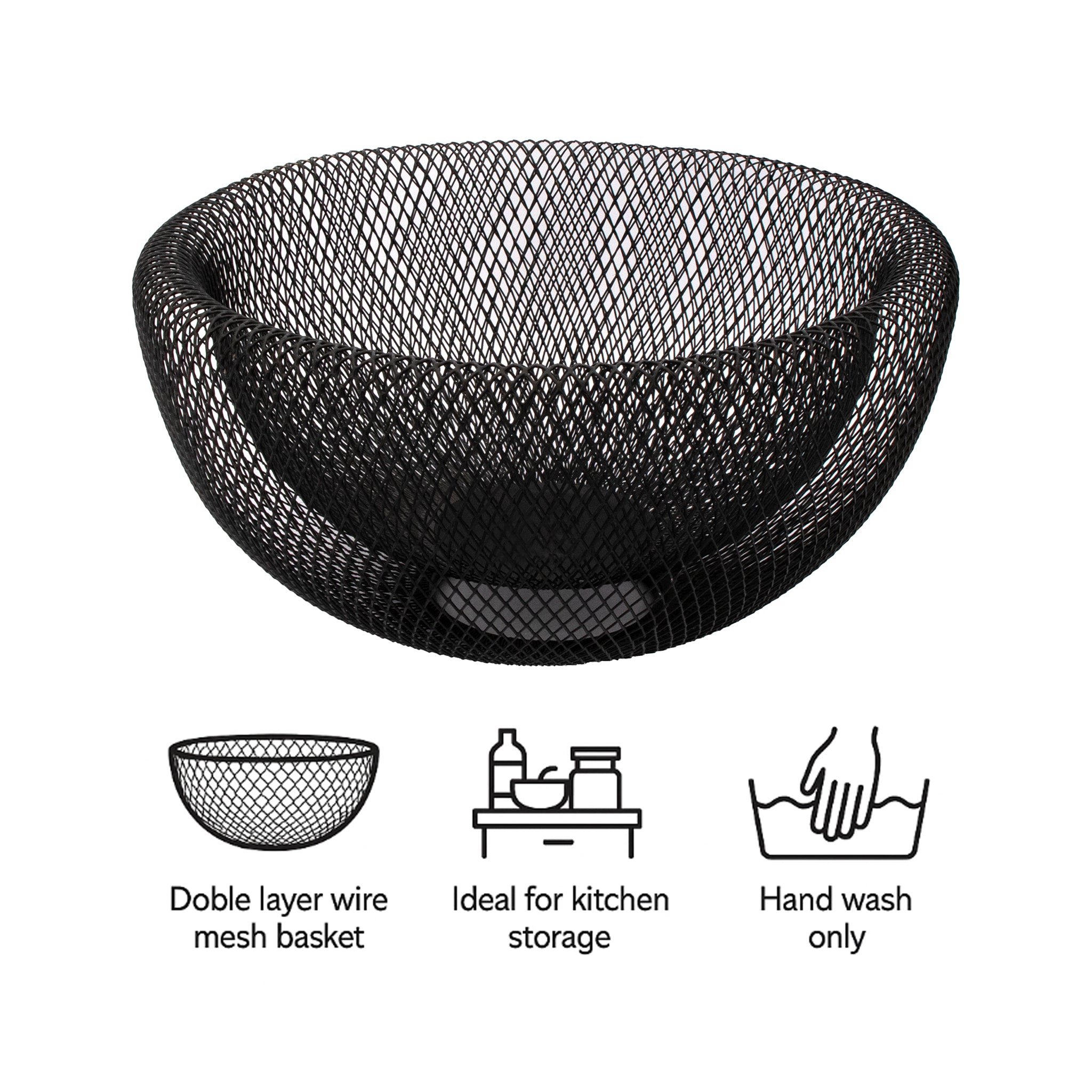 Made of high temperature baked black paint coated wire mesh, it is wear and corrosion resistant and offers a lot of space for your fruit, bread products, vegetables, snacks, candy and household items.