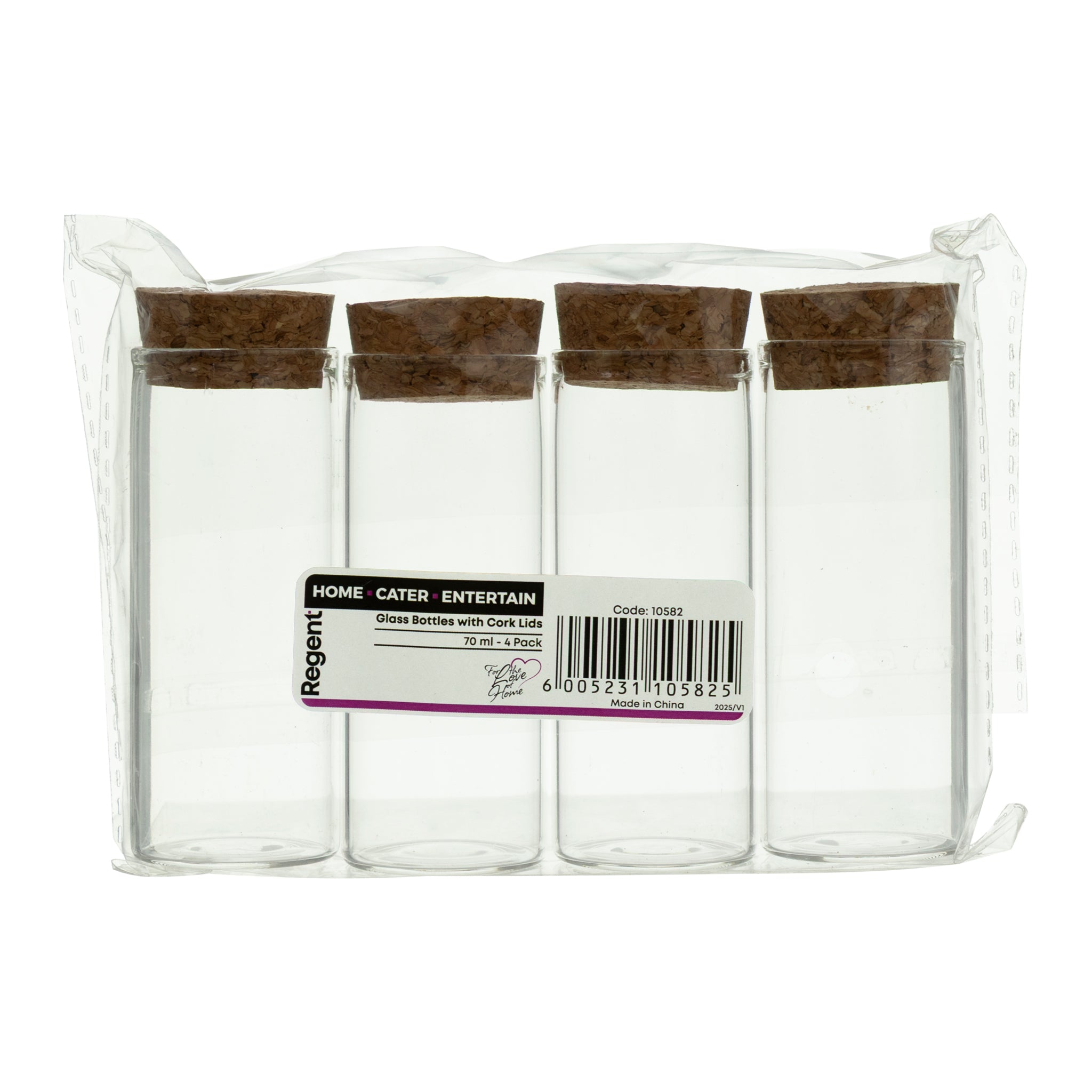 The Regent Glass Bottles with Cork Lids come in a set of four, each holding 70ml with dimensions of 37mm diameter by 96mm height. Made from clear glass, these bottles allow easy identification of contents, while the natural cork lids provide an airtight seal to preserve freshness. Ideal for storing spices, oils, or homemade extracts, they offer versatile use in the kitchen or for decorative purposes, combining functionality with a trendy design.