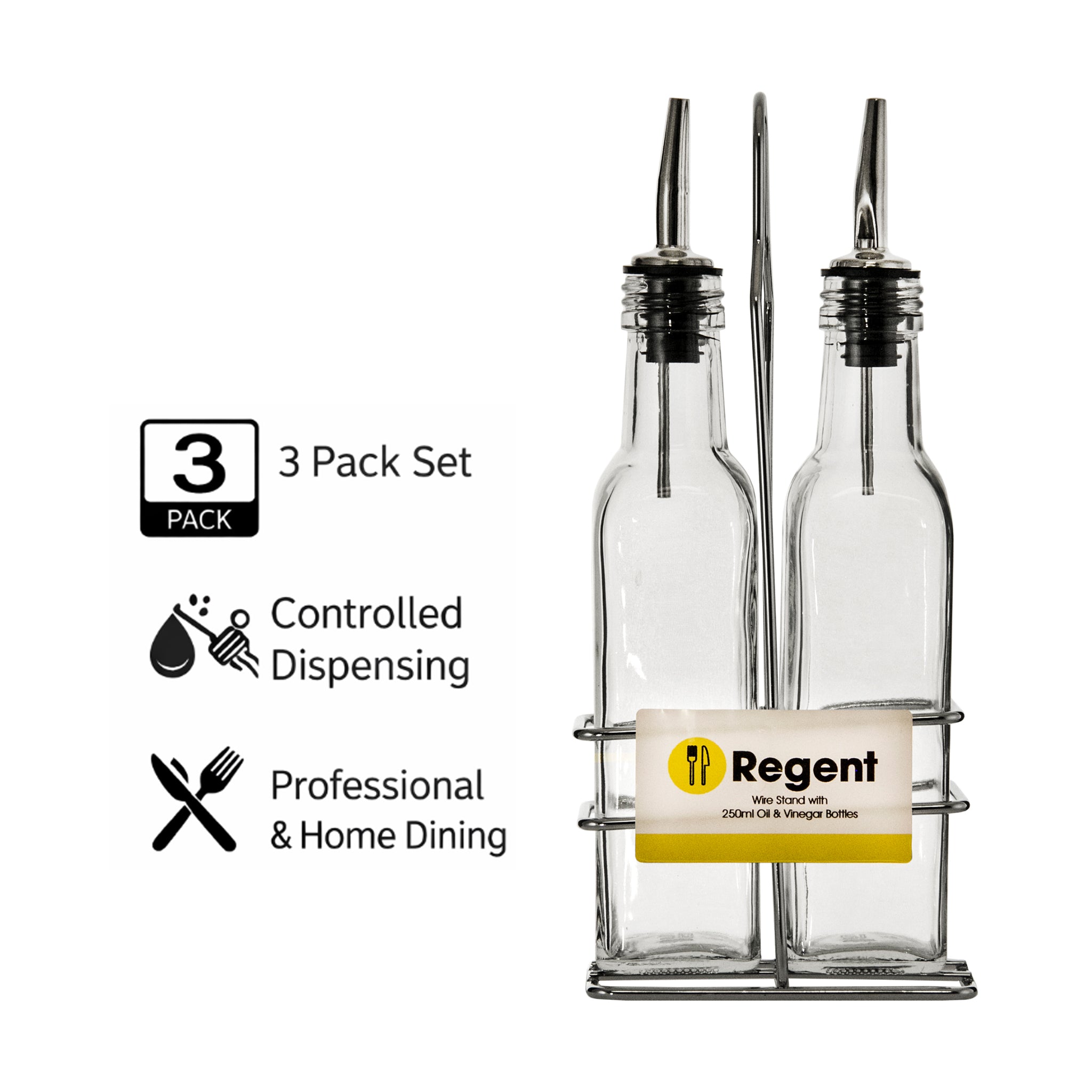 This versatile REGENT SQUARE OIL & VINEGAR BOTTLES WITH POURERS ON WIRE STAND SET, features two tall square 250ml bottles with precision pourers, designed for controlled dispensing of oil and vinegar without drips or waste. The integrated wire stand provides stable tabletop presentation while minimizing counter space requirements. The transparent glass construction allows for visual monitoring of contents, while the pourers ensure consistent flow rates for precise culinary application. The sophisticated design transitions seamlessly from kitchen to table, combining functional excellence with aesthetic appeal for both professional and home dining environments.