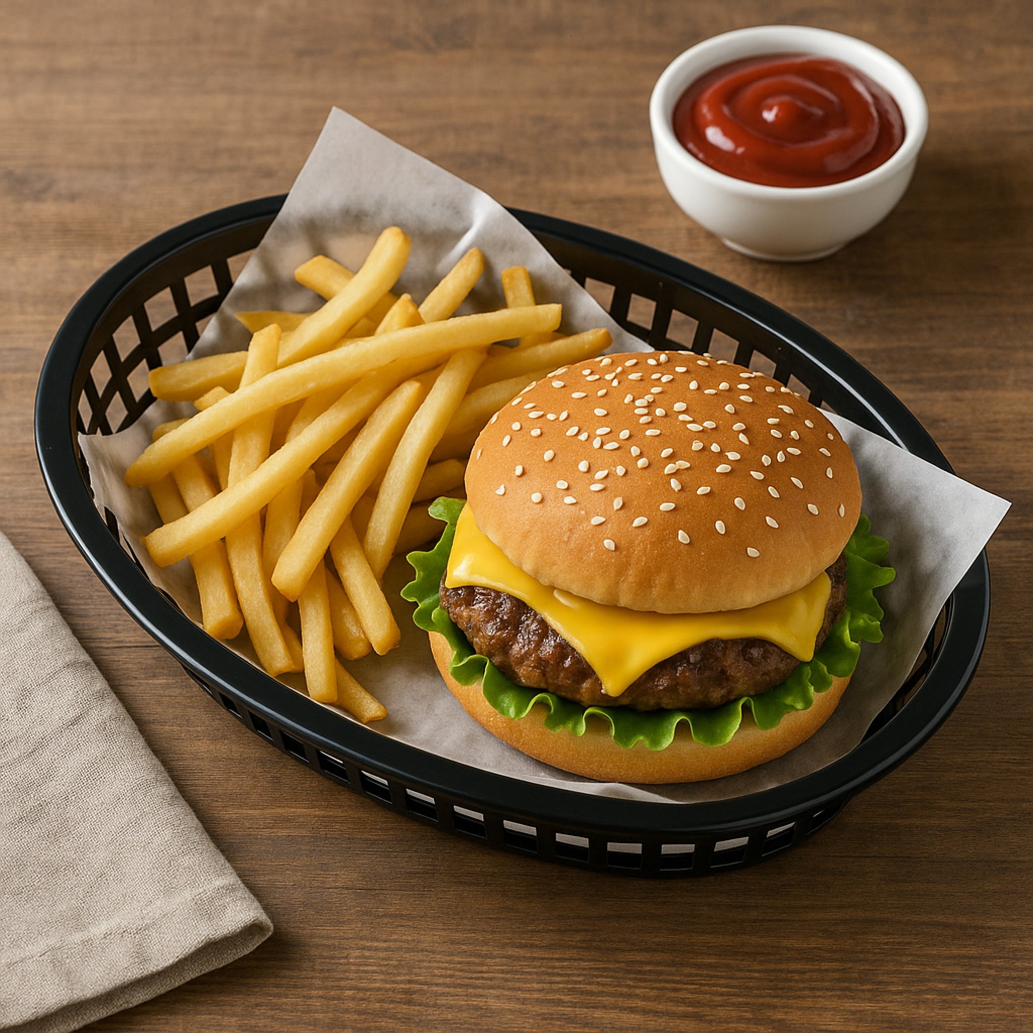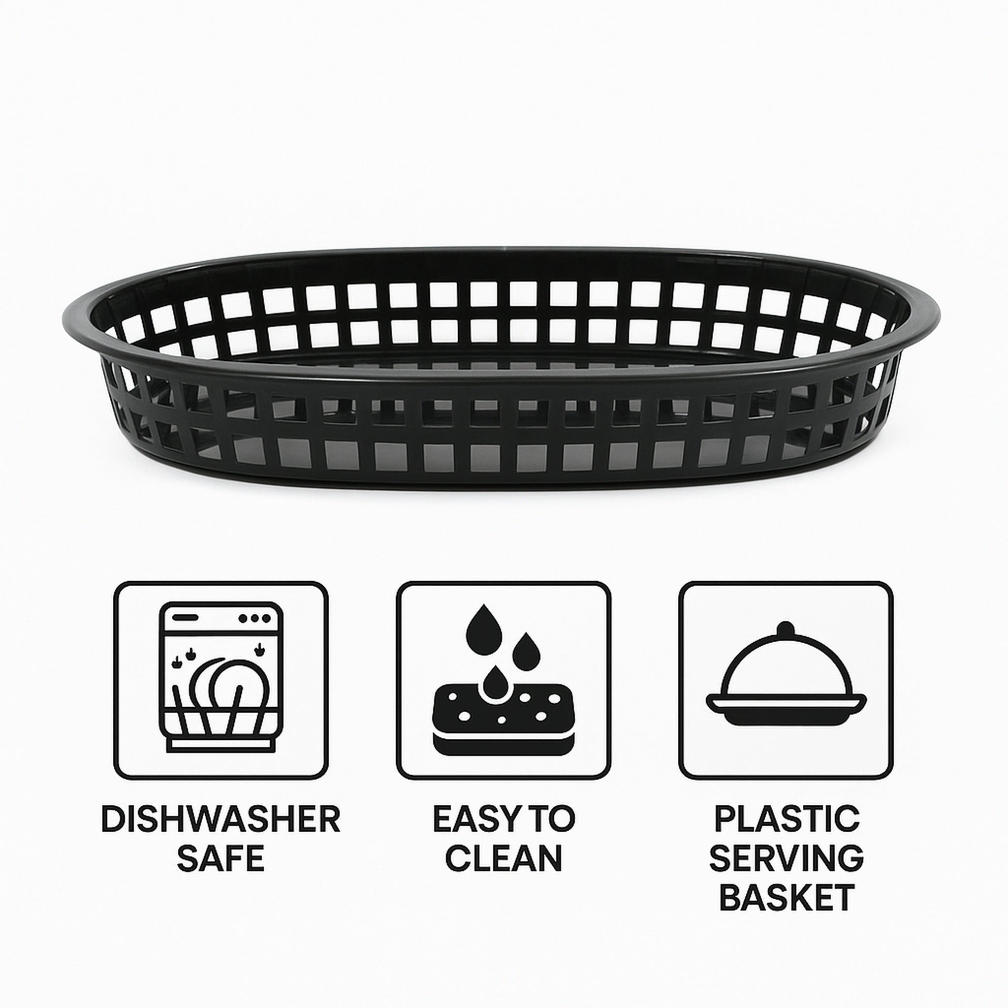 The Regent Catering Plastic Serving Basket in oval shape measures 270x175mm and is crafted from durable black plastic, offering a lightweight yet sturdy solution for serving food. Its sleek design enhances presentation while the easy-to-clean material ensures hygienic use. Ideal for catering events, casual dining, or food service, this basket efficiently holds sandwiches, snacks, or finger foods, combining practicality with professional appeal.