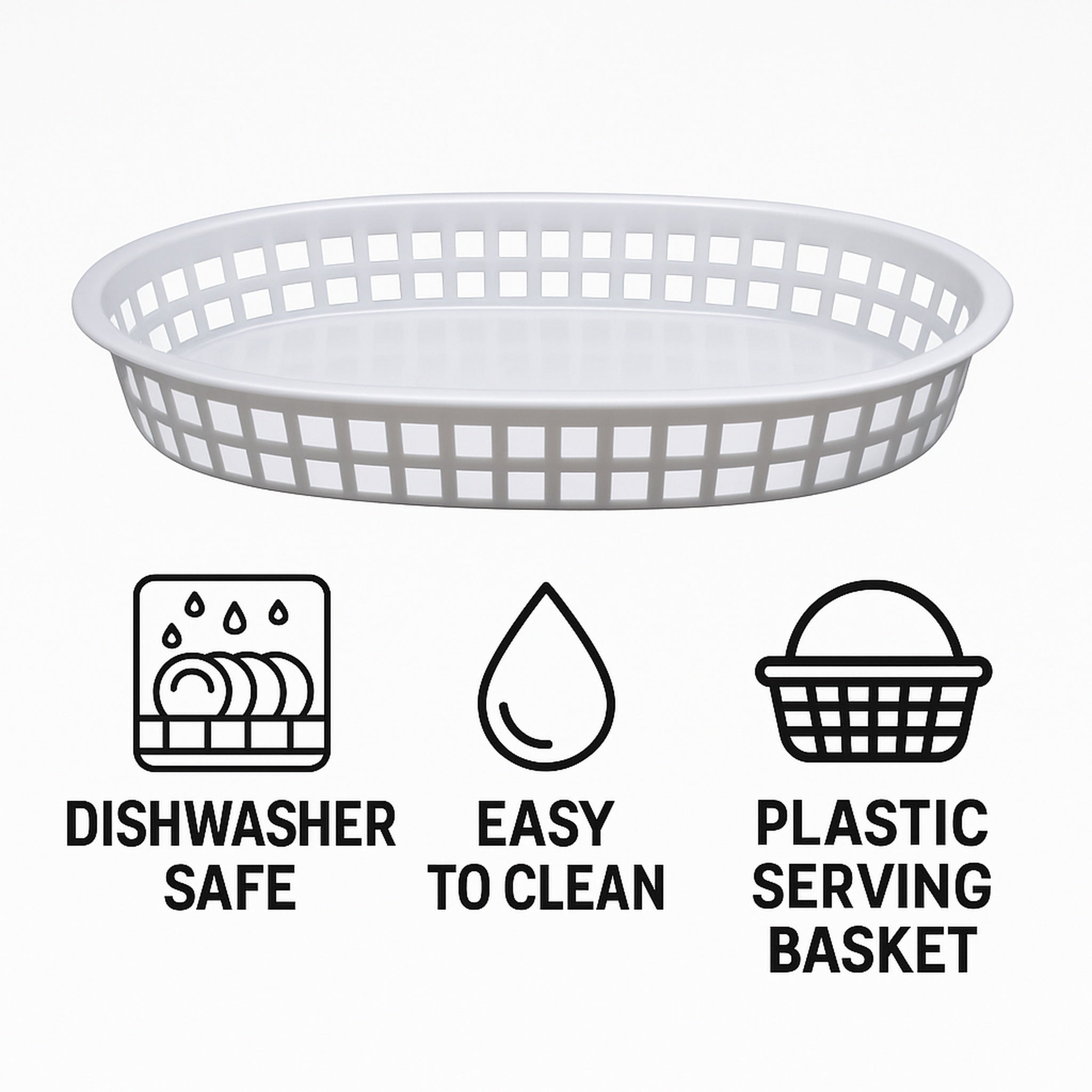 The Regent Catering Plastic Serving Basket in oval shape measures 270x175mm and is crafted from durable white plastic, offering a lightweight yet sturdy solution for serving food. Its sleek design enhances presentation while the easy-to-clean material ensures hygienic use. Ideal for catering events, casual dining, or food service, this basket efficiently holds sandwiches, snacks, or finger foods, combining practicality with professional appeal.