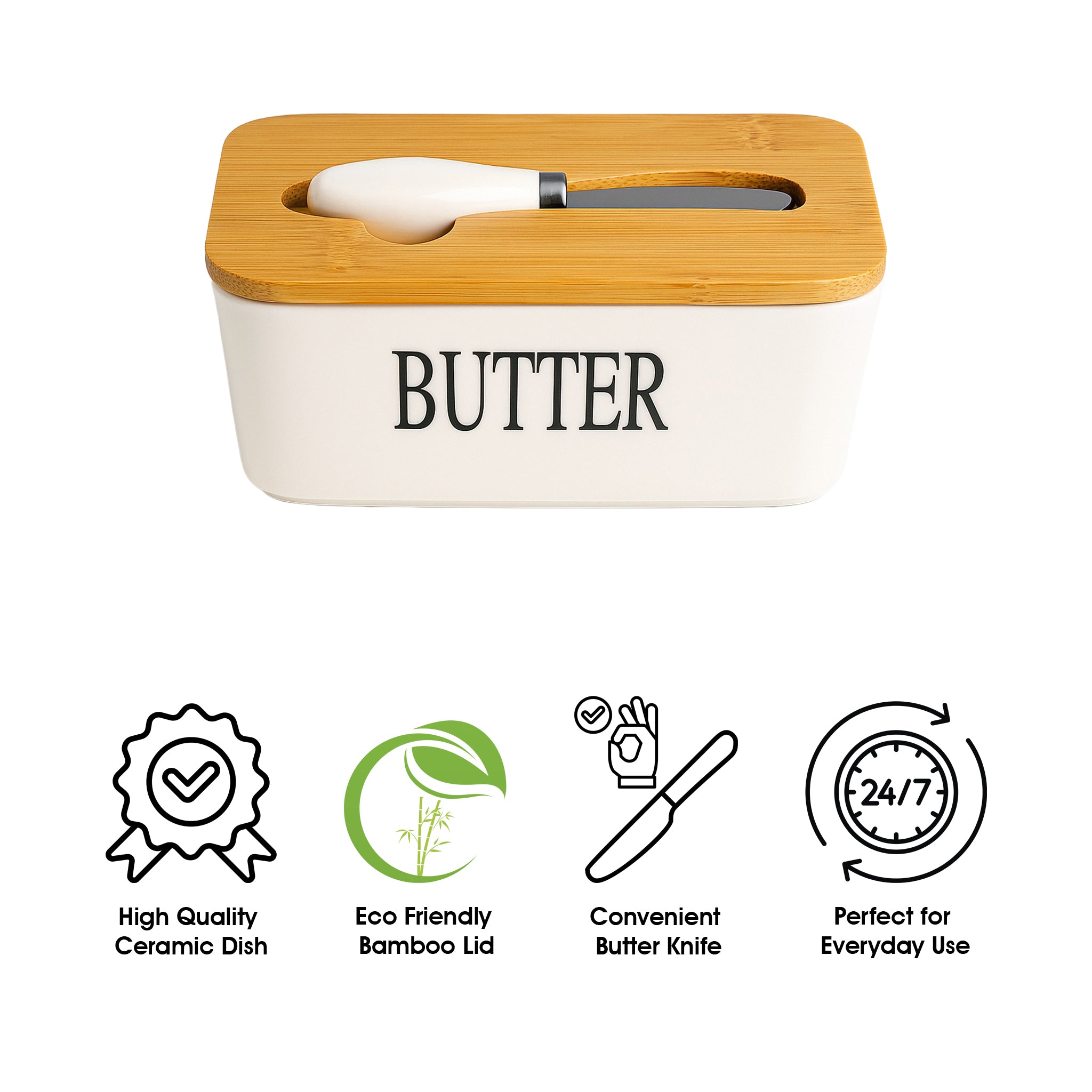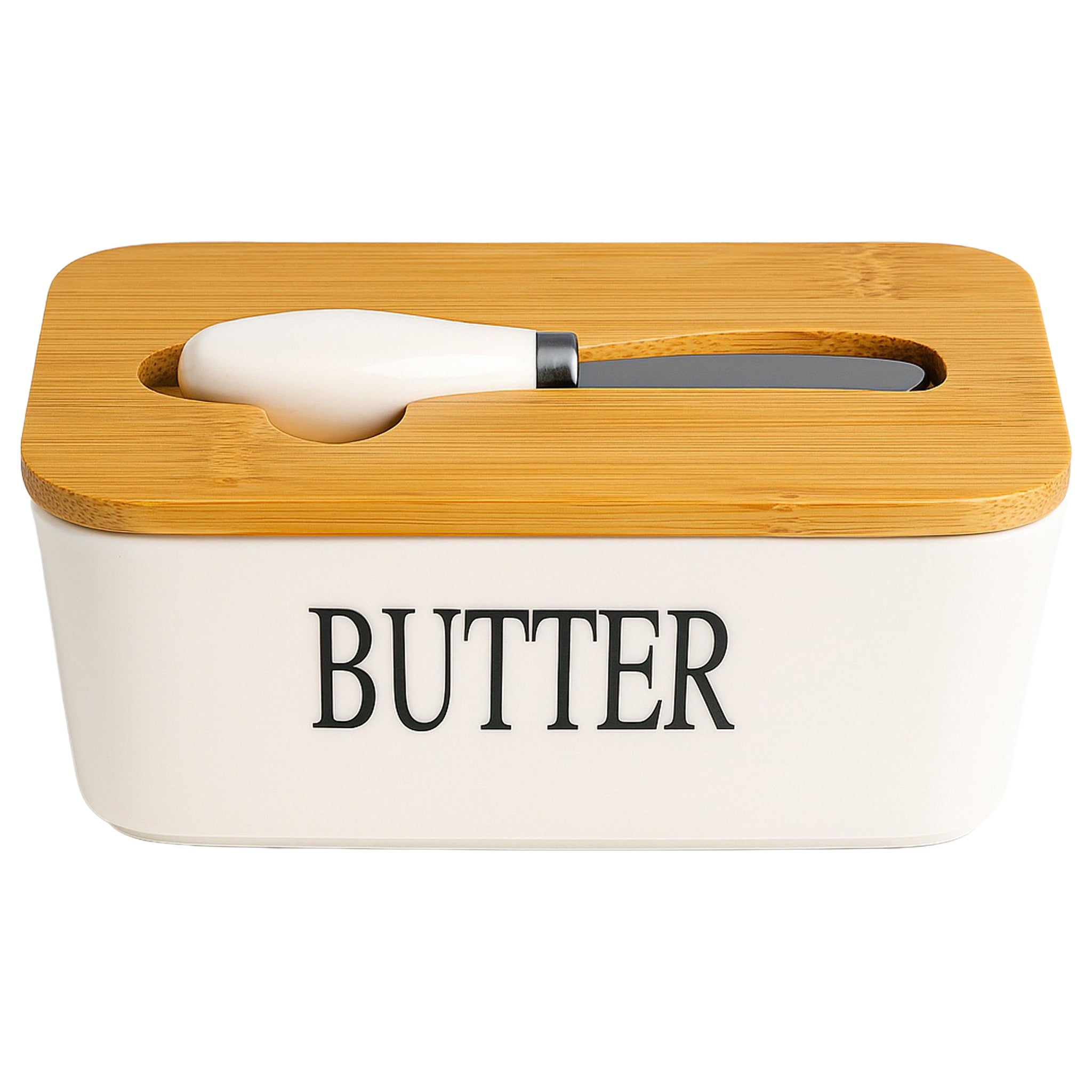 The Regent Ceramic Butter Dish in white, measuring 175x103mm, comes with a bamboo lid and a stainless steel knife for added convenience. Its stylish design keeps butter fresh while adding a playful touch to your kitchen or dining table. The bamboo lid provides a natural, airtight seal, and the included knife makes spreading effortless. Perfect for everyday use or entertaining, this butter dish combines practicality with fun, making butter serving both easy and charming.