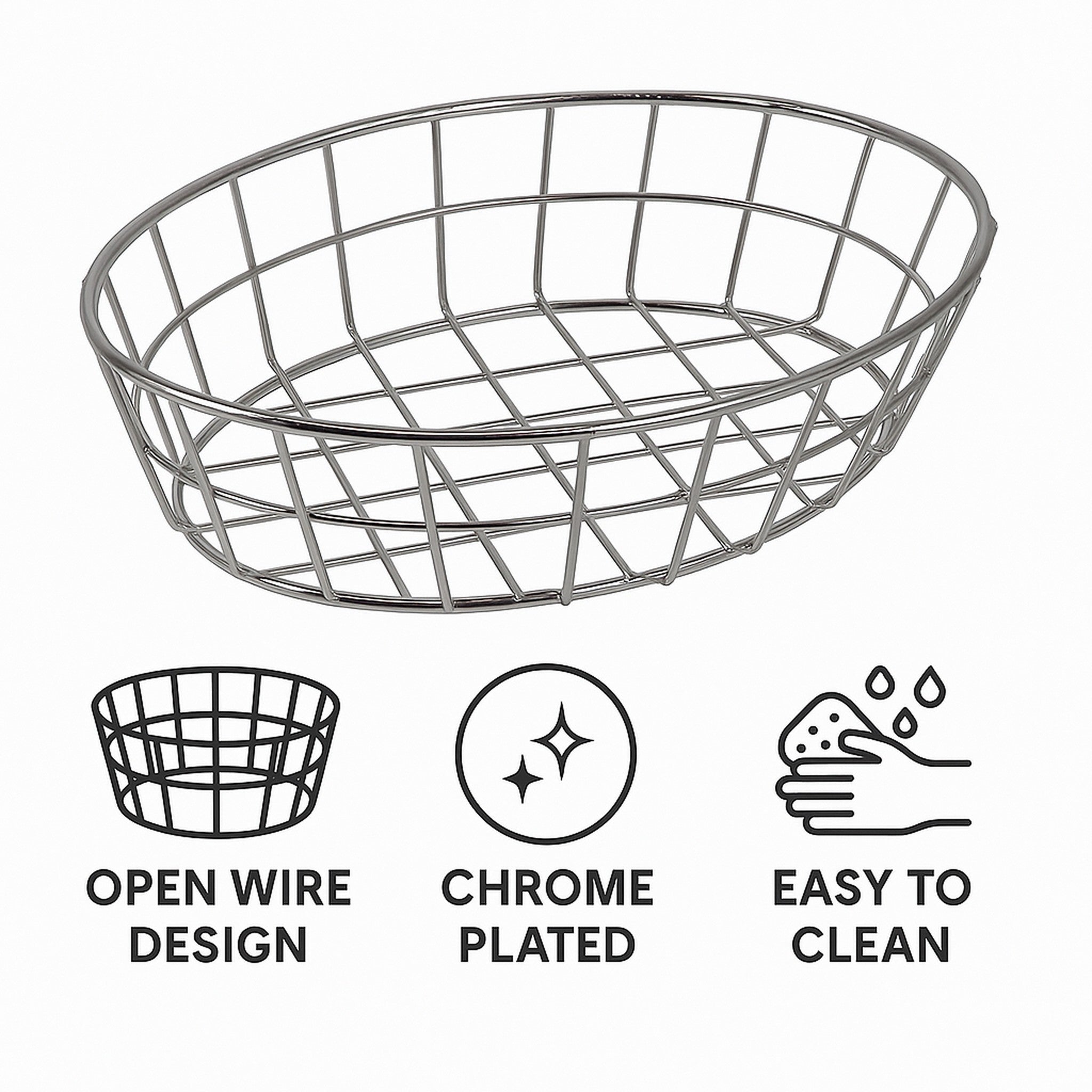 Our fast food oval baskets with a creative grid mesh design are made of chrome plated wire that ensures durability and longevity. This quality material is tough and resistant to rust, making it an ideal choice for your serving needs.