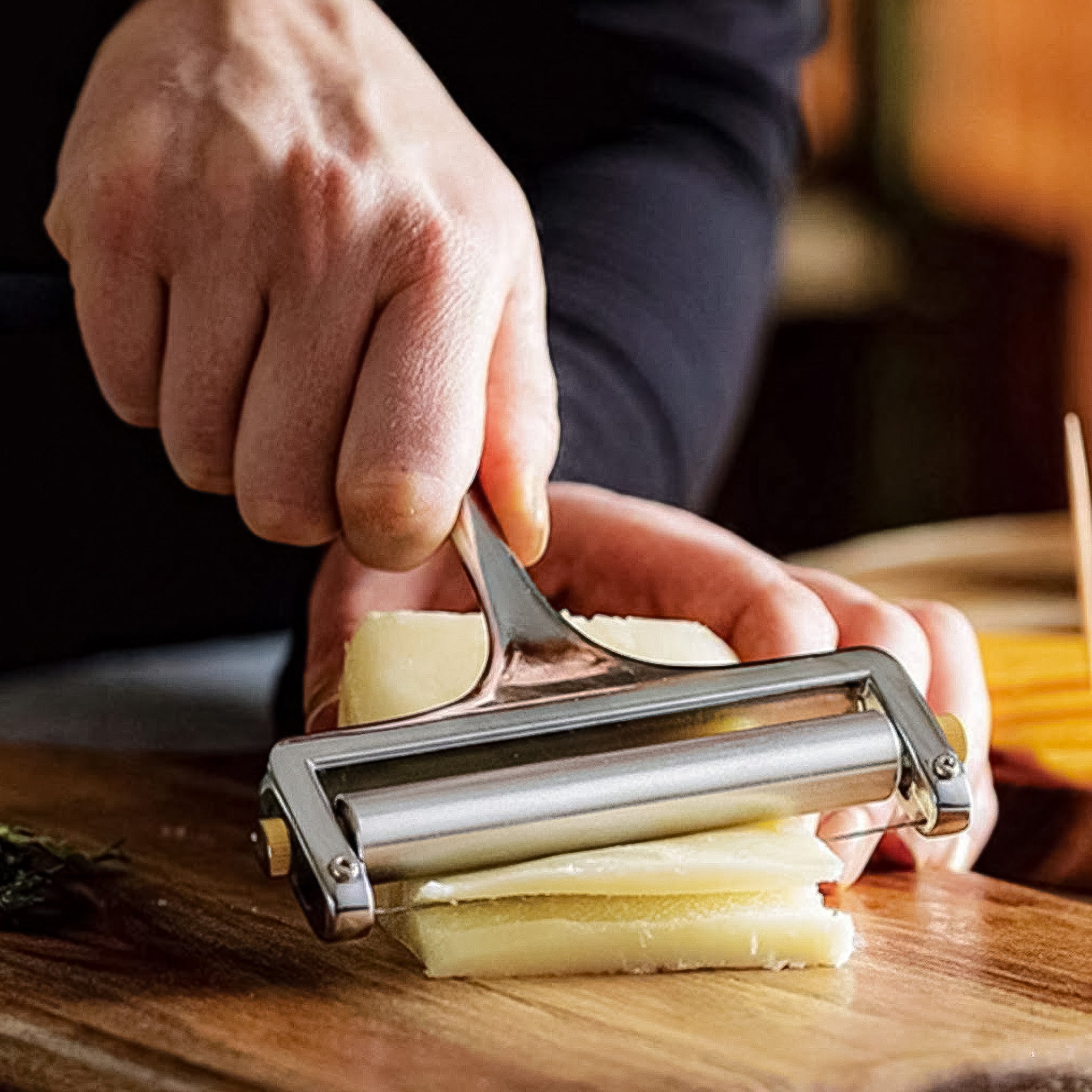 The heavy body is made from food safe durable cast zinc-aluminium made to withstand constant use in the kitchen. Thanks to its ergonomic steel handle and roller slide action, you can glide through blocks of cheese effortlessly.