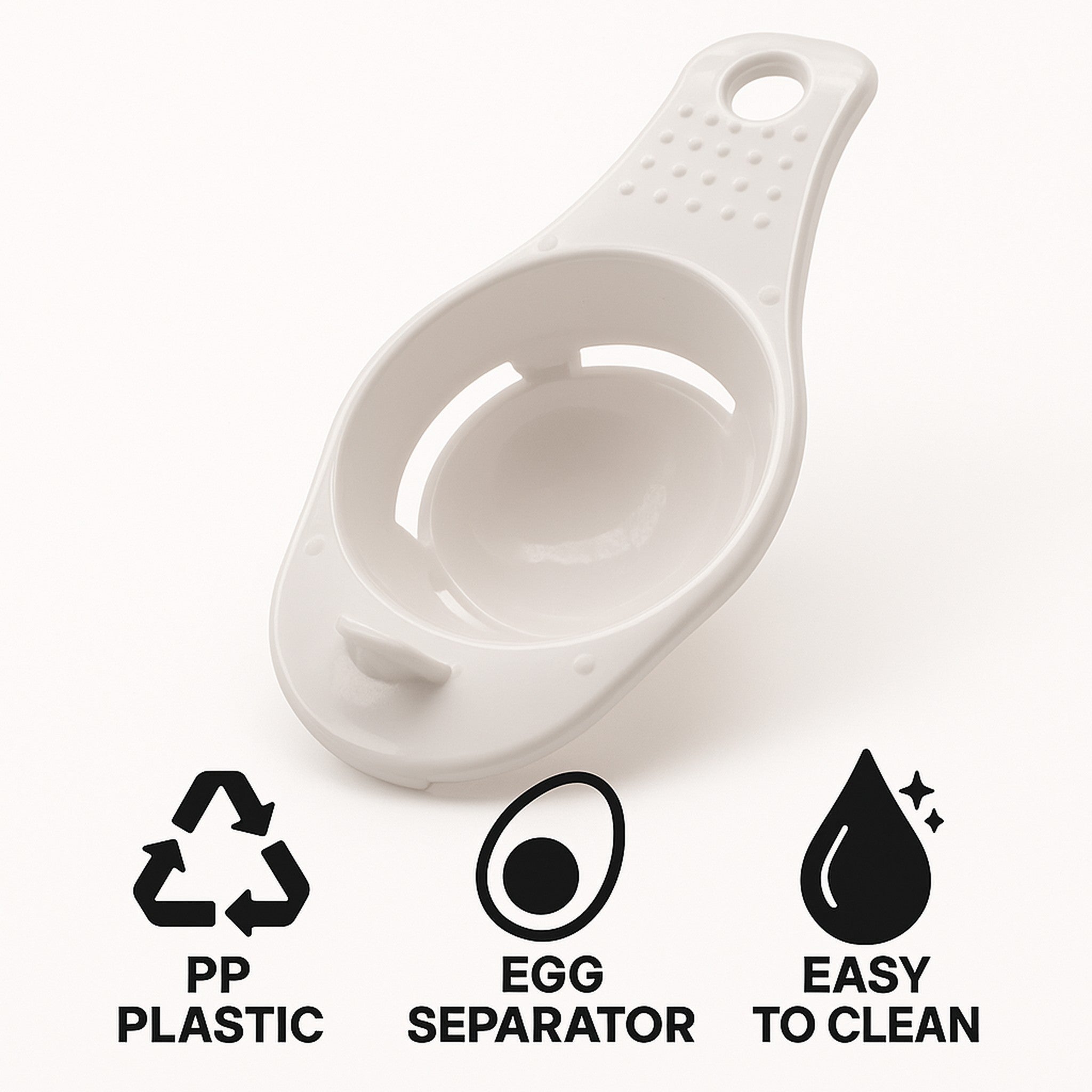 This egg separator is made from food safe PP plastic and has 4 slots for the white of the egg to slip through. Crack the egg into the separator, shake a couple of times and the yolk will stay firmly in the cup.