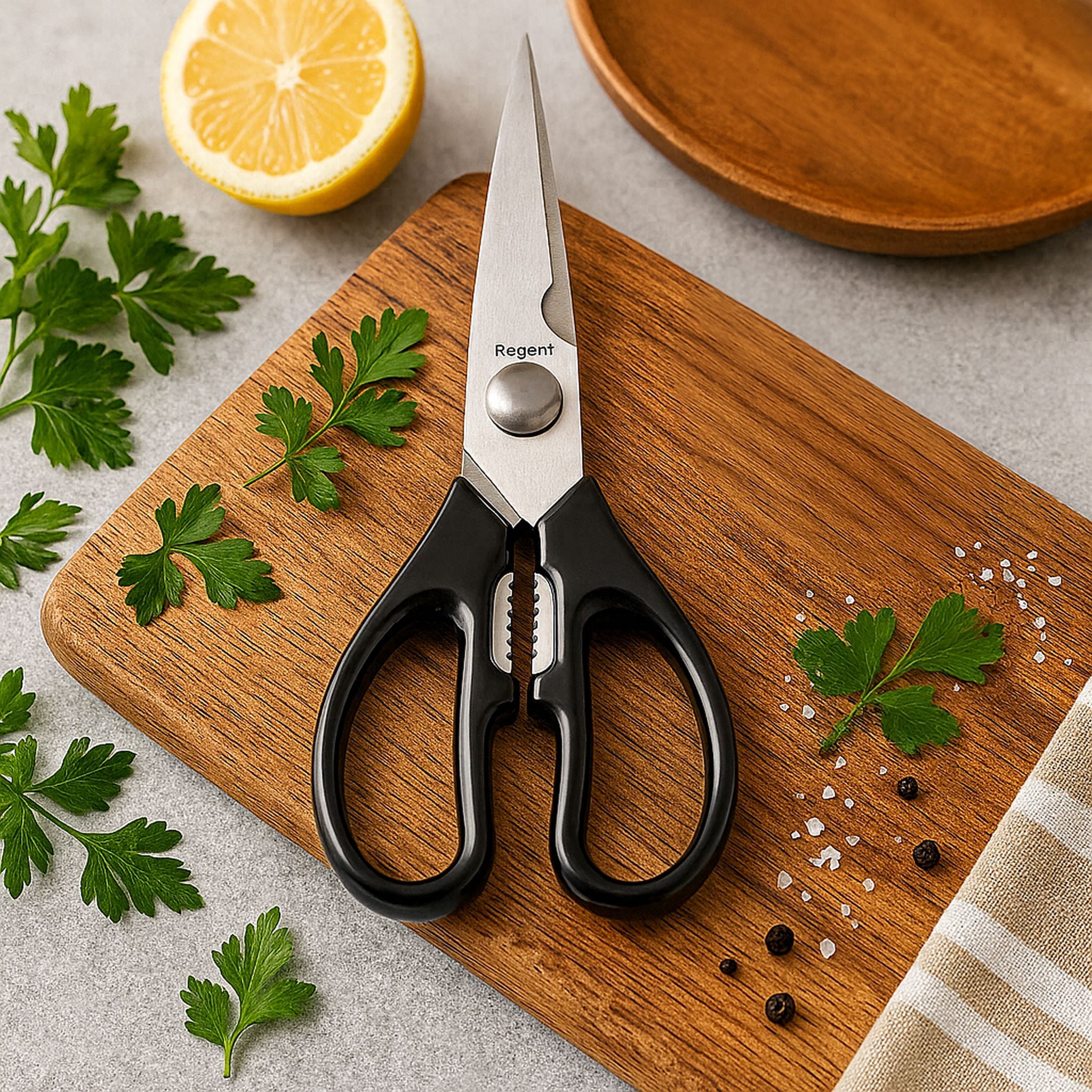 REGENT KITCHEN SCISSOR BLACK AND GREY, 190MM Engineered for precision cutting tasks in any kitchen, these Regent kitchen scissors deliver reliable performance through their stainless steel blade length and ergonomic black and grey design. The robust construction handles everything from fresh herbs and poultry to vegetables and packaging with effortless control. Dual-purpose functionality makes them indispensable for both food preparation and general kitchen duties. The comfortable grip reduces hand fatigue during extended use, while the balanced weight distribution ensures accurate cuts every time. Ideal for professional caterers and home cooks alike, these scissors combine durability with practical versatility. Easy to clean and maintain, they're a kitchen essential.
