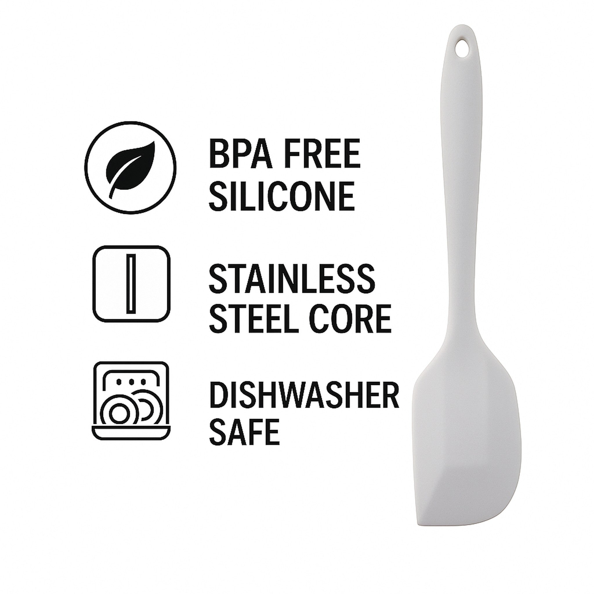Our BPA free silicone spatula is made of a stainless steel core that is moulded with non-toxic heat-resistant to 230 deg. C food safe silicone. Heat resistant does not mean heat proof. Do not rest it on a hot pan for a long time.