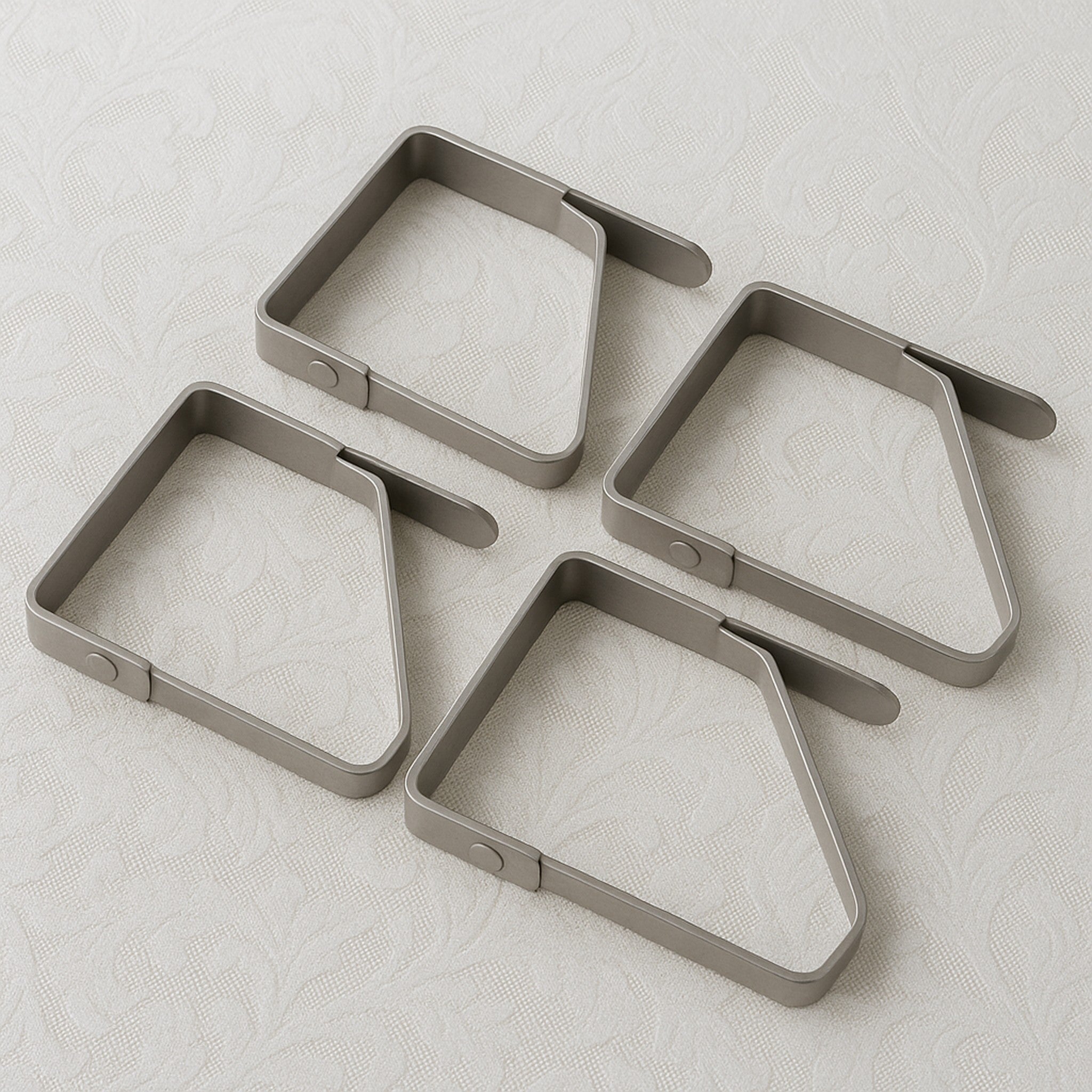 To clean simply wipe the surfaces of the tablecloth clamps with a damp cloth.