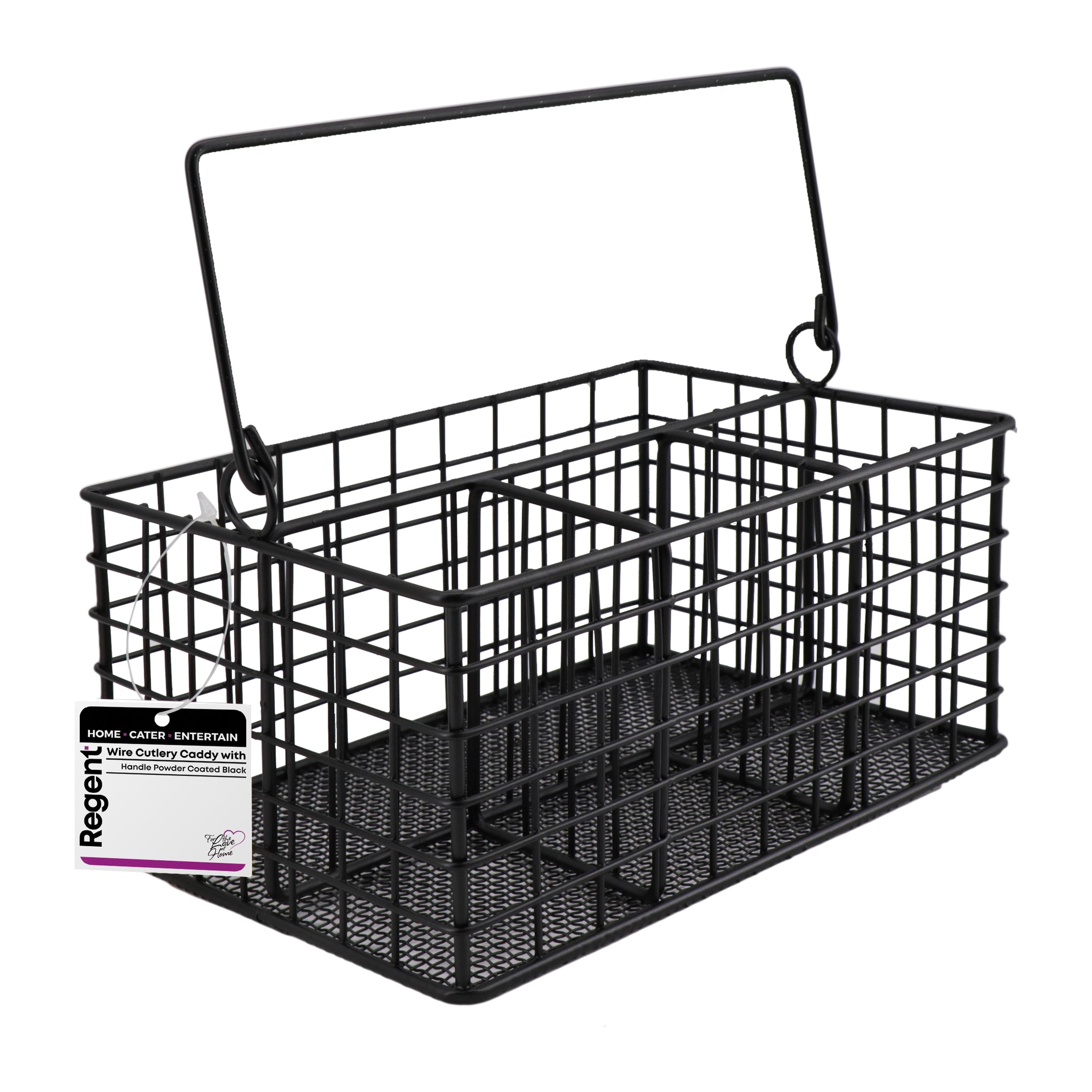 The Regent Kitchen Wire Cutlery Caddy with Handle features a modern, durable powder-coated black finish and a convenient handle for easy transport. Its open wire design keeps cutlery organized and allows for quick drying, making it perfect for busy kitchens. Lightweight and portable, this caddy adds a playful touch while helping you keep forks, knives, and spoons neatly arranged and within reach during meals or gatherings.