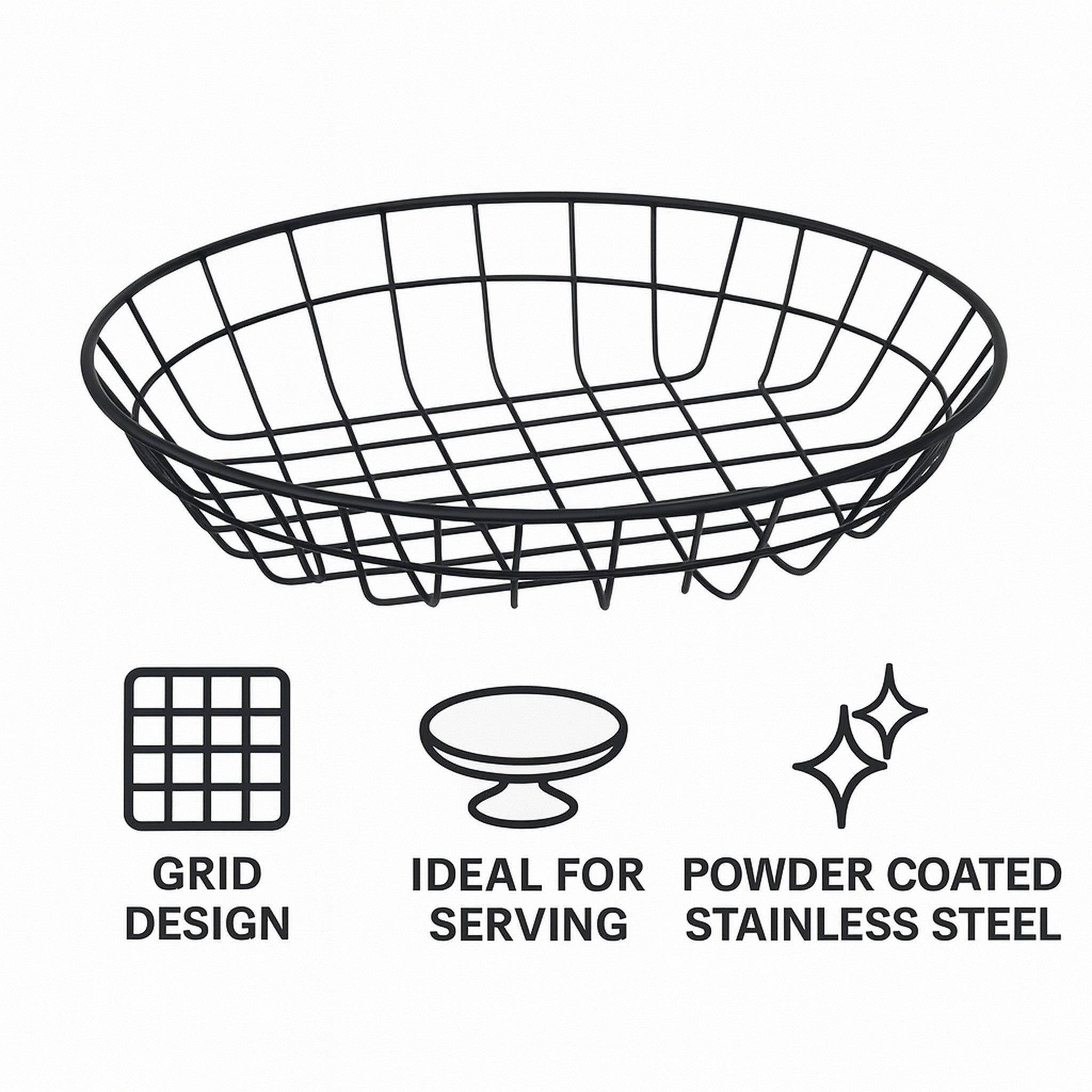 Expertly serve your food with the REGENT WIRE FOOD SERVING BASKET. This round trendy basket is powder coated in sleek black for a professional finish. Measuring at 255mm in diameter and 50mm in height, it provides ample space for your dishes while adding a touch of elegance to your dining experience.