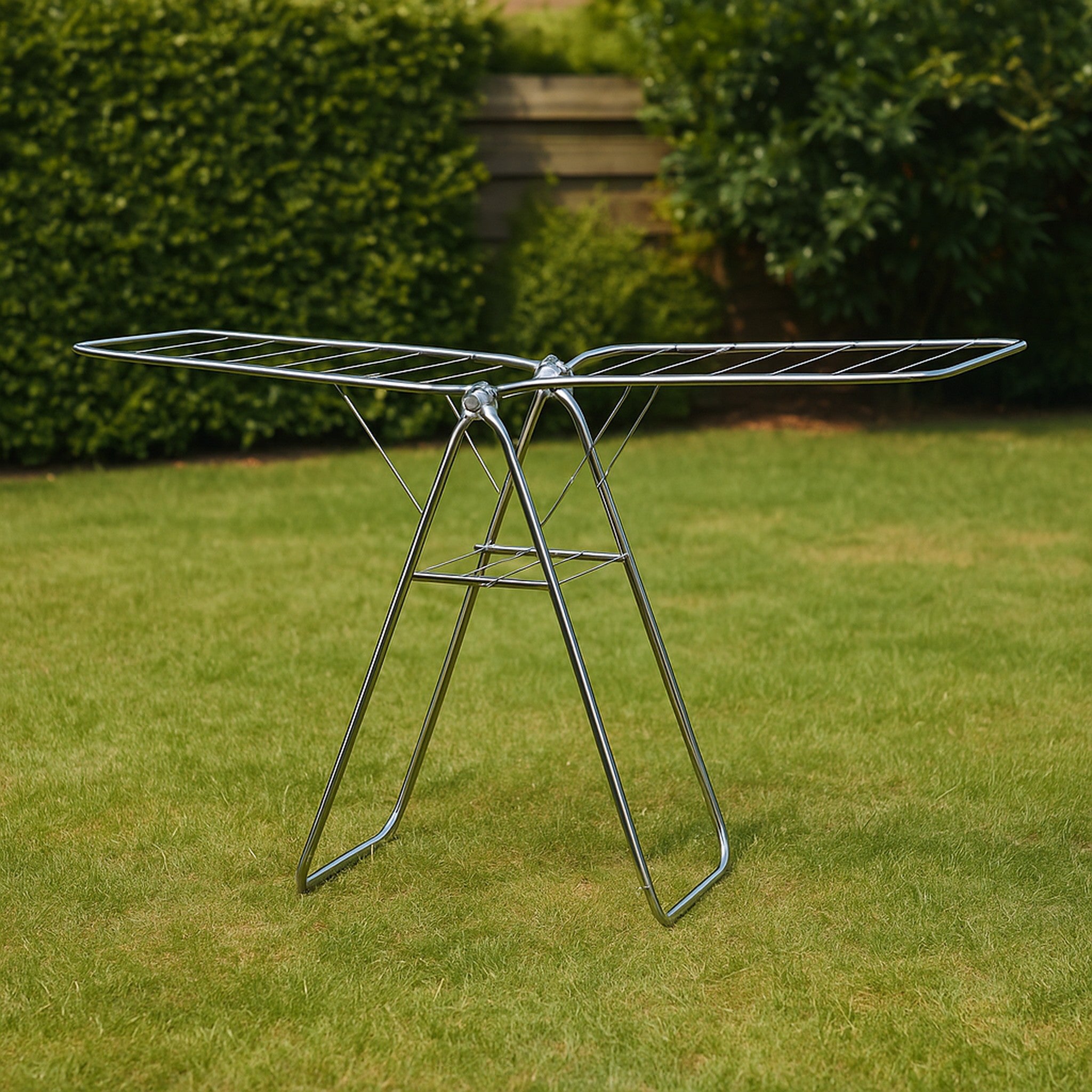 Introducing the new and contemporary 2 layer foldable clothes drying rack. Ideal for those who need to dry clothes in constrained areas, as the wings are adjustable for height and length.