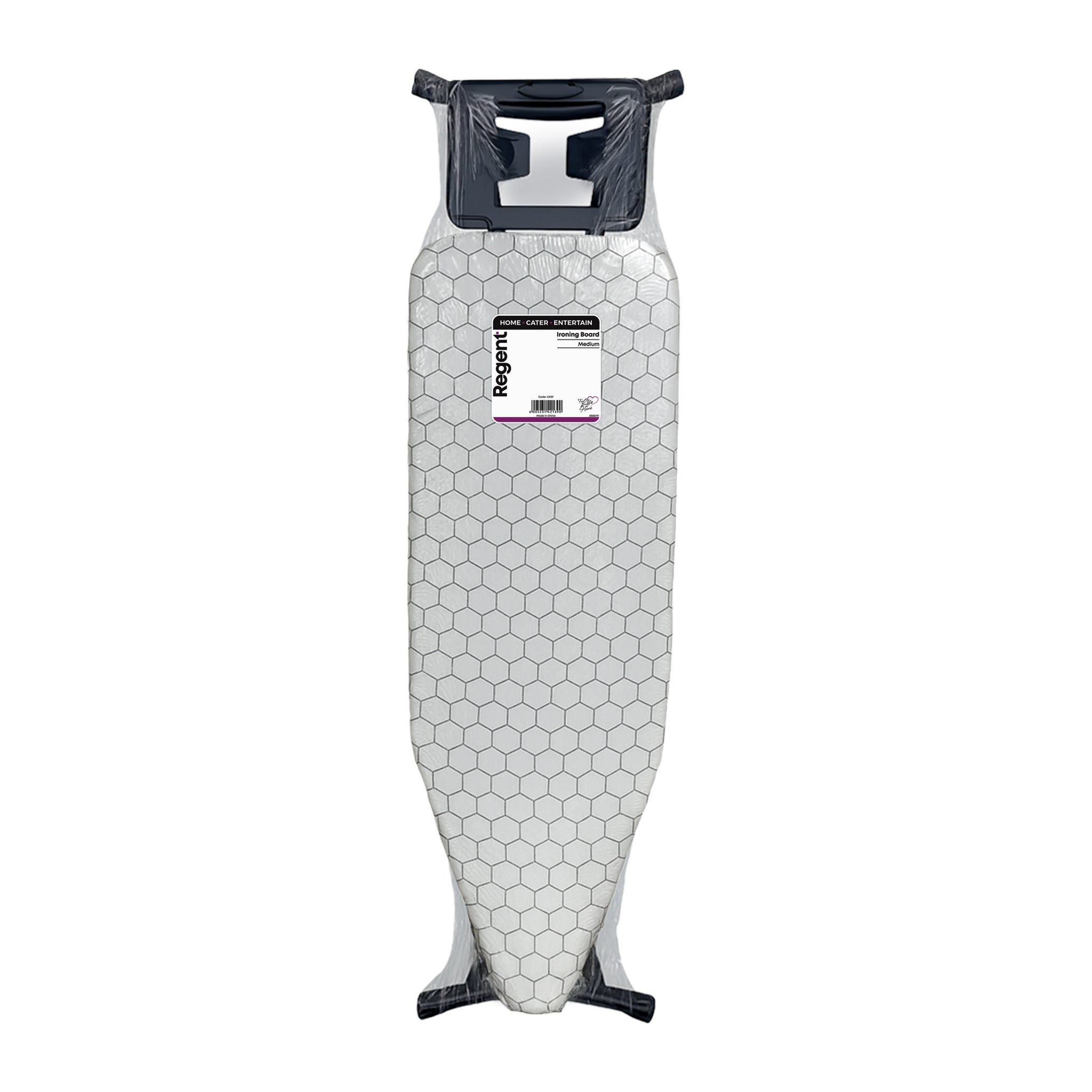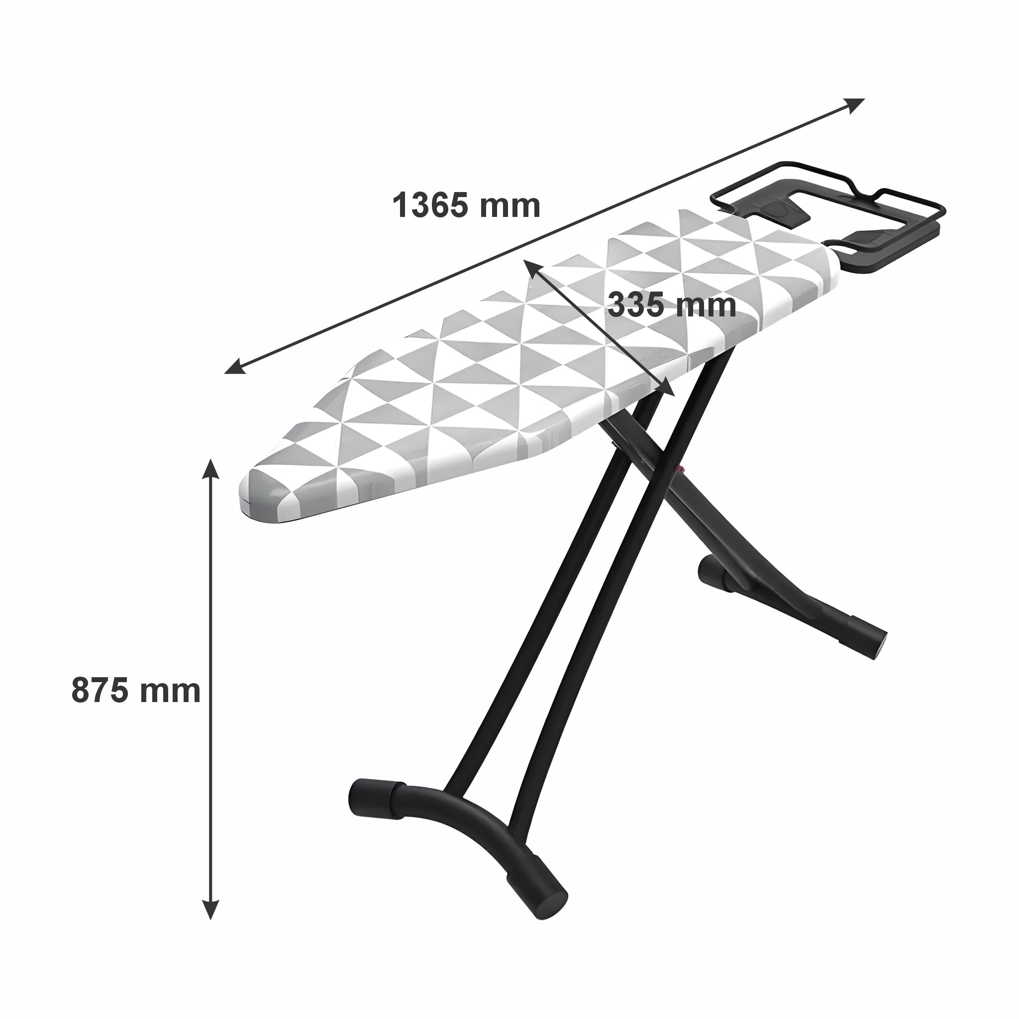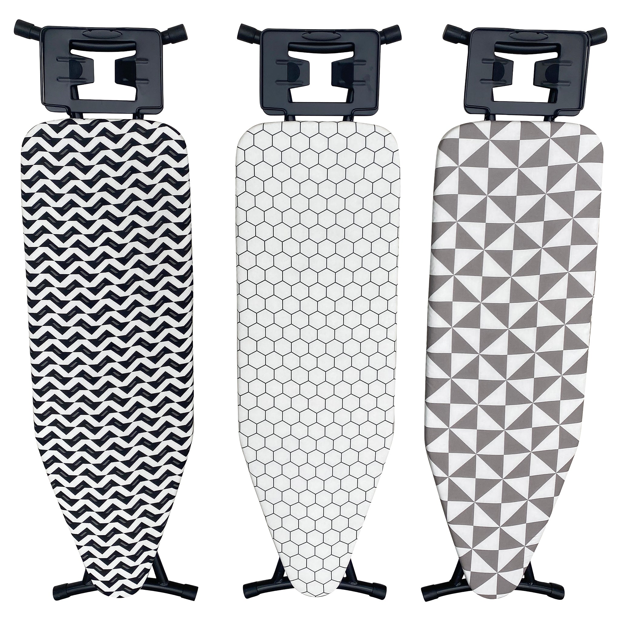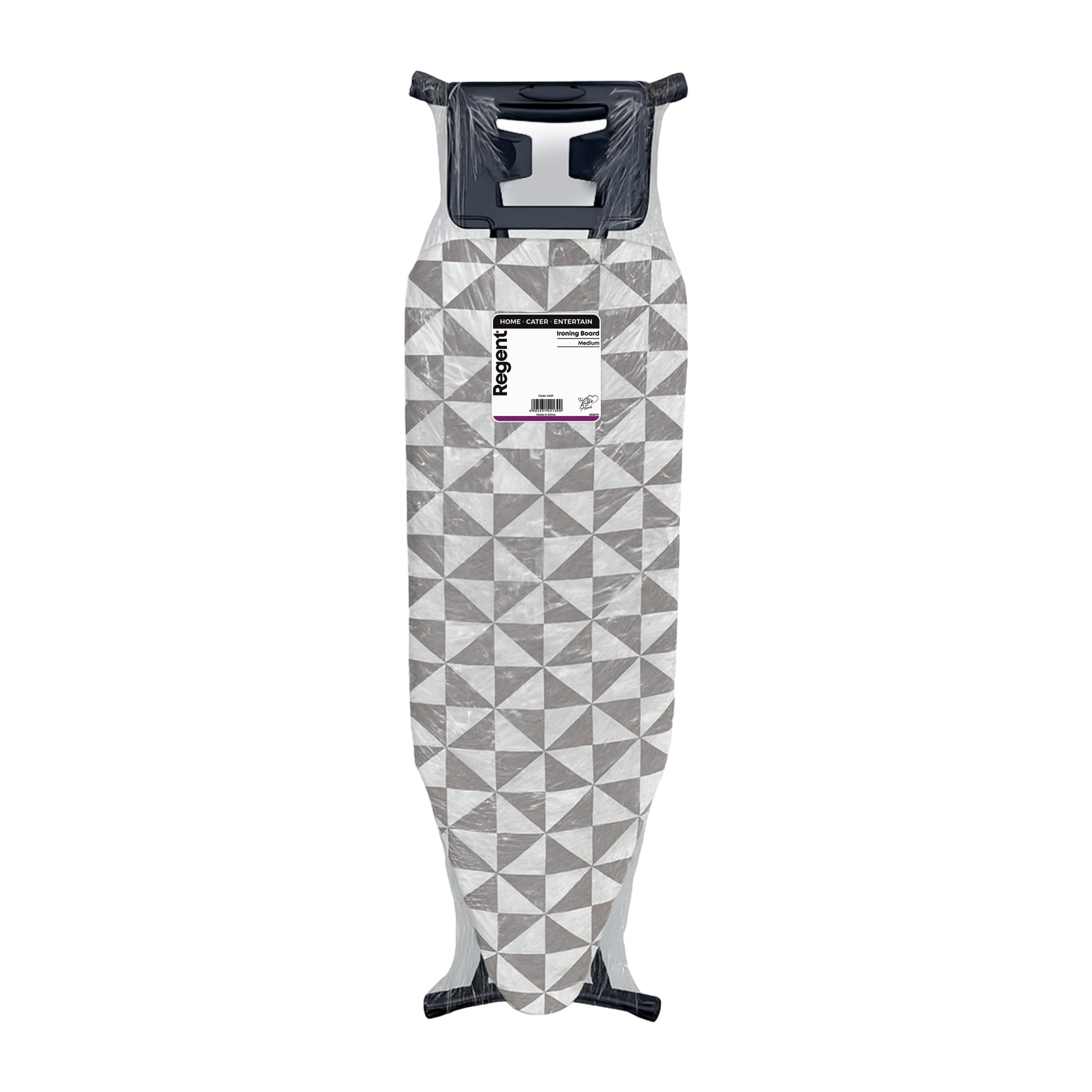 These Regent Medium Ironing Boards are available in assorted black, white and grey geometric modern designs, (1300x330x850mm) These versatile ironing boards offer a compact yet efficient surface ideal for smaller spaces or quick ironing tasks. Its reduced size enhances portability and storage convenience without sacrificing functionality. This makes it perfect for users who need a practical solution for everyday ironing while maintaining ease of handling. The board’s sturdy design ensures stability, and its ergonomic height supports comfortable use, making it a versatile choice for both home and professional settings where space optimization is important.
