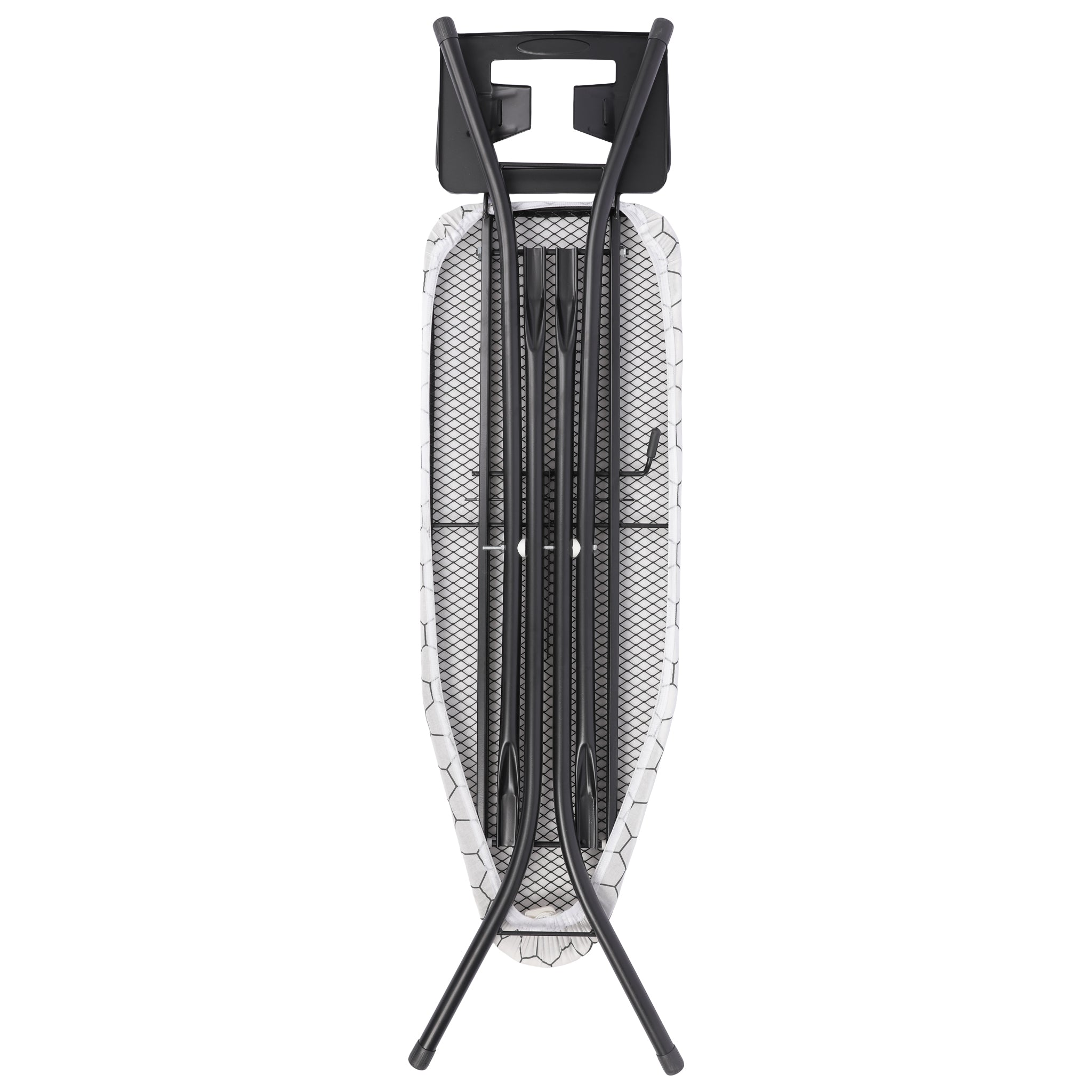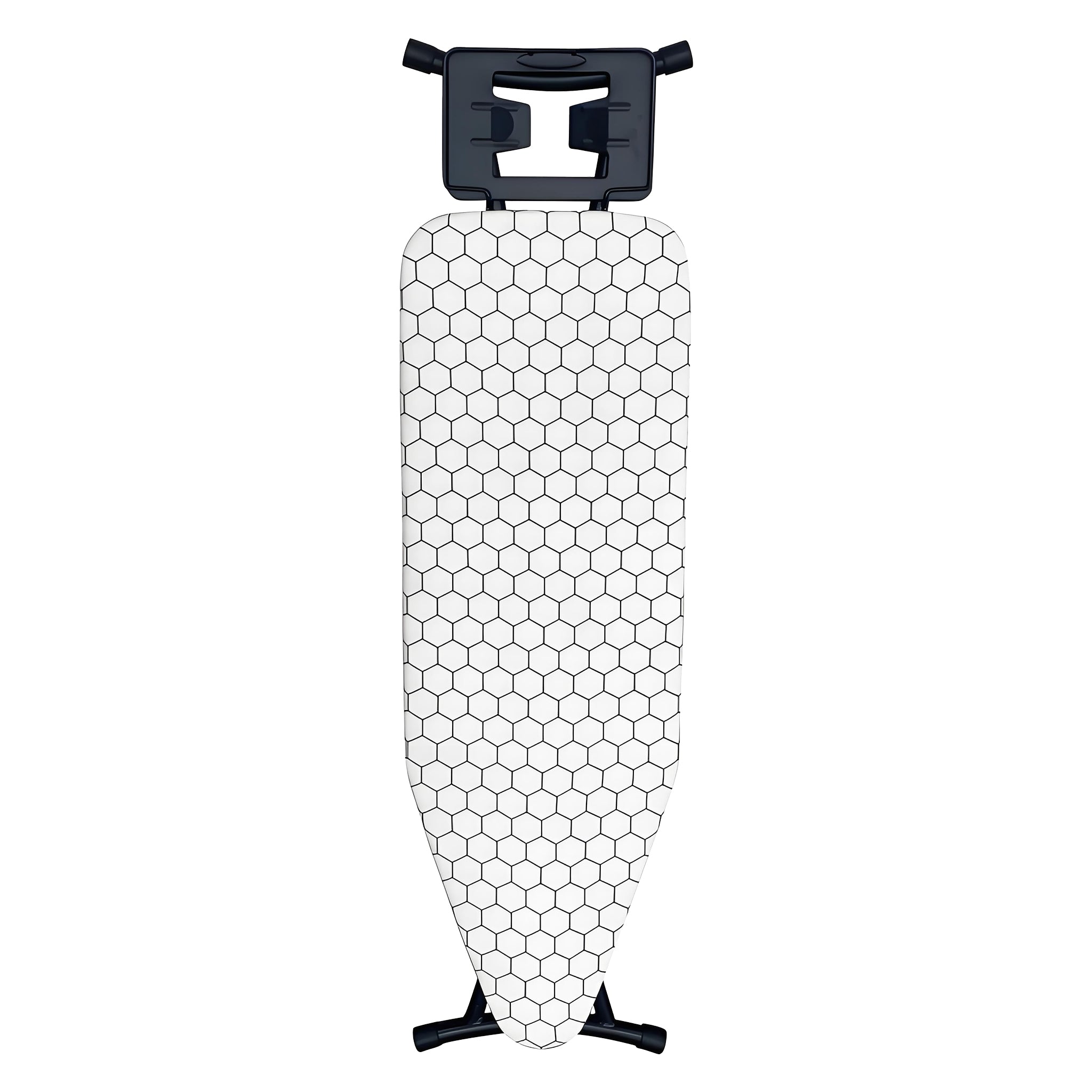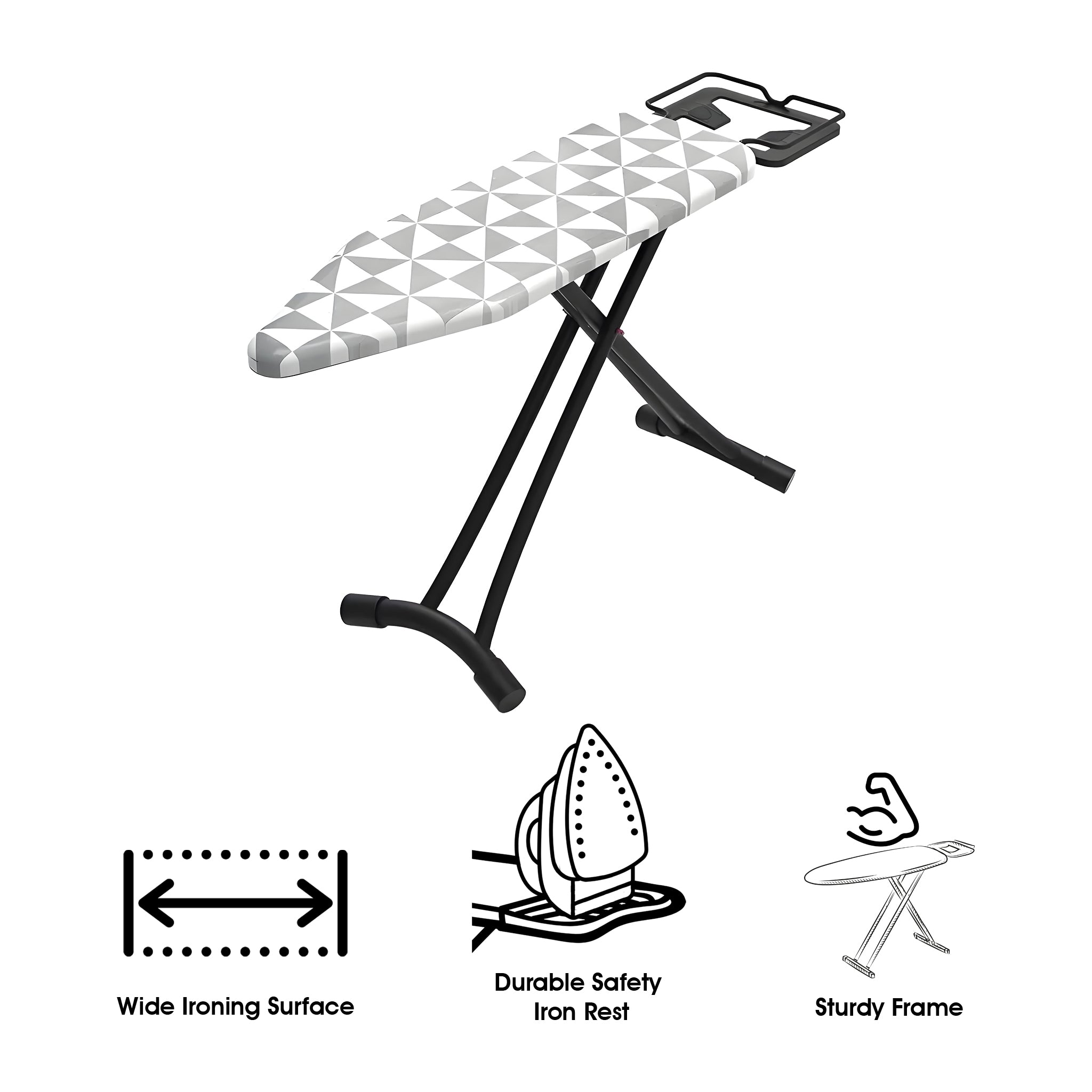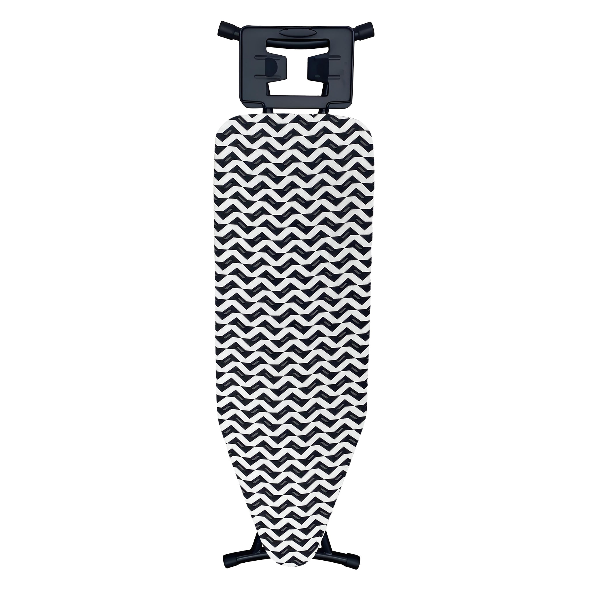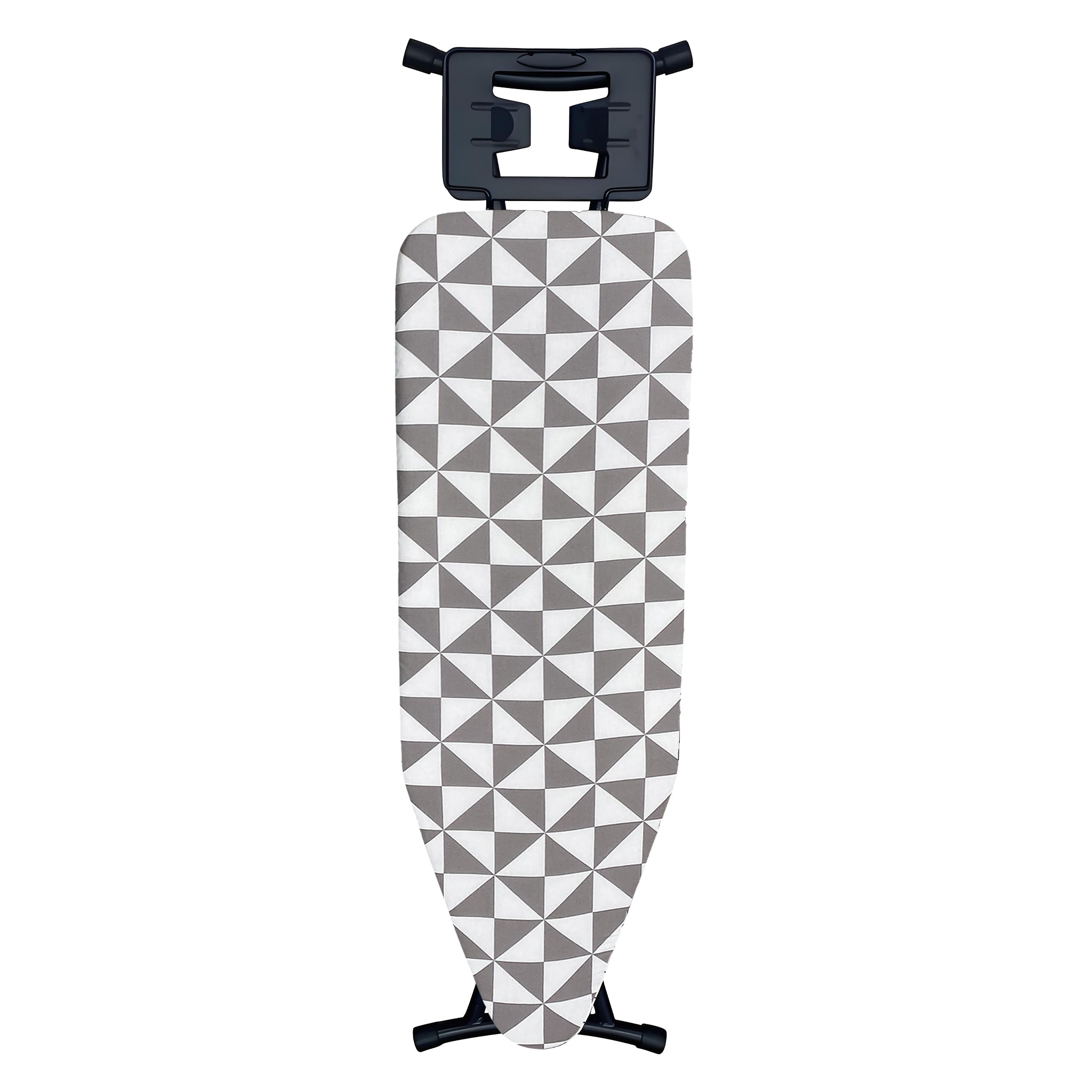 These Regent Medium Ironing Boards are available in assorted black, white and grey geometric modern designs, (1300x330x850mm) These versatile ironing boards offer a compact yet efficient surface ideal for smaller spaces or quick ironing tasks. Its reduced size enhances portability and storage convenience without sacrificing functionality. This makes it perfect for users who need a practical solution for everyday ironing while maintaining ease of handling. The board’s sturdy design ensures stability, and its ergonomic height supports comfortable use, making it a versatile choice for both home and professional settings where space optimization is important.