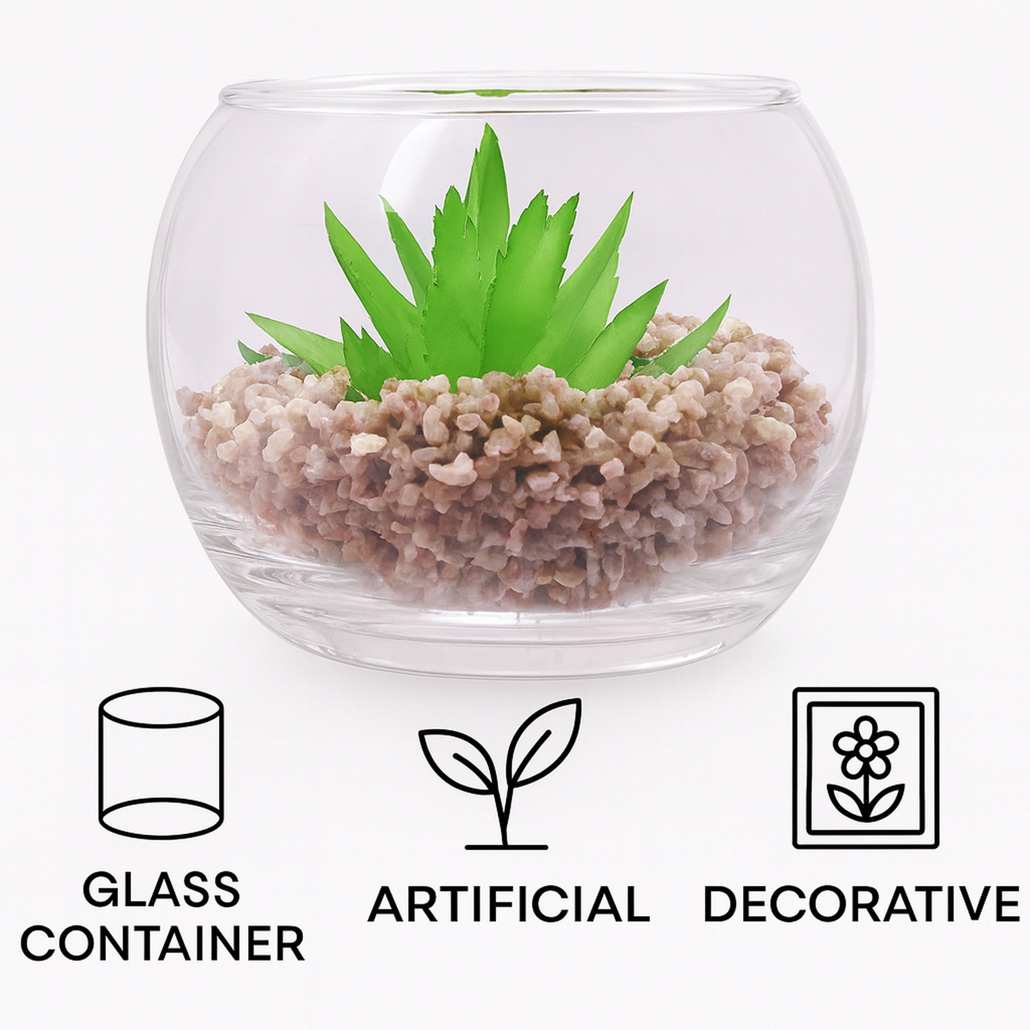 This artificial faux succulent nestled in the tiny stones is made of pet safe, odourless PU plastic and is solidly attached to the bottom of the pretty clear glass pot.