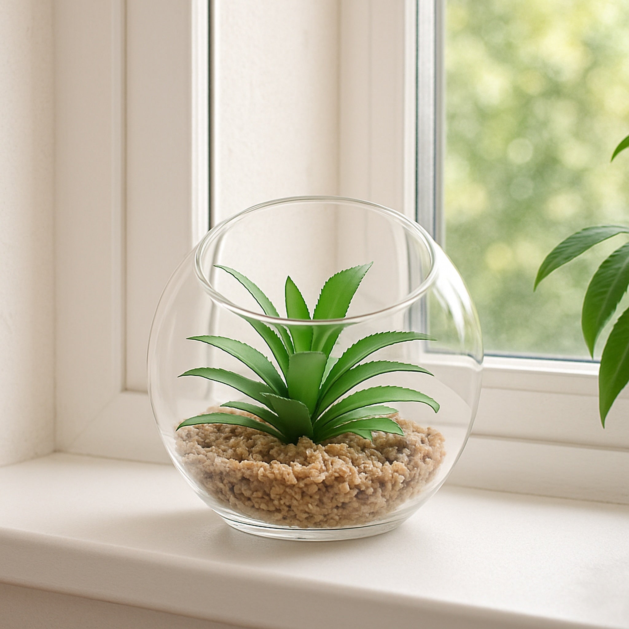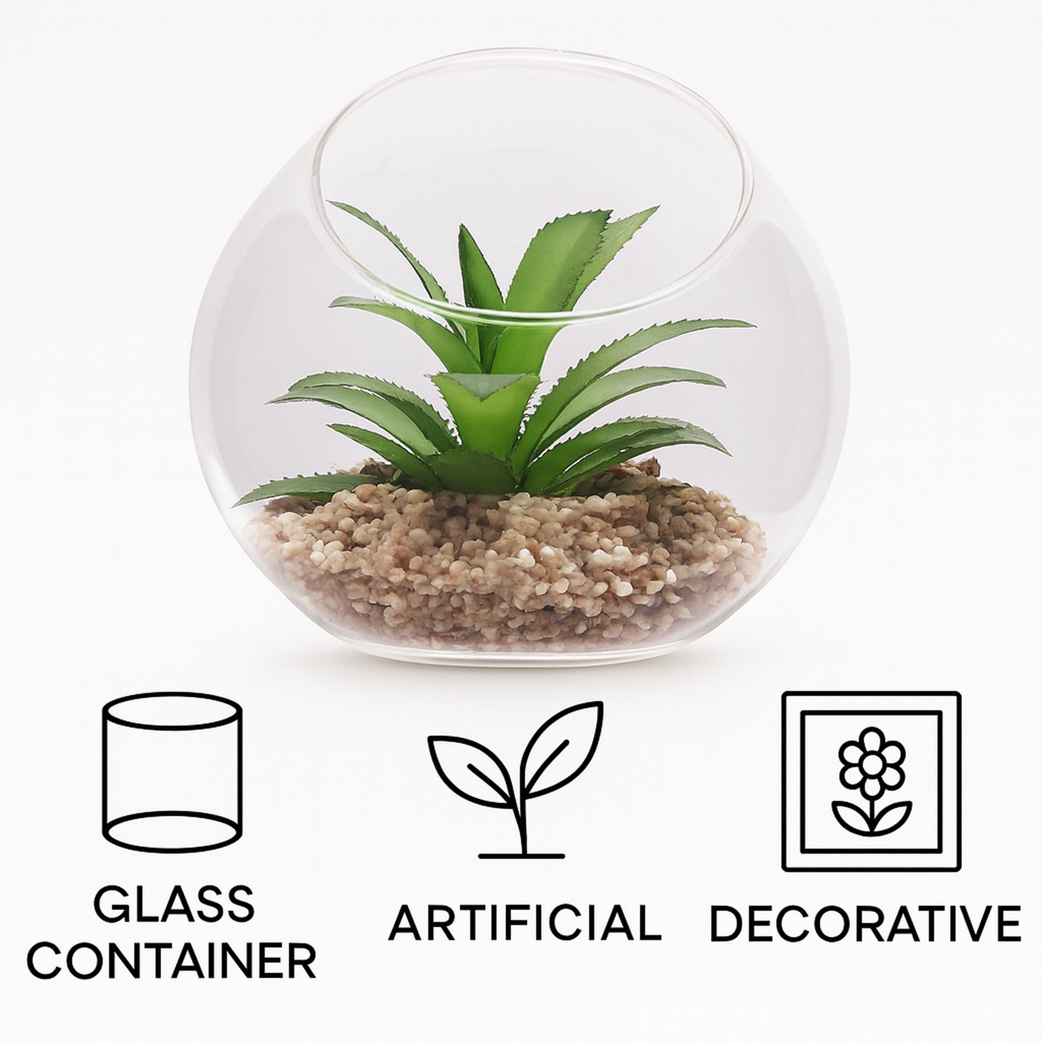 This artificial faux succulent nestled in the tiny stones is made of pet safe, odourless PU plastic and is solidly attached to the bottom of the pretty clear glass sphere.