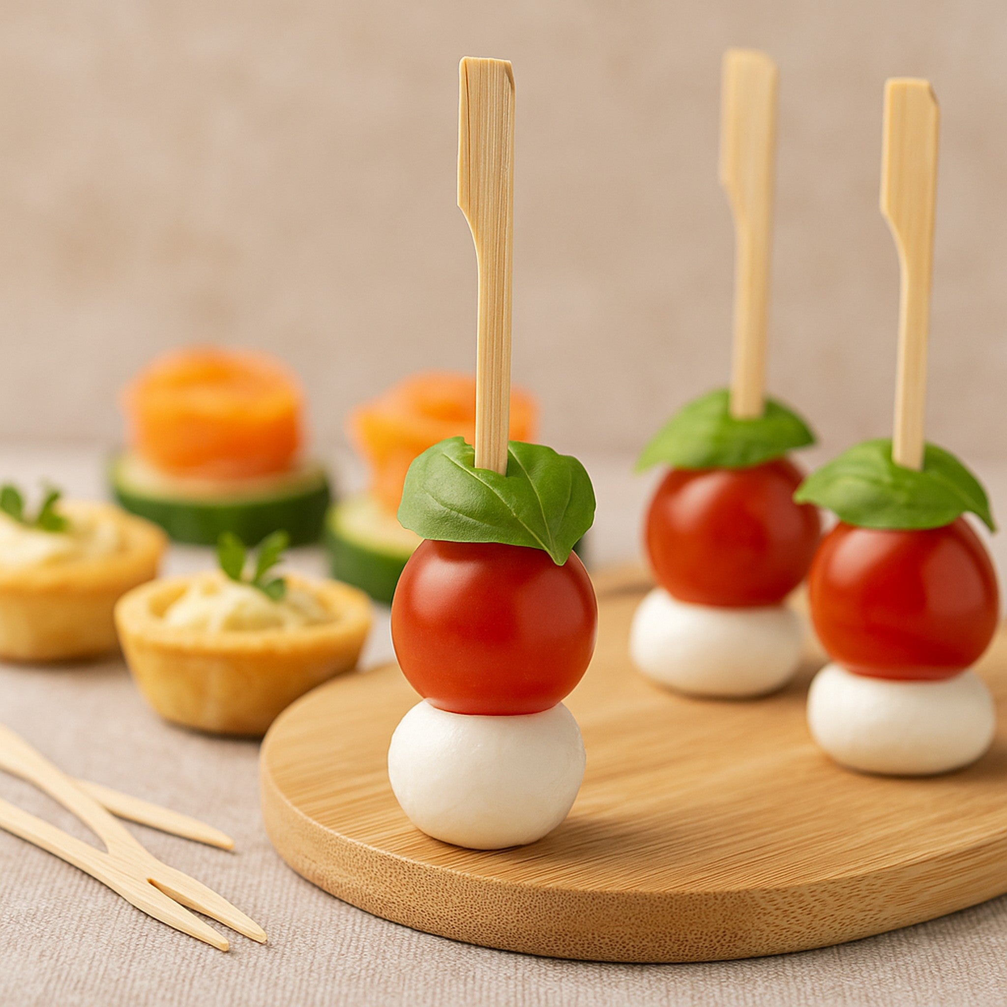 The Regent Disposable Wooden Fork Picks offer a pack of 100 sturdy, 88mm-long picks crafted from natural wood. Perfect for serving appetizers, fruit, finger foods, and garnishes, they combine convenience with eco-friendliness. Their disposable design simplifies cleanup, making them ideal for parties, catering, and events. Lightweight yet durable, these fork picks enhance food presentation while providing a practical, hygienic solution for any occasion.
