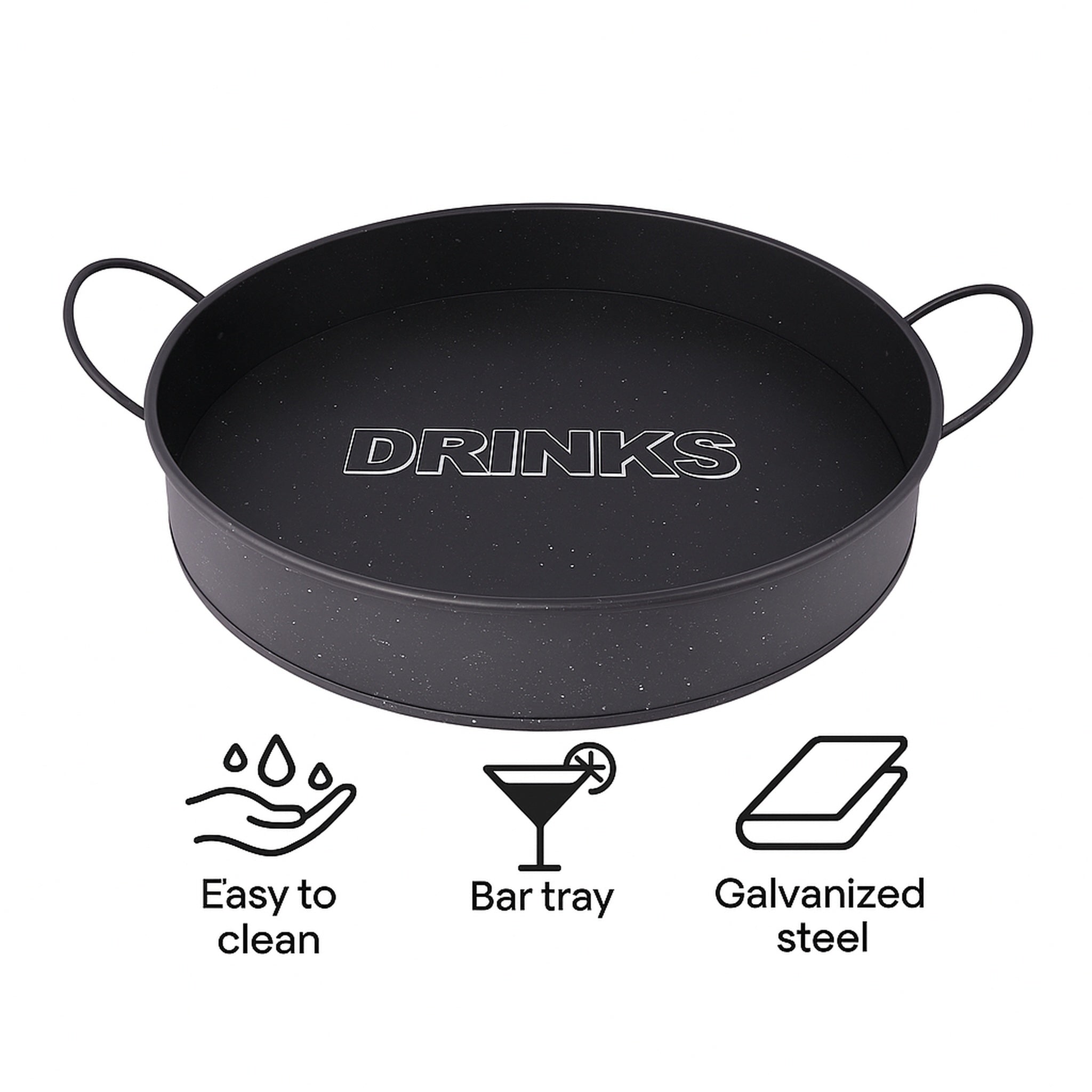 Our Bar Butler galvanized steel tray with 2 handles is powder coated grey with mottled white with a 'DRINKS' print which gives it a pleasing rustic charm appearance.