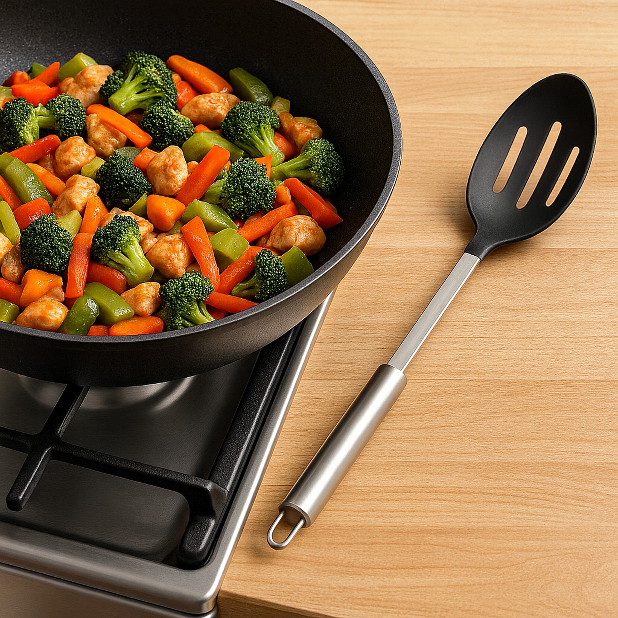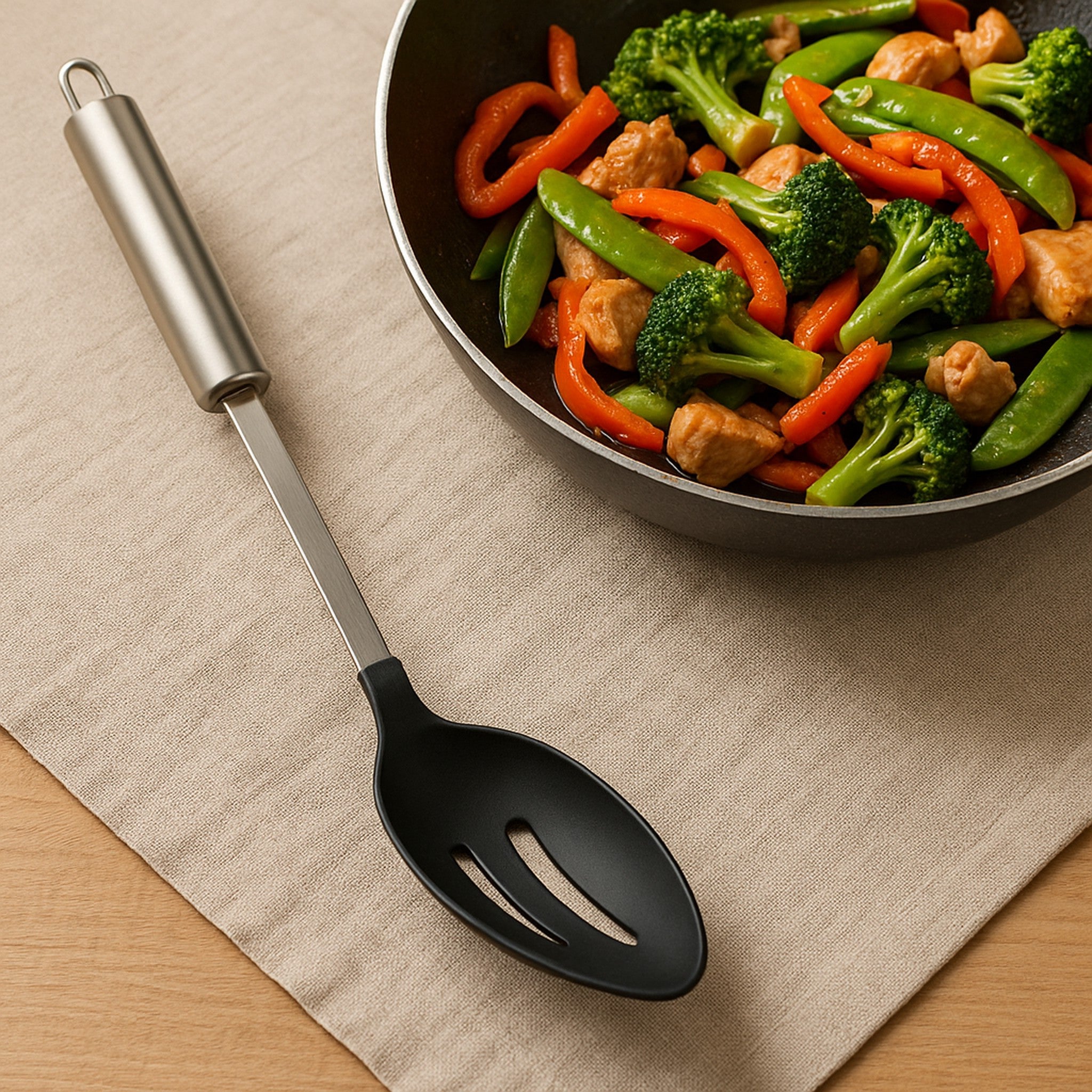 Introducing the REGENT KITCHEN Nylon Slotted Spoon with St Steel Handle. Made with nylon for durability and a stainless steel handle for easy grip. Perfect for stirring and serving your favourite dishes. Upgrade your cooking experience with this versatile kitchen tool.
