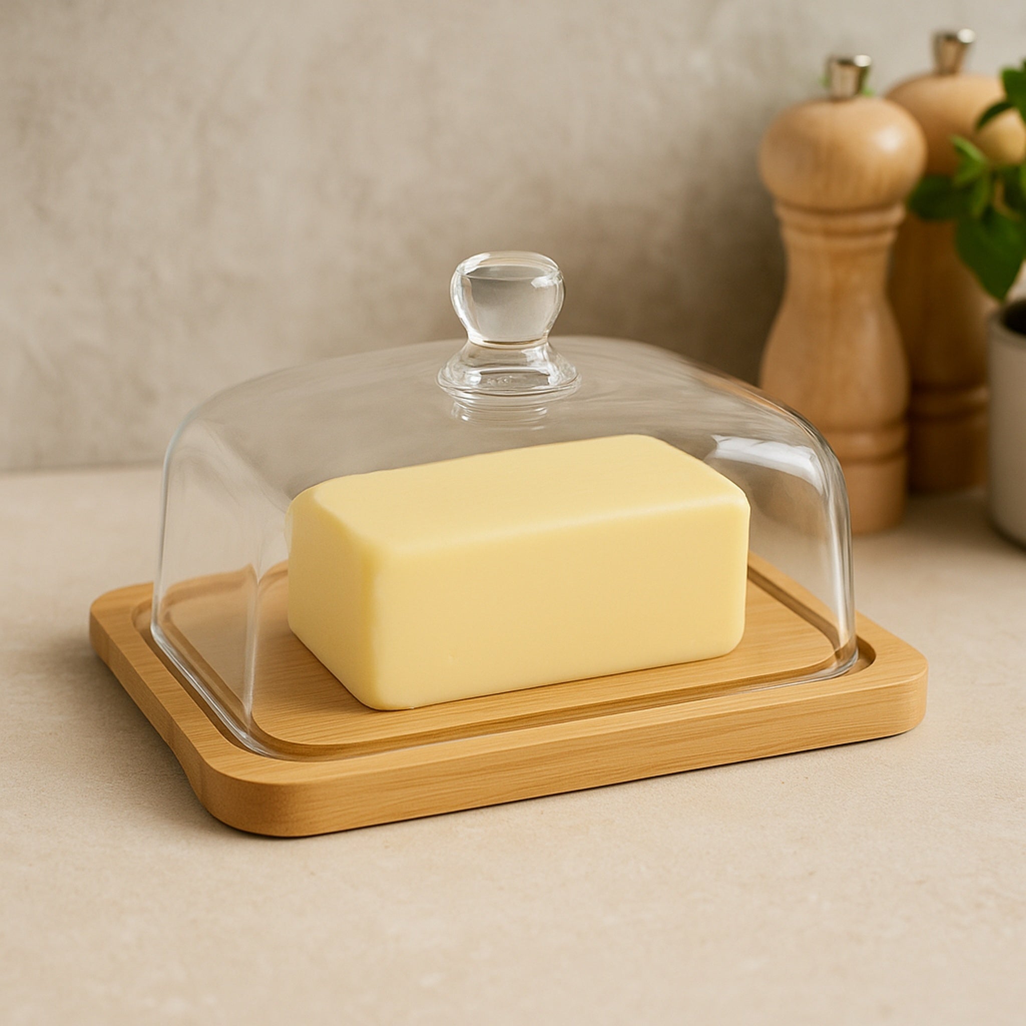 The Regent Butter Dish features a sleek glass lid paired with a natural bamboo base, Its elegant design preserves butter freshness while adding a refined touch to your table setting. The glass lid allows easy visibility, and the bamboo base offers a sturdy, eco-friendly platform. Ideal for both everyday use and special occasions, this butter dish combines functionality with sophisticated style to enhance your dining experience.