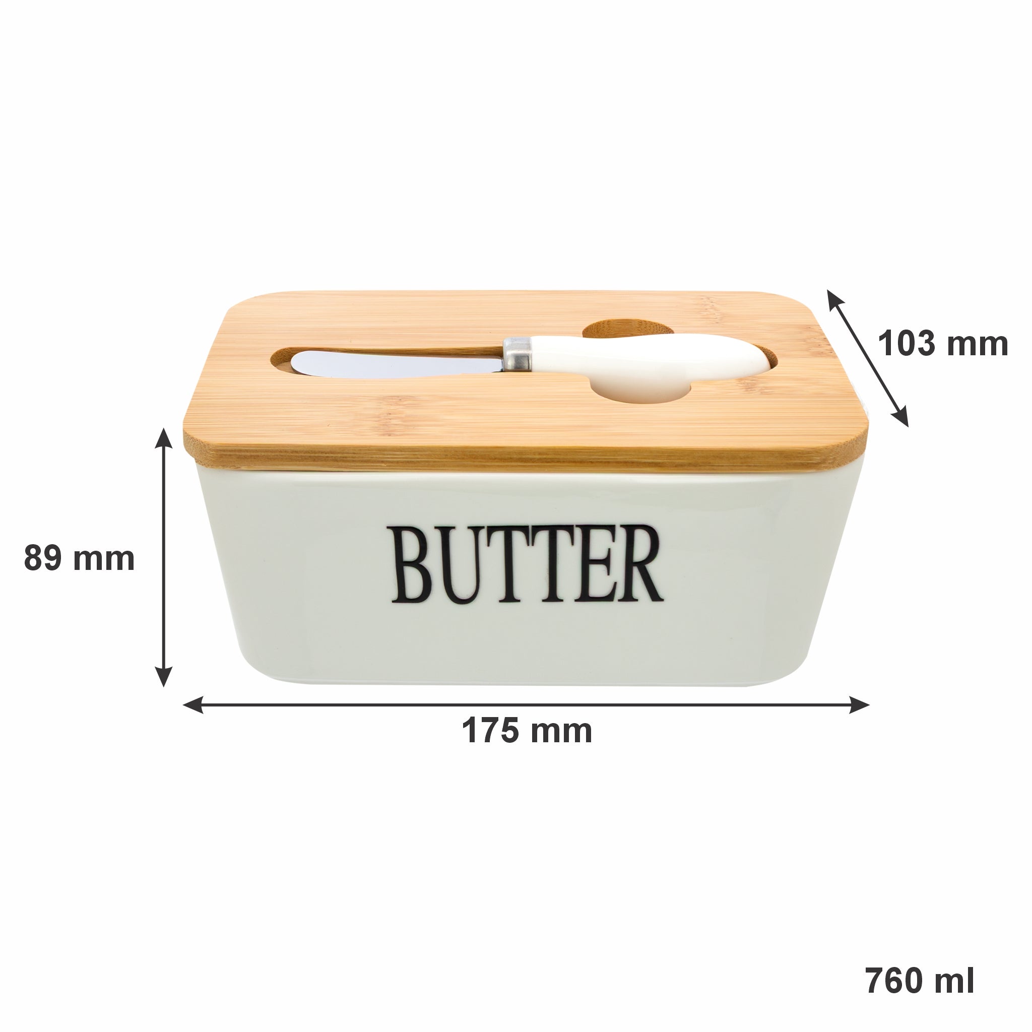The Regent Ceramic Butter Dish in white, measuring 175x103mm, comes with a bamboo lid and a stainless steel knife for added convenience. Its stylish design keeps butter fresh while adding a playful touch to your kitchen or dining table. The bamboo lid provides a natural, airtight seal, and the included knife makes spreading effortless. Perfect for everyday use or entertaining, this butter dish combines practicality with fun, making butter serving both easy and charming.