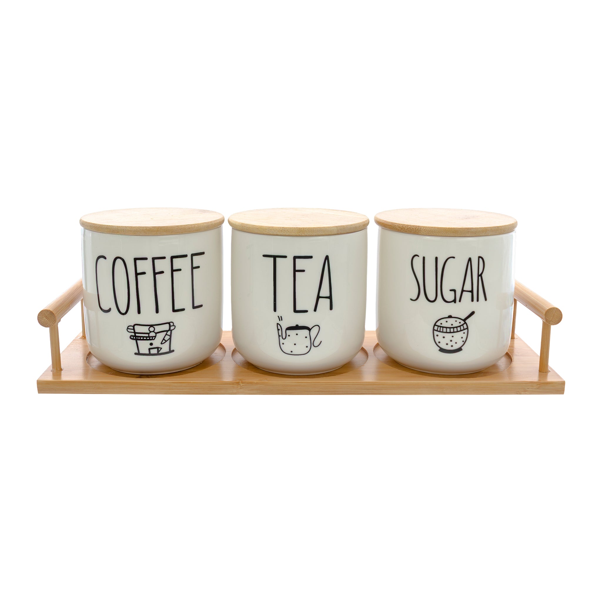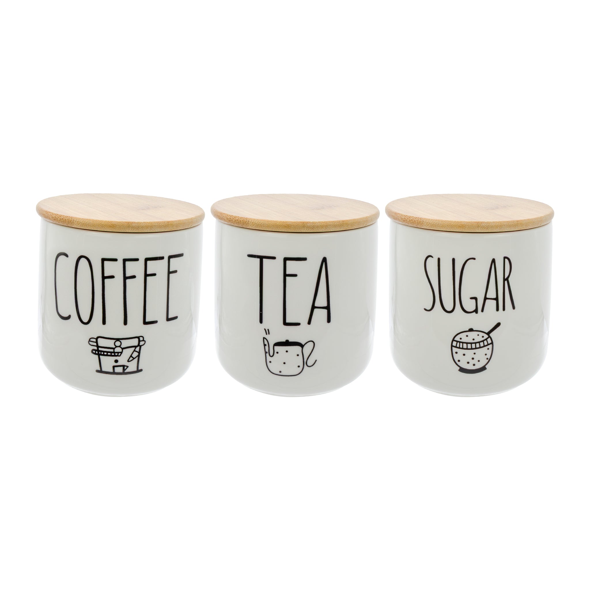 The Regent Coffee, Sugar, and Tea Ceramic Jars with Bamboo Lids and Tray feature charming, inscribed labels of Coffee, Tea and Sugar, that add a fun and personalized touch to your kitchen. Each jar holds 500ml perfect for keeping your essentials fresh and organized. The bamboo lids provide a natural, airtight seal, while the matching tray keeps everything neatly in place. This playful set combines style and practicality, making your daily coffee and tea rituals more enjoyable and visually delightful.