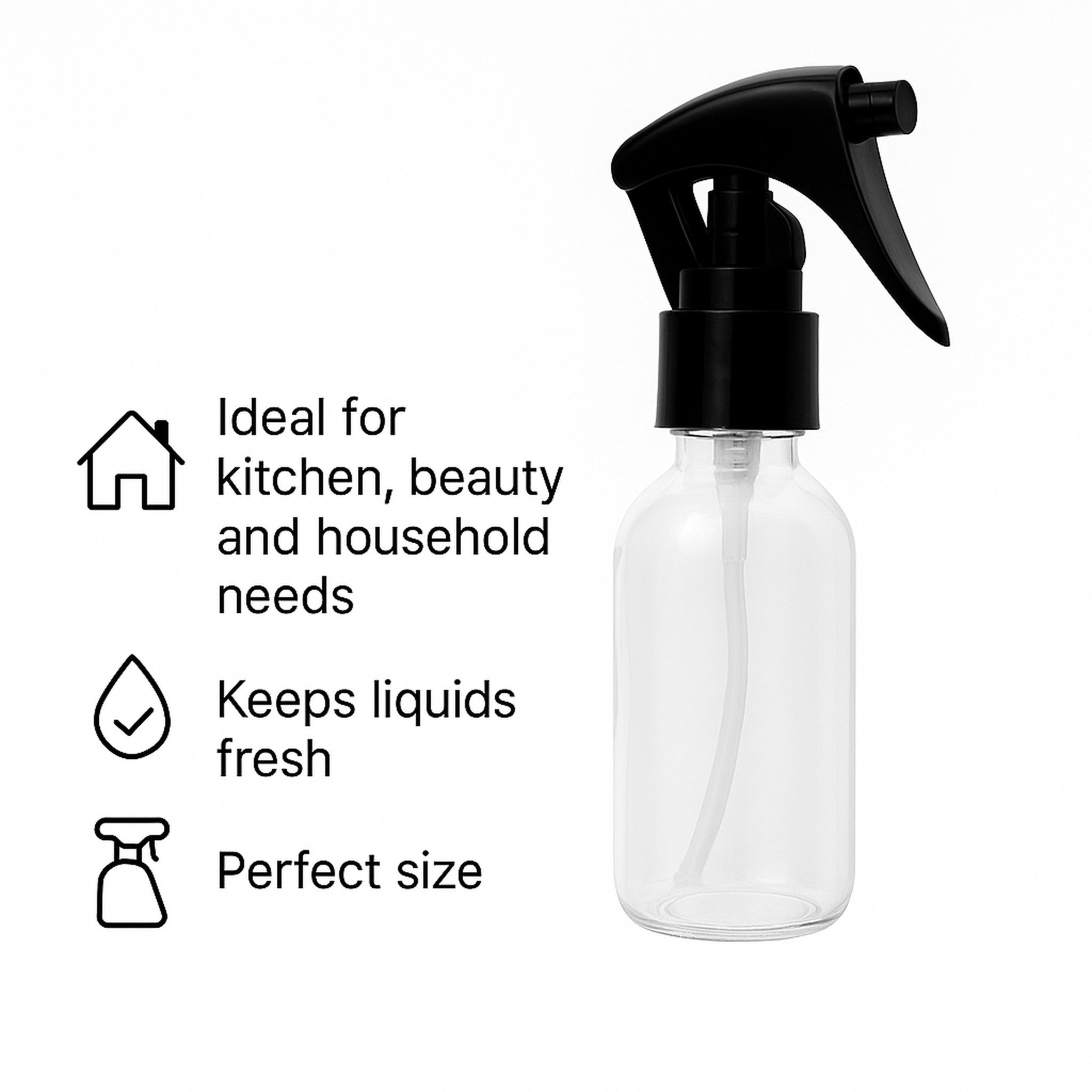 The Regent Glass Spray Bottles 4 Pack combines convenience and style in a compact 60ml size. Each bottle features a clear glass body with a sleek black lid, perfect for dispensing oils, vinegars, or cleaning solutions with precision. Their durable design ensures long-lasting use, while the spray mechanism offers easy, controlled application. Ideal for kitchen, beauty, or household needs, these bottles keep your liquids fresh and accessible.