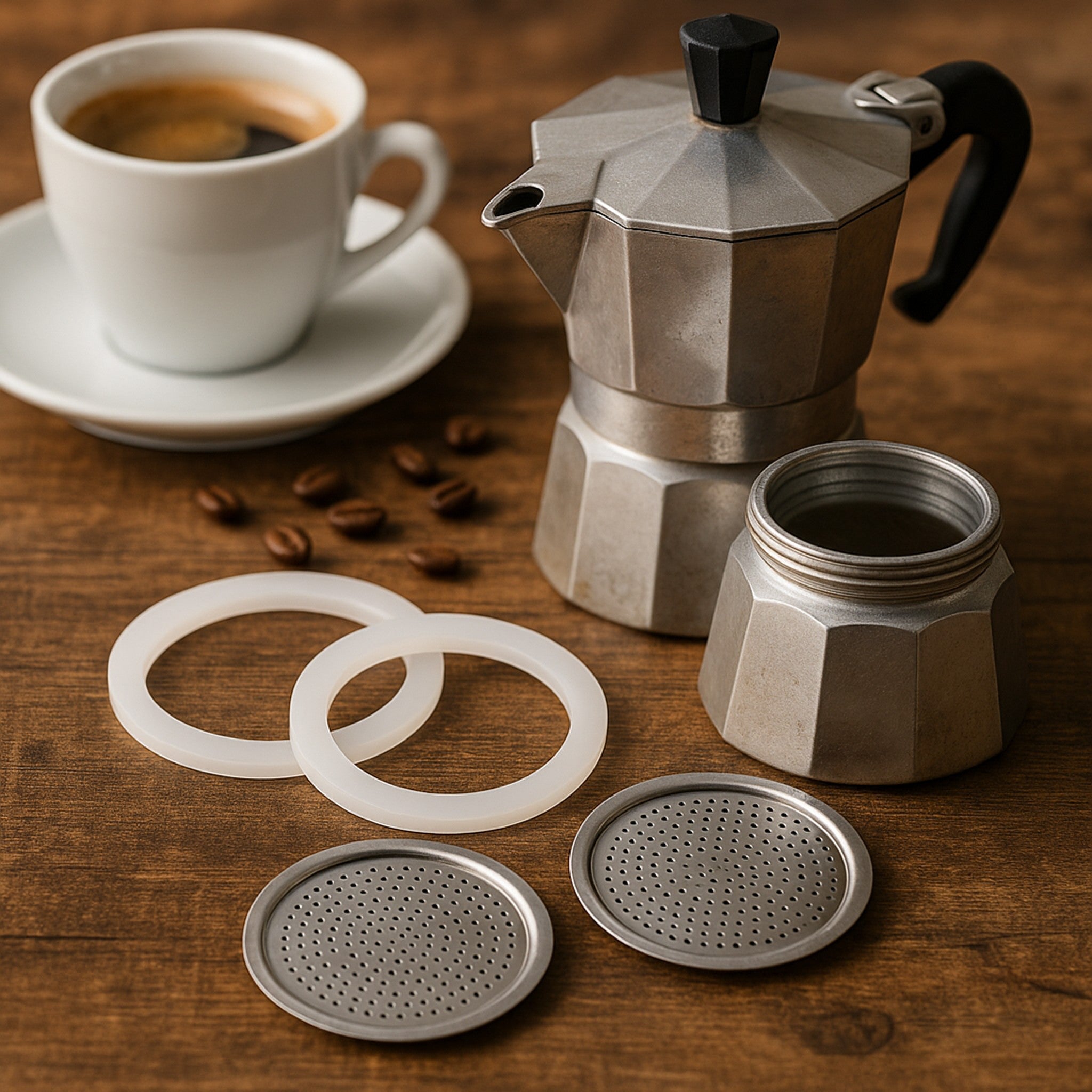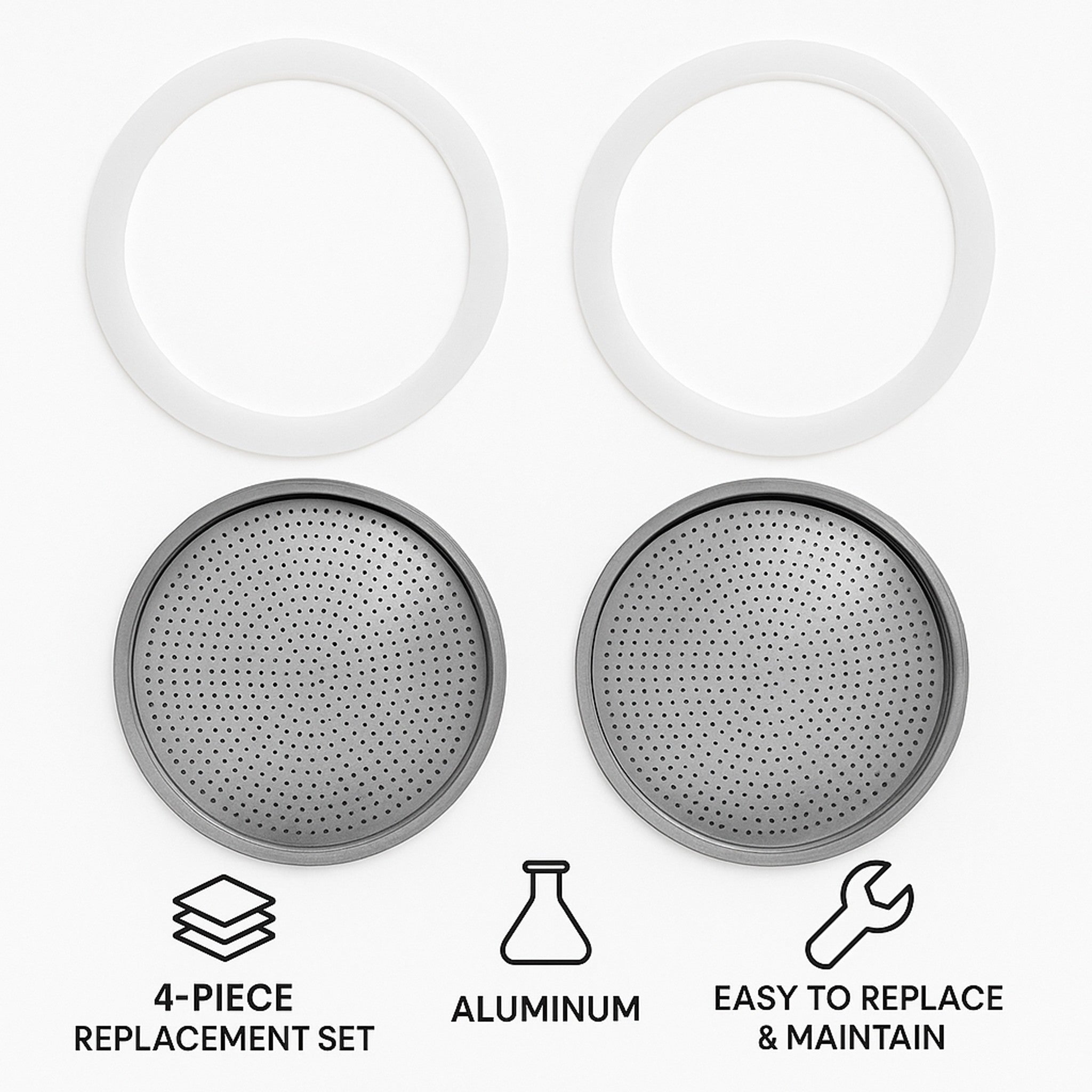 Ensure your Regent Aluminium 3-Cup Coffee Maker performs at its best with this 4-piece replacement set, including two filters and two rubber seals (55mm diameter). Designed for a perfect fit, these components restore optimal filtration and a secure seal, preserving the rich flavor of your coffee while preventing leaks. Easy to replace and maintain, this set extends the life of your coffee maker and guarantees a consistently smooth brew every time. Ideal for coffee enthusiasts who value quality and reliability.