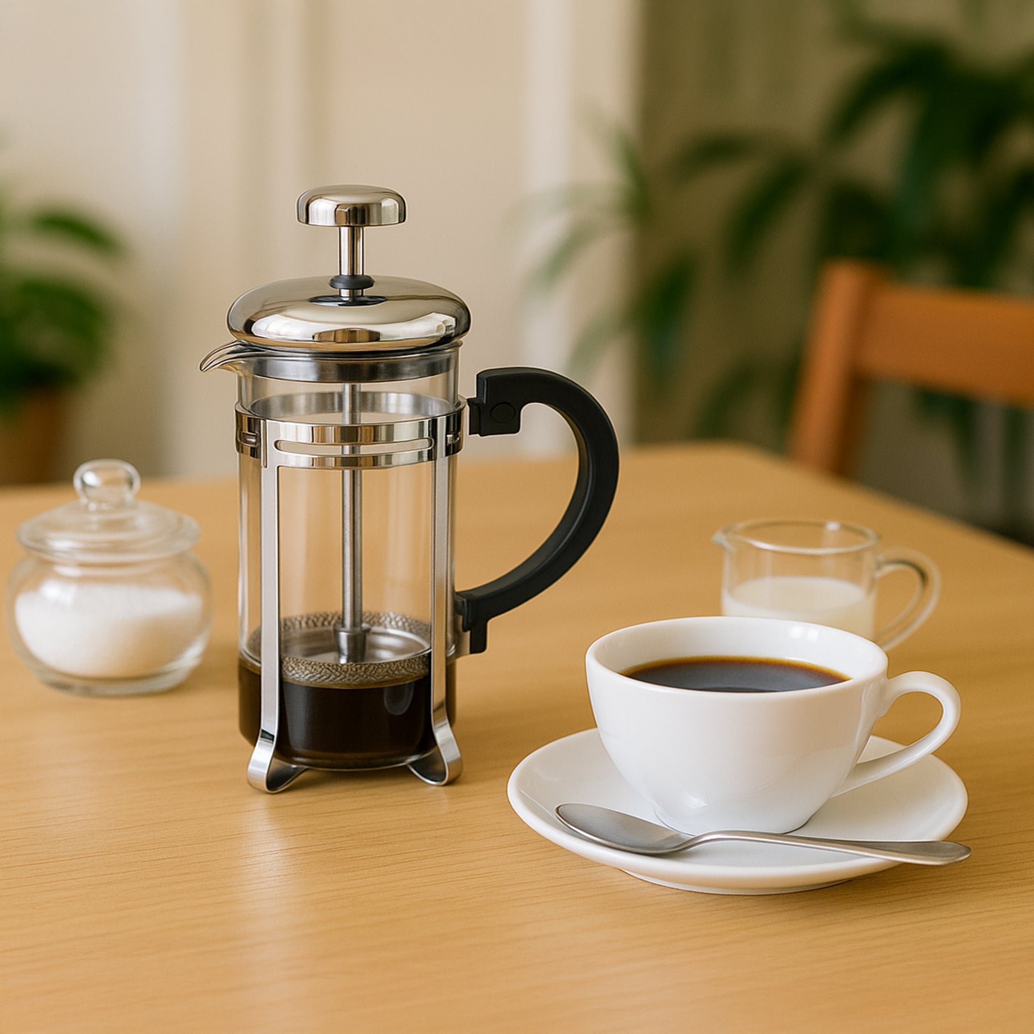 The Regent Coffee Plunger with Chrome Frame offers a sleek and durable design for brewing up to 3 cups (300ml) of rich, aromatic coffee. Its sturdy chrome frame provides stability and a polished look, while the stainless steel plunger ensures smooth filtration for a clean, full-flavored cup every time.