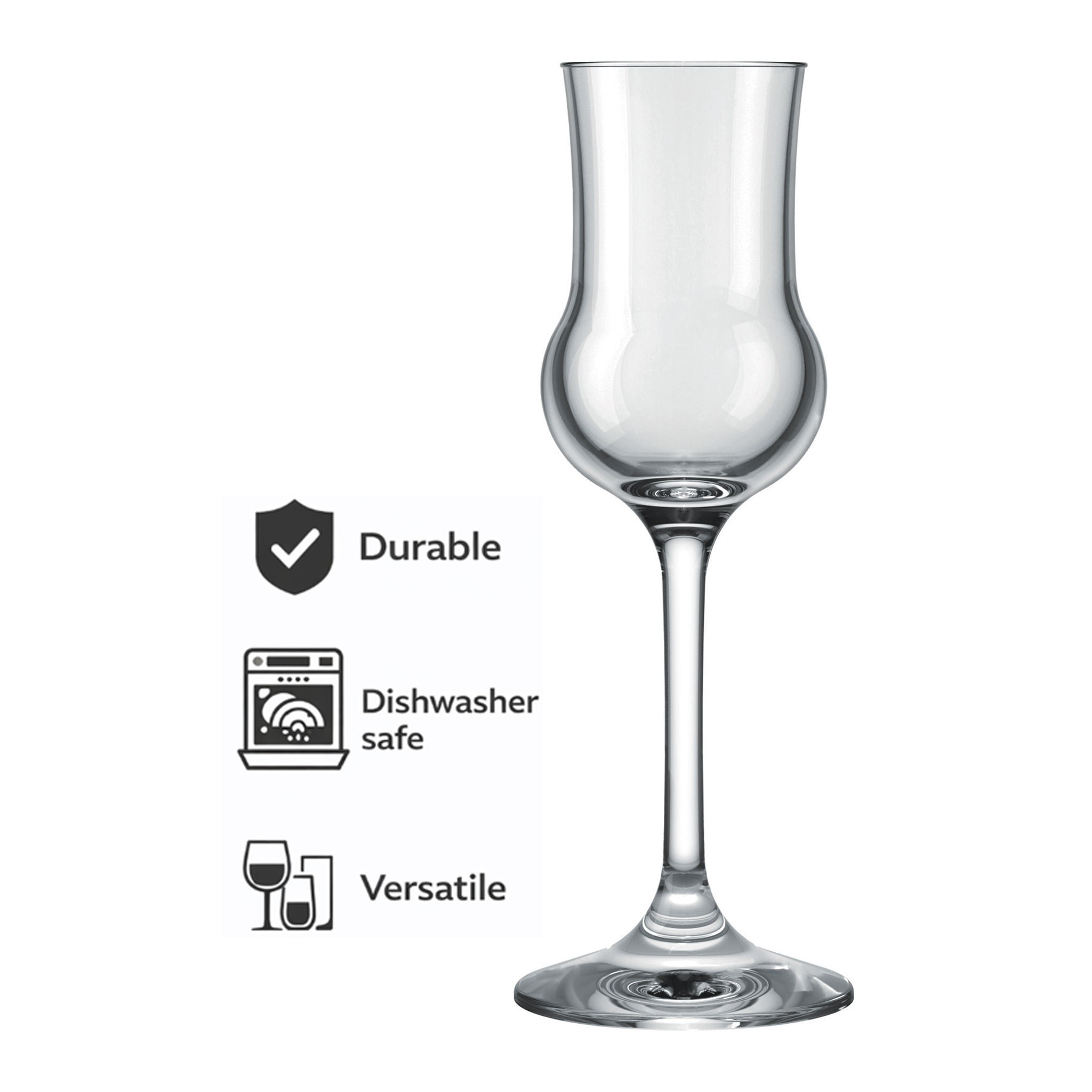 The Nadir Alambic Glasses are perfect for tasting special drinks on special occasions. With a capacity of 90ml, these glasses provide a unique experience when enjoying spirits such as Grappa. In addition to Grappa, these glasses are also ideal for tasting other spirits, such as liqueurs, brandies, and other fine drinks. Its sophisticated design and refined finish enhance the experience of savouring each sip, making every moment of tasting special and highlighting its sensory characteristics and enhancing the taste.