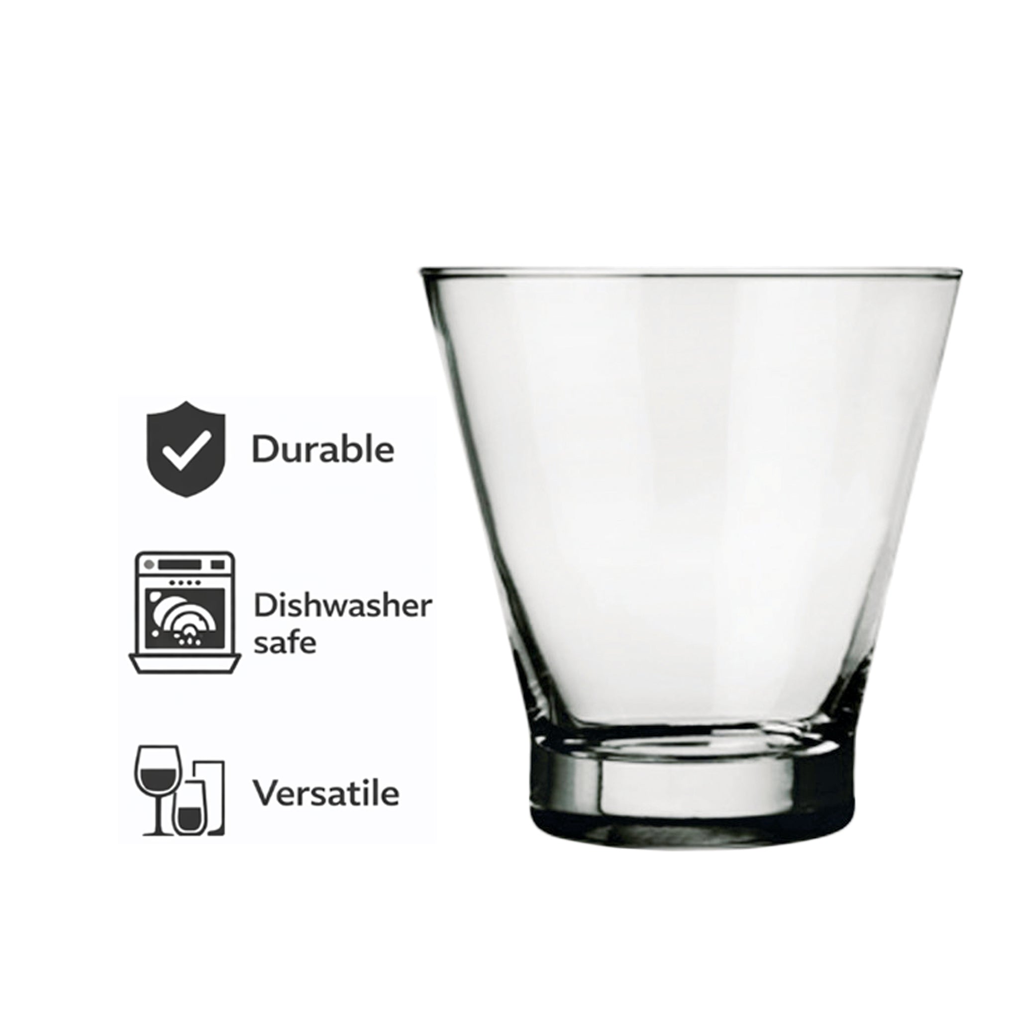 The CONSOL Seville Whiskey Tumbler 4 pack features sturdy glass construction with a 350ml capacity, designed to enhance the whiskey drinking experience. The thick base provides stability and a comfortable grip, while the clear glass showcases the rich color of your spirit. Perfect for both casual and formal settings, this set offers durability and style, making it perfect for serving whiskey, cocktails, or other beverages with sophistication. Perfect for home bars, restaurants, or entertaining guests, these tumblers combine functionality with elegant presentation.