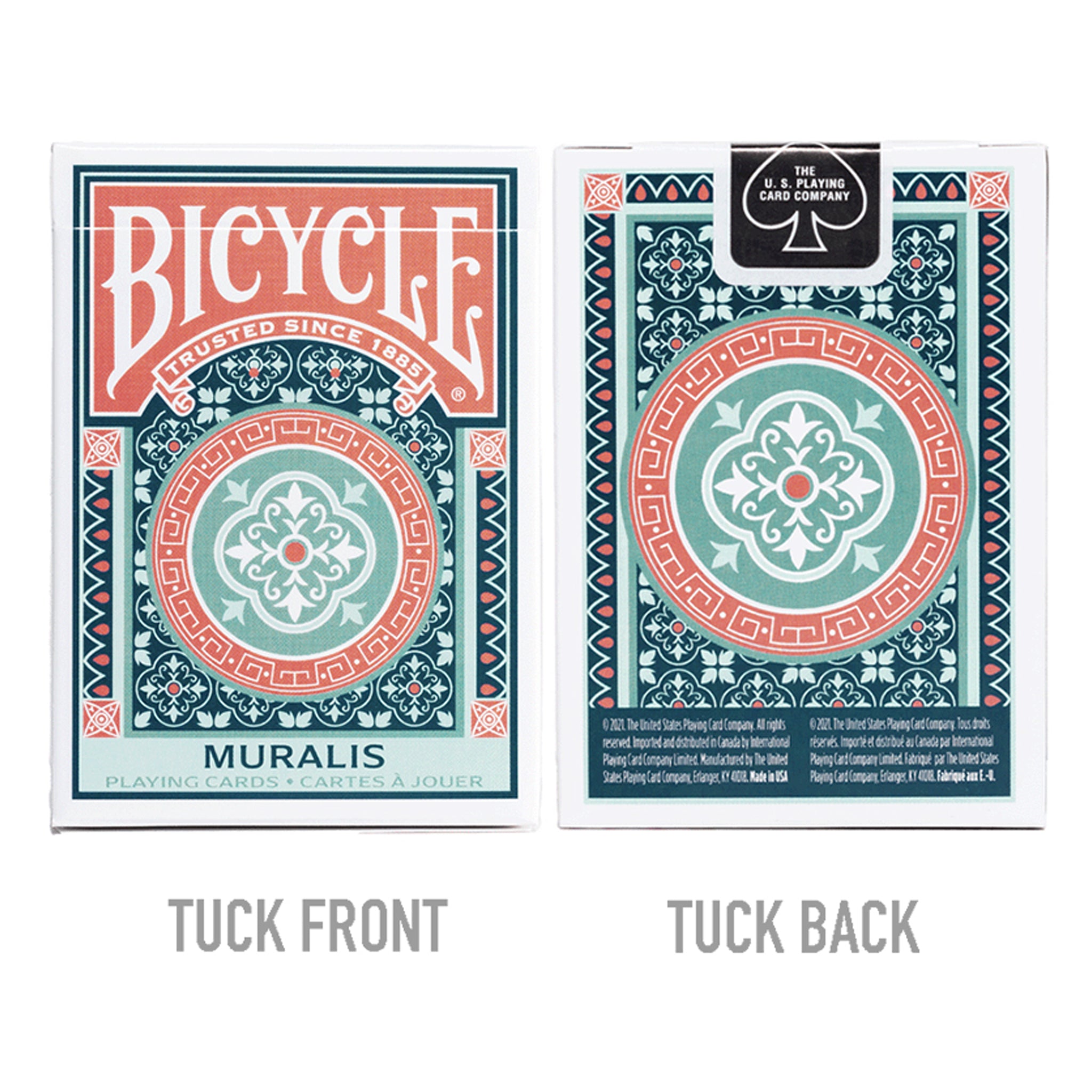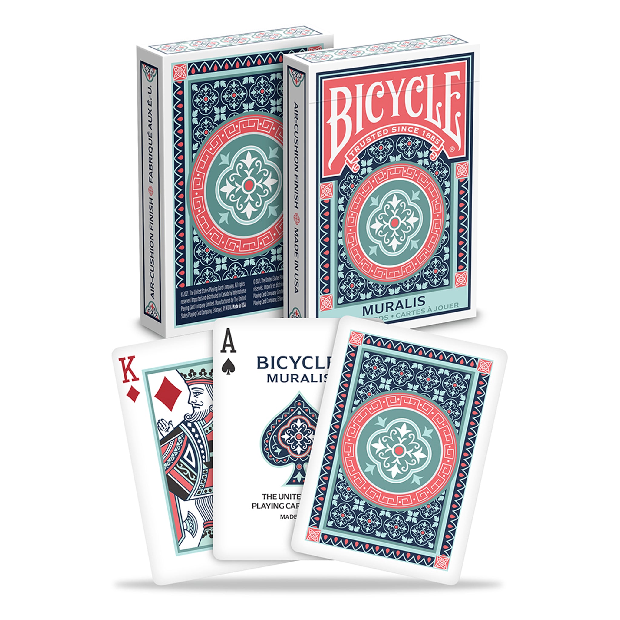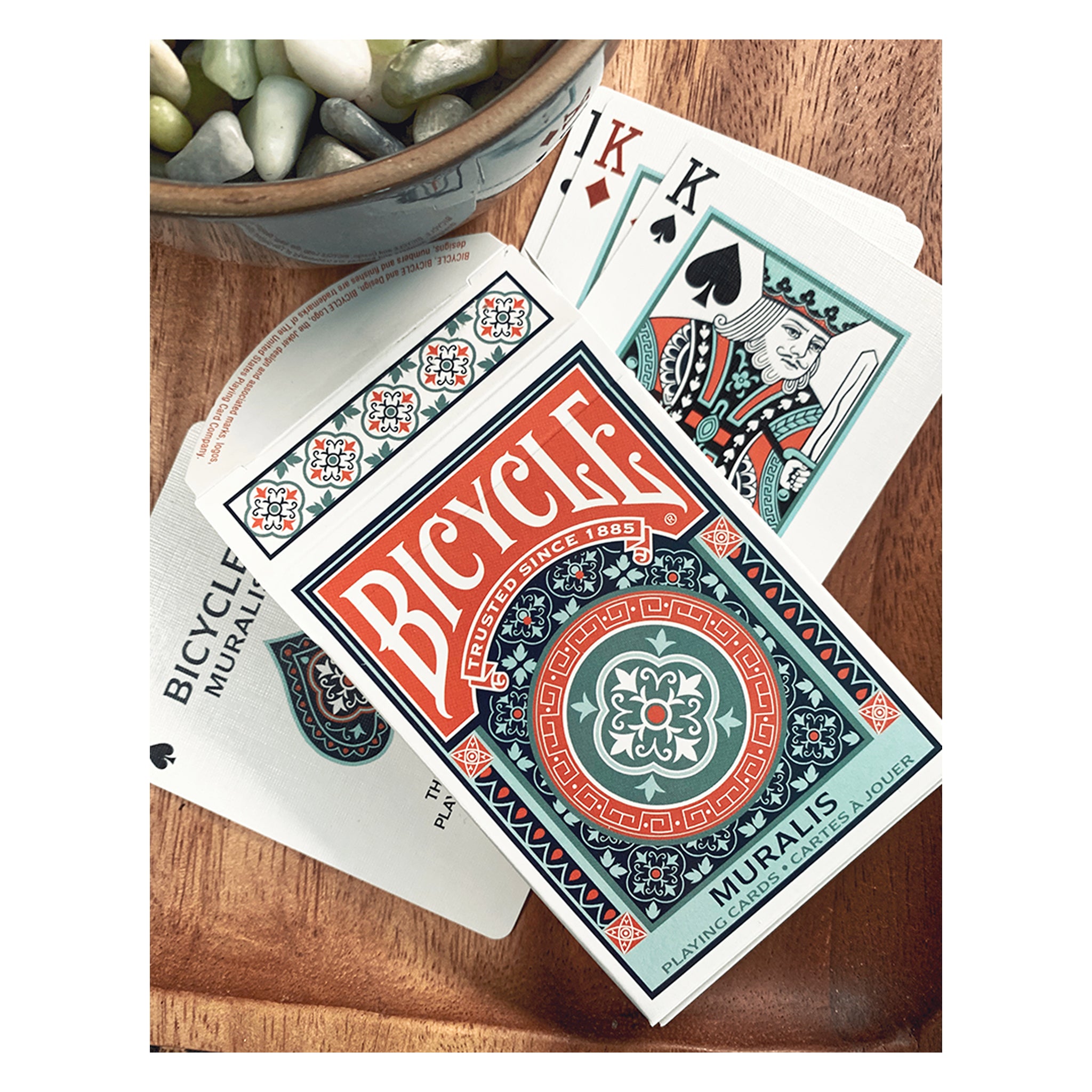 Muralis from Bicycle Playing Cards is a premium playing card deck inspired by the beautiful tile work found in Mediterranean countries. The colors used throughout the deck include a terracotta, that represents the color of the roofs of many of the homes in the Greek Isles combined with sea-inspired blues and turquoises that represents the crystal blue waters of the Mediterranean sea. The colors on the tuck case and the card back are also used throughout the card faces for a cohesive and high-end design. The Mediterranean tile trend is popular in home décor, making Muralis the perfect deck for both casual card play and display on a coffee table or shelf when not in use.