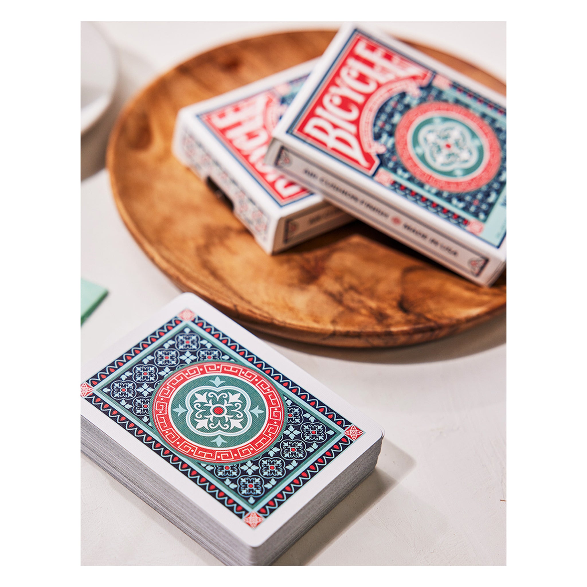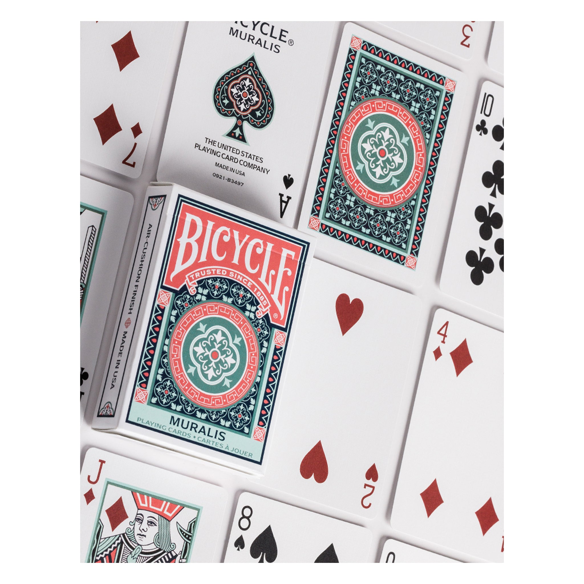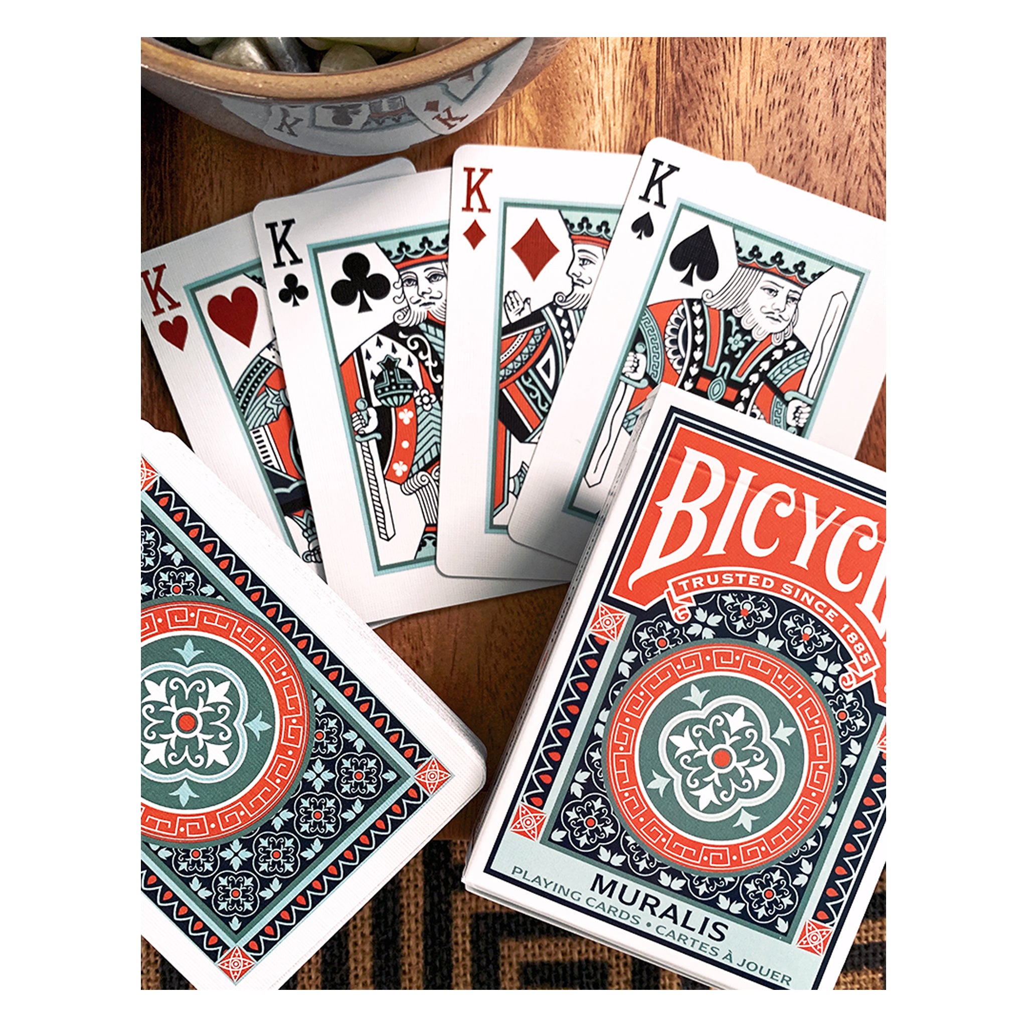 Muralis from Bicycle Playing Cards is a premium playing card deck inspired by the beautiful tile work found in Mediterranean countries. The colors used throughout the deck include a terracotta, that represents the color of the roofs of many of the homes in the Greek Isles combined with sea-inspired blues and turquoises that represents the crystal blue waters of the Mediterranean sea. The colors on the tuck case and the card back are also used throughout the card faces for a cohesive and high-end design. The Mediterranean tile trend is popular in home décor, making Muralis the perfect deck for both casual card play and display on a coffee table or shelf when not in use.