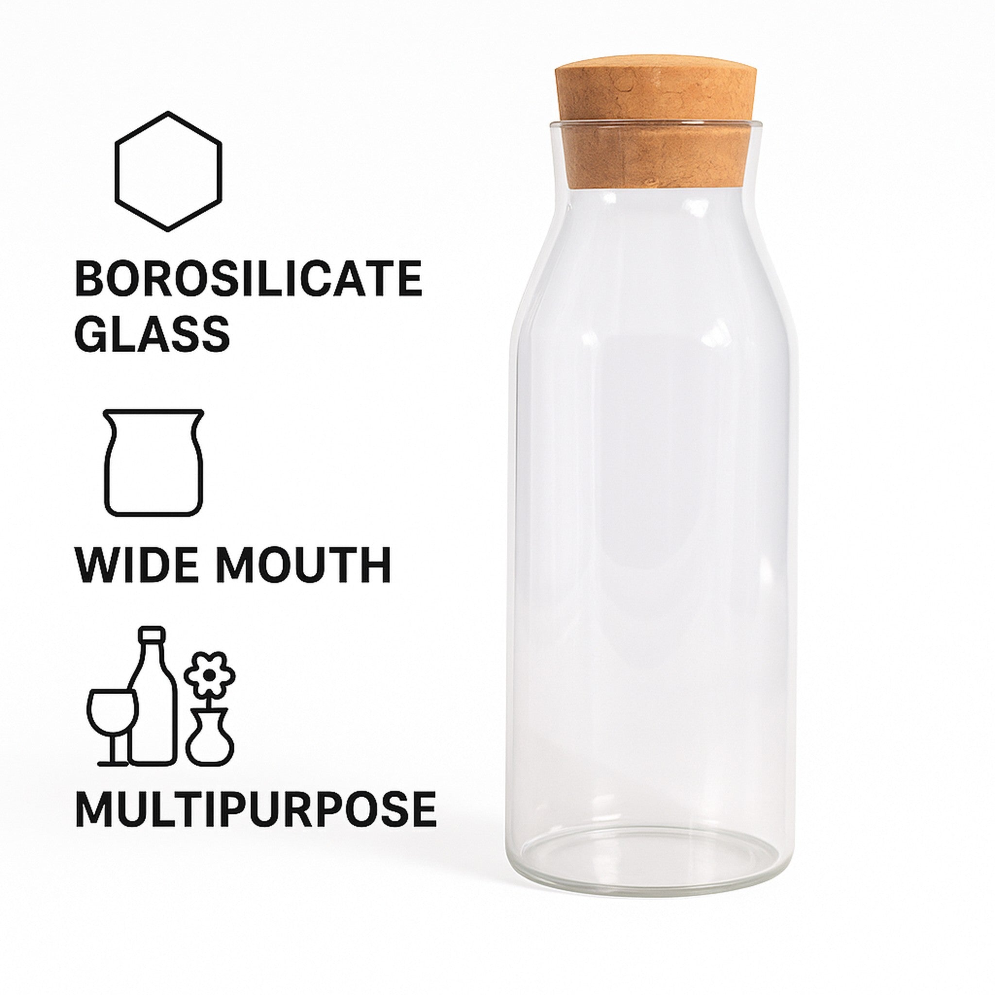 This glass carafe with a cork stopper can be used for many types of beverages from water, iced tea and fruit infused juices to decanting and serving wine.