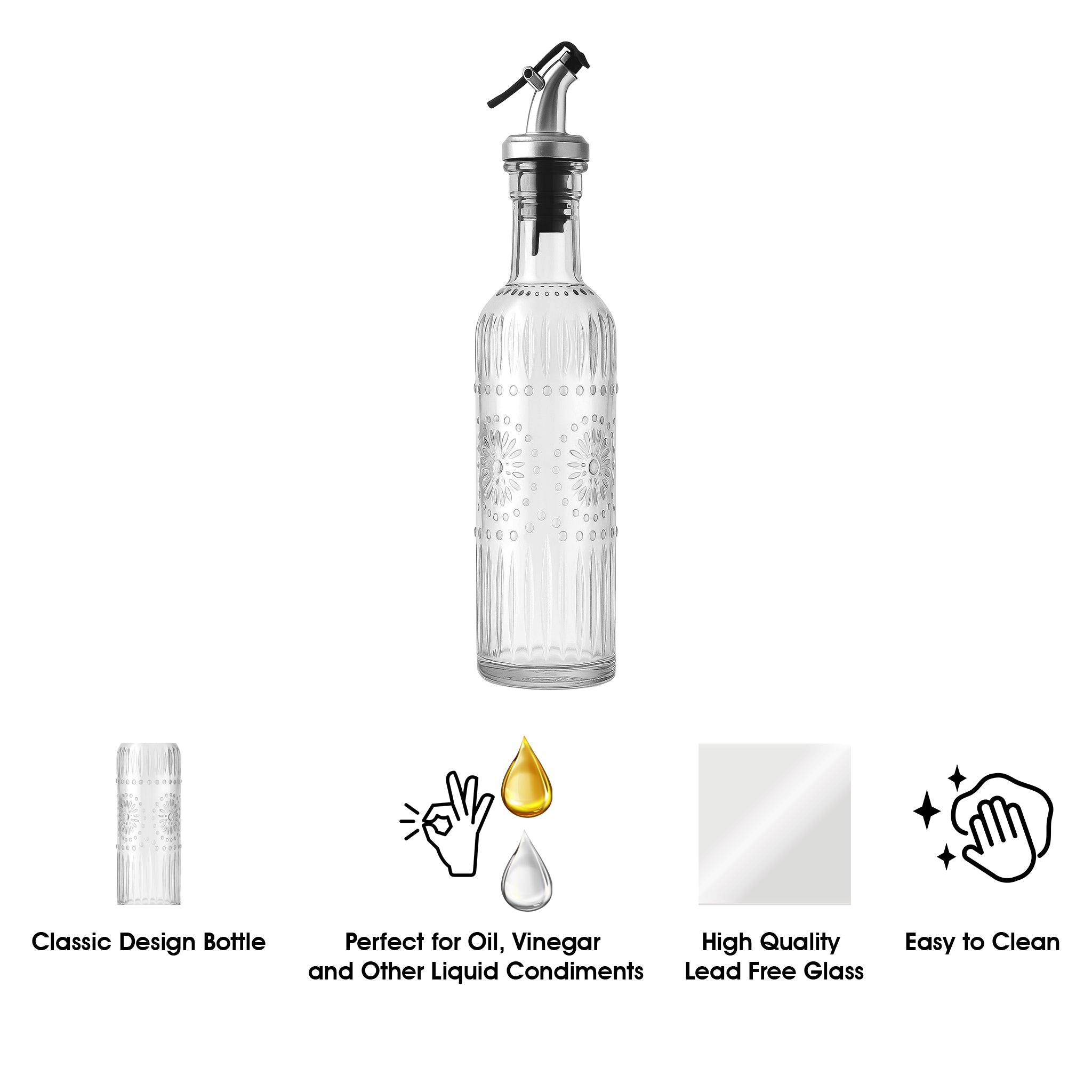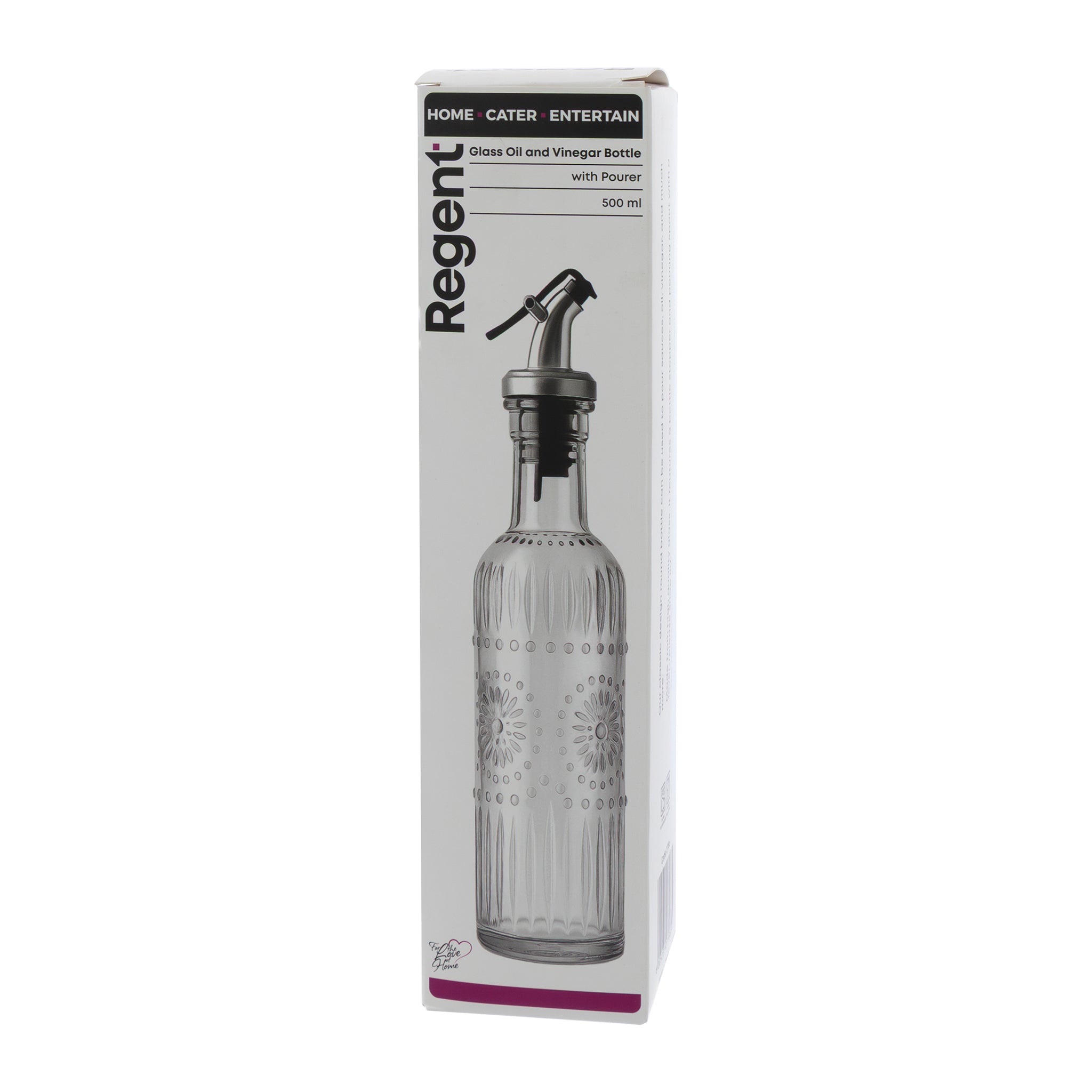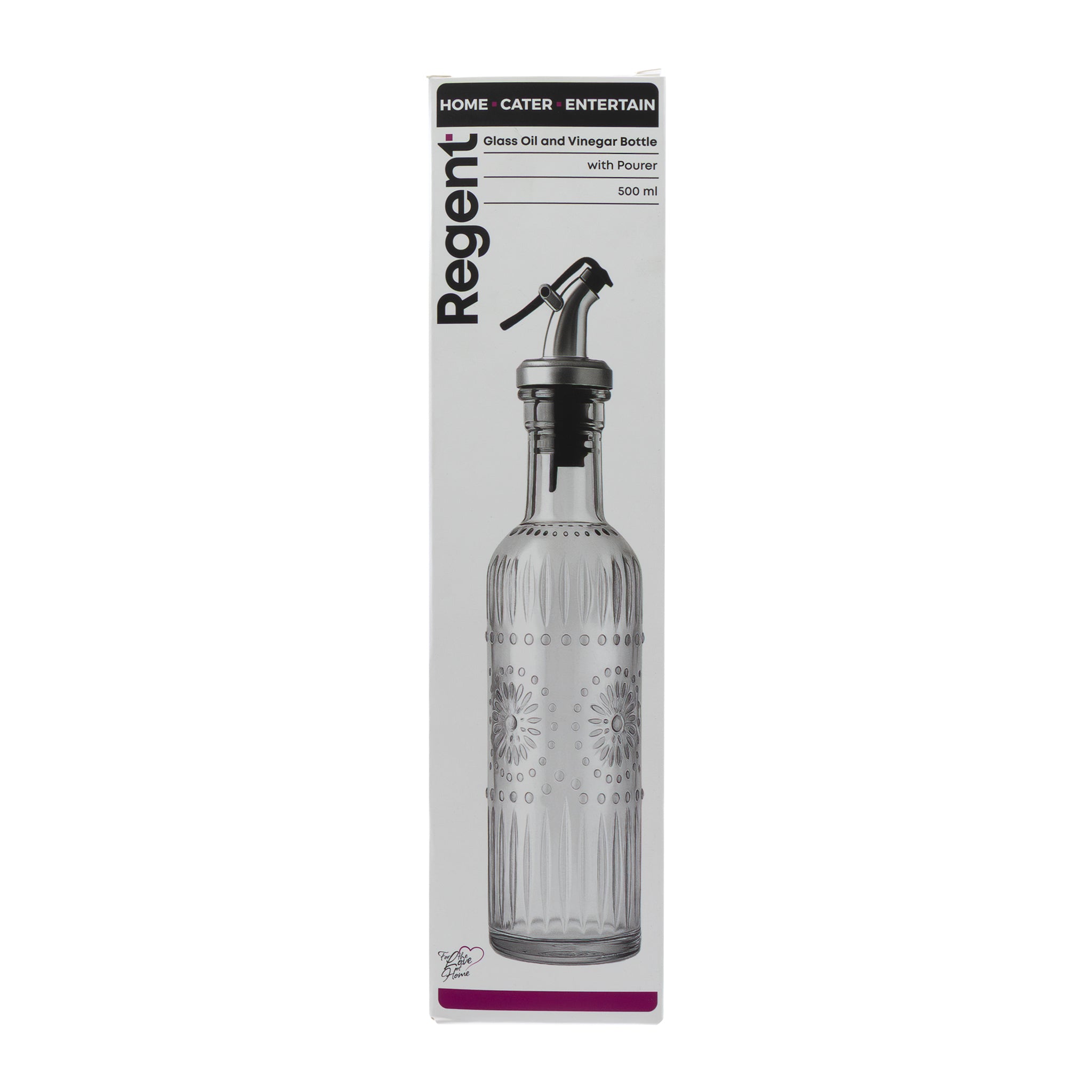 The Regent Glass Oil and Vinegar Bottle with Pourer, with a 500ml capacity, features a beautiful embossed design on the glass that adds a touch of elegance to your kitchen. Made from high-quality glass, it preserves the freshness and flavor of your oils and vinegars while allowing you to easily see the contents. The precise pourer ensures smooth, drip-free dispensing, making it ideal for cooking, dressing salads, or finishing dishes with style and control. This bottle combines practicality with refined aesthetics for a superior culinary experience.
